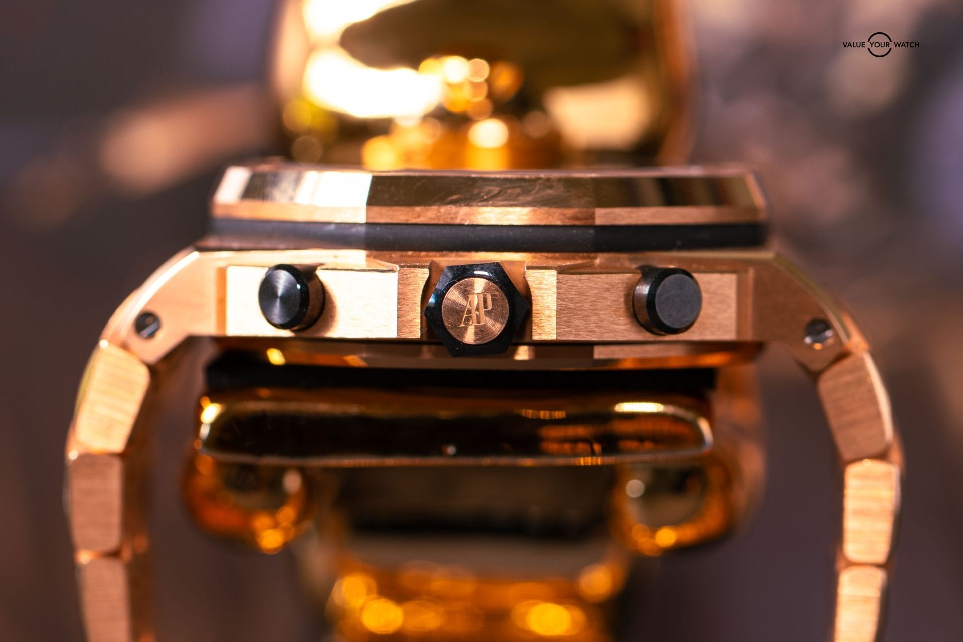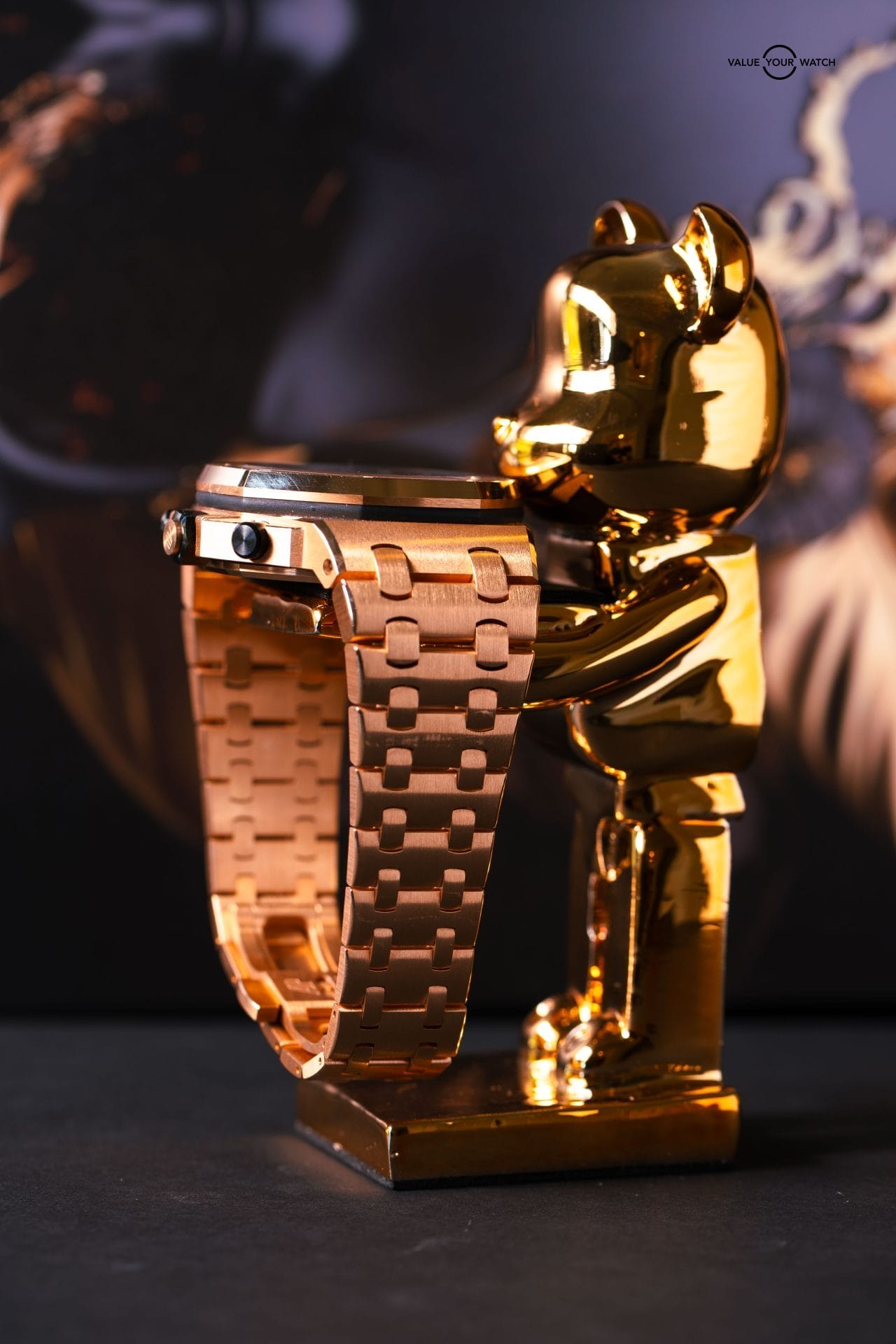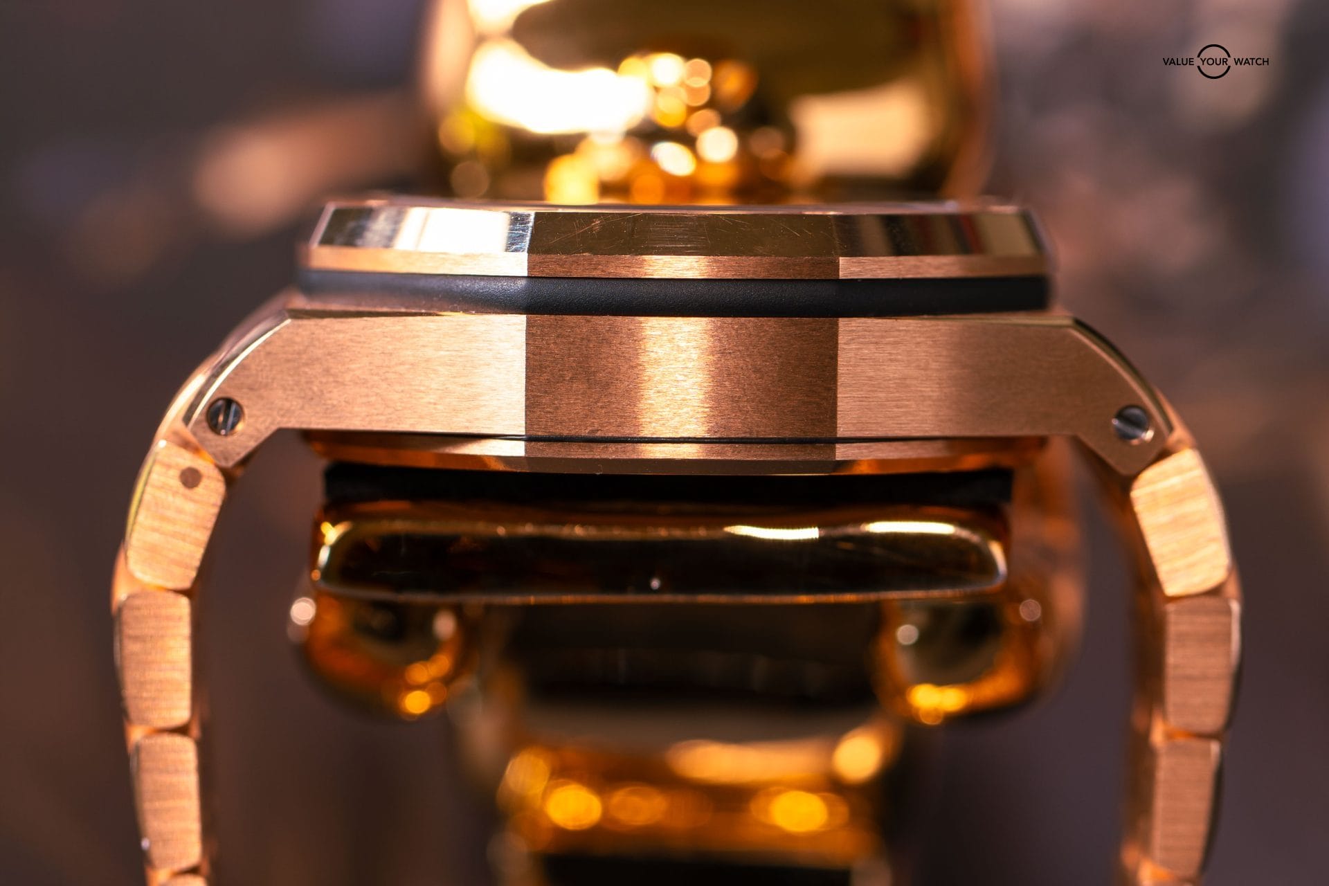 The solid gold bracelet, often referred to as “full brick”. Elevates this piece into a true heavyweight luxury statement, offering both exclusivity and collector appeal. Powered by Audemars Piguet’s automatic chronograph movement, it delivers precision performance with refined finishing expected from the brand.