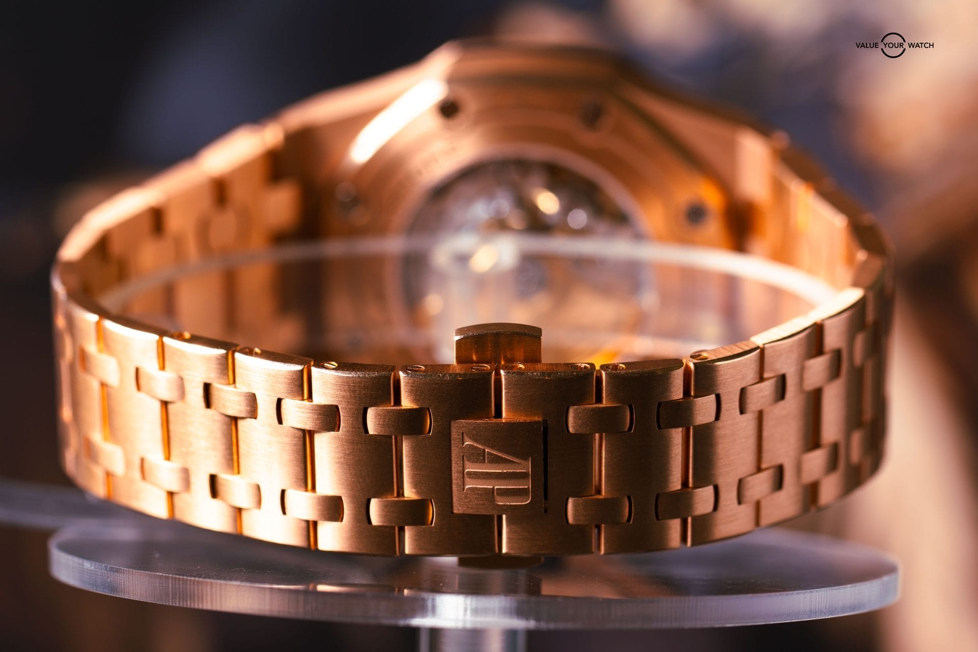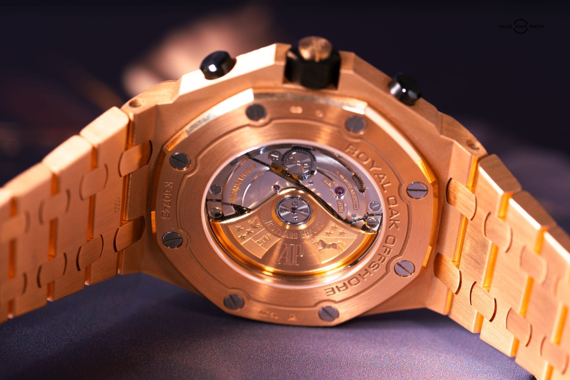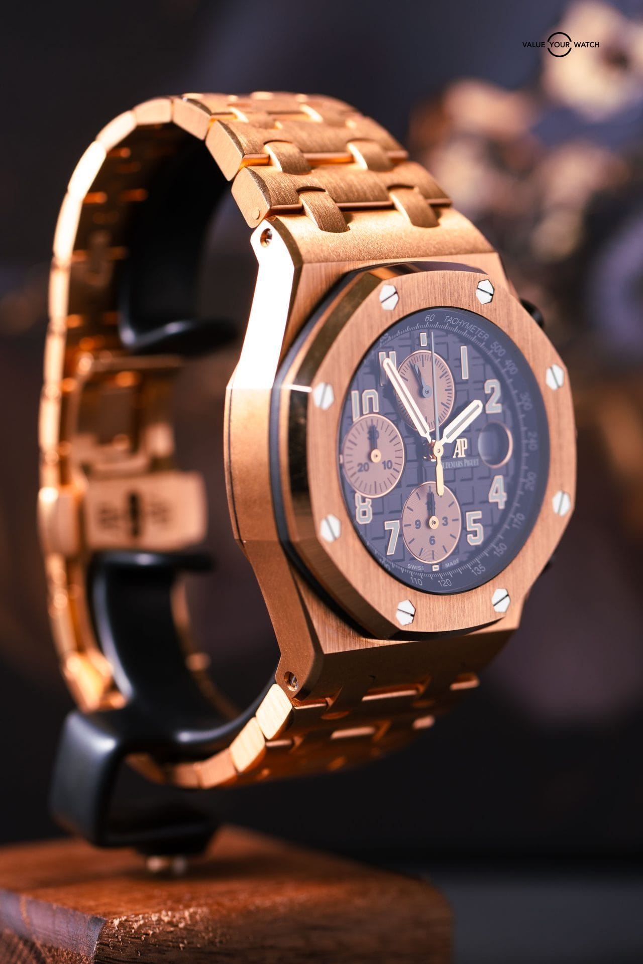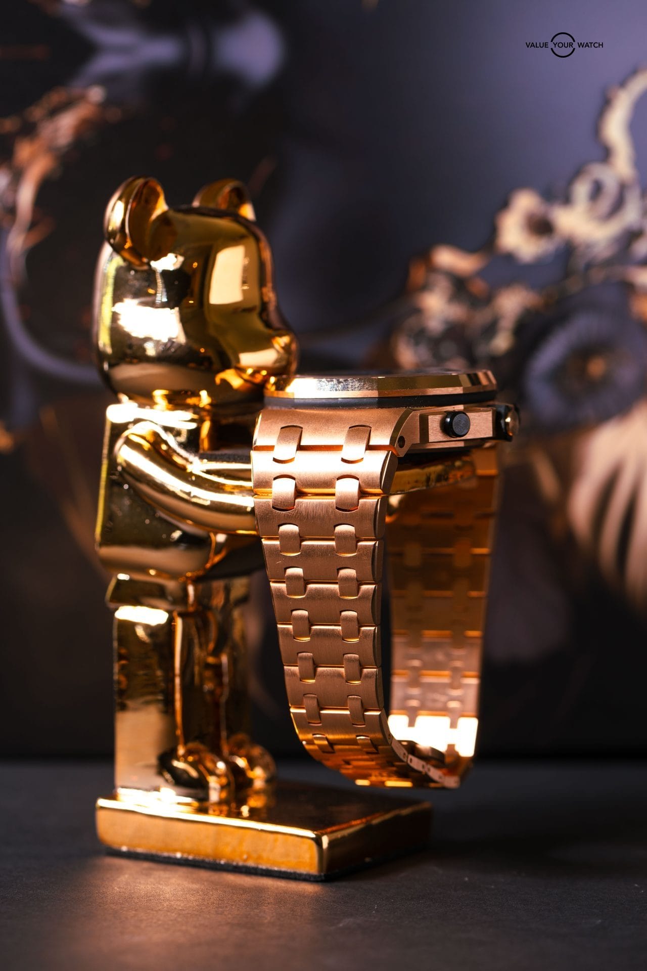 The solid gold bracelet, often referred to as “full brick”. Elevates this piece into a true heavyweight luxury statement, offering both exclusivity and collector appeal. Powered by Audemars Piguet’s automatic chronograph movement, it delivers precision performance with refined finishing expected from the brand.