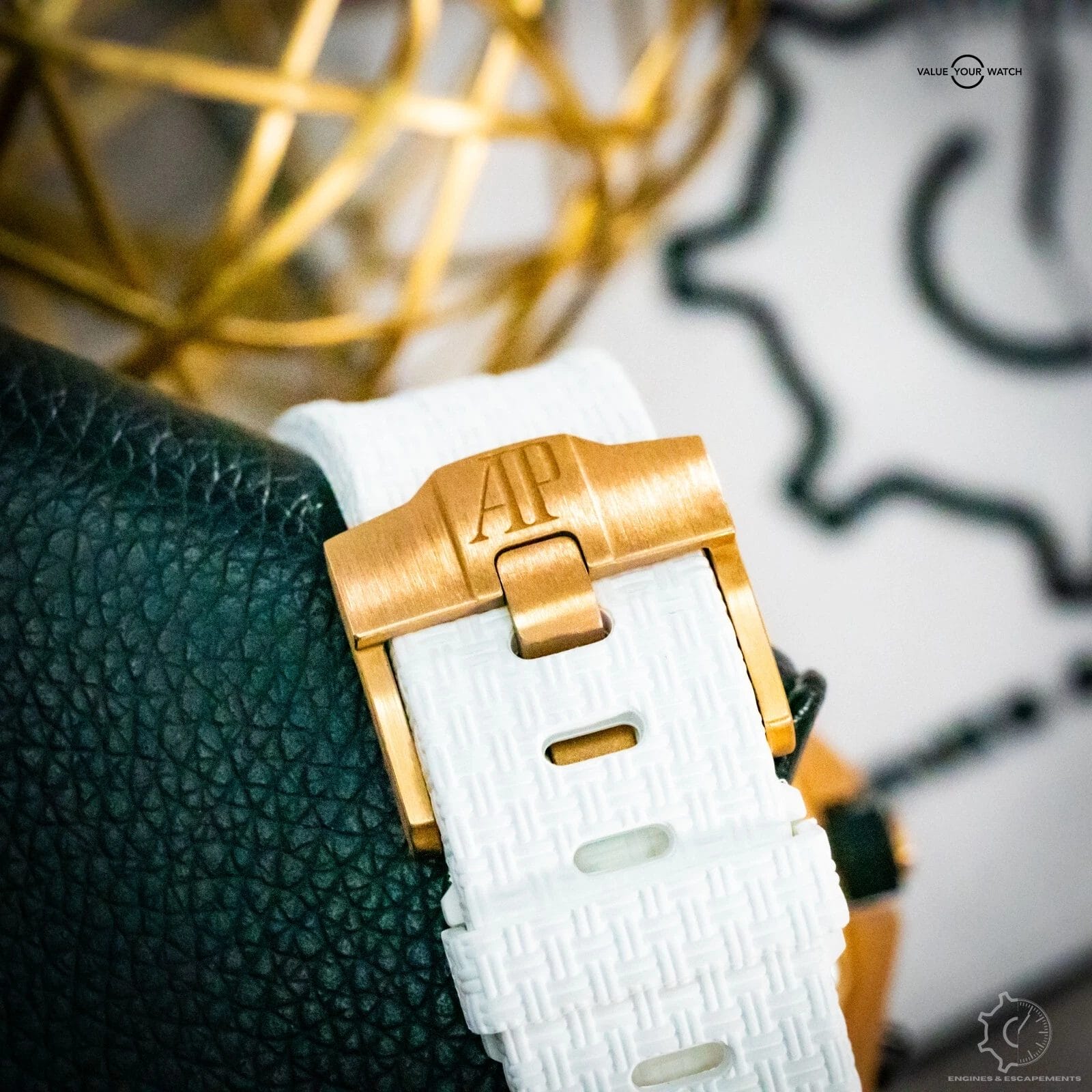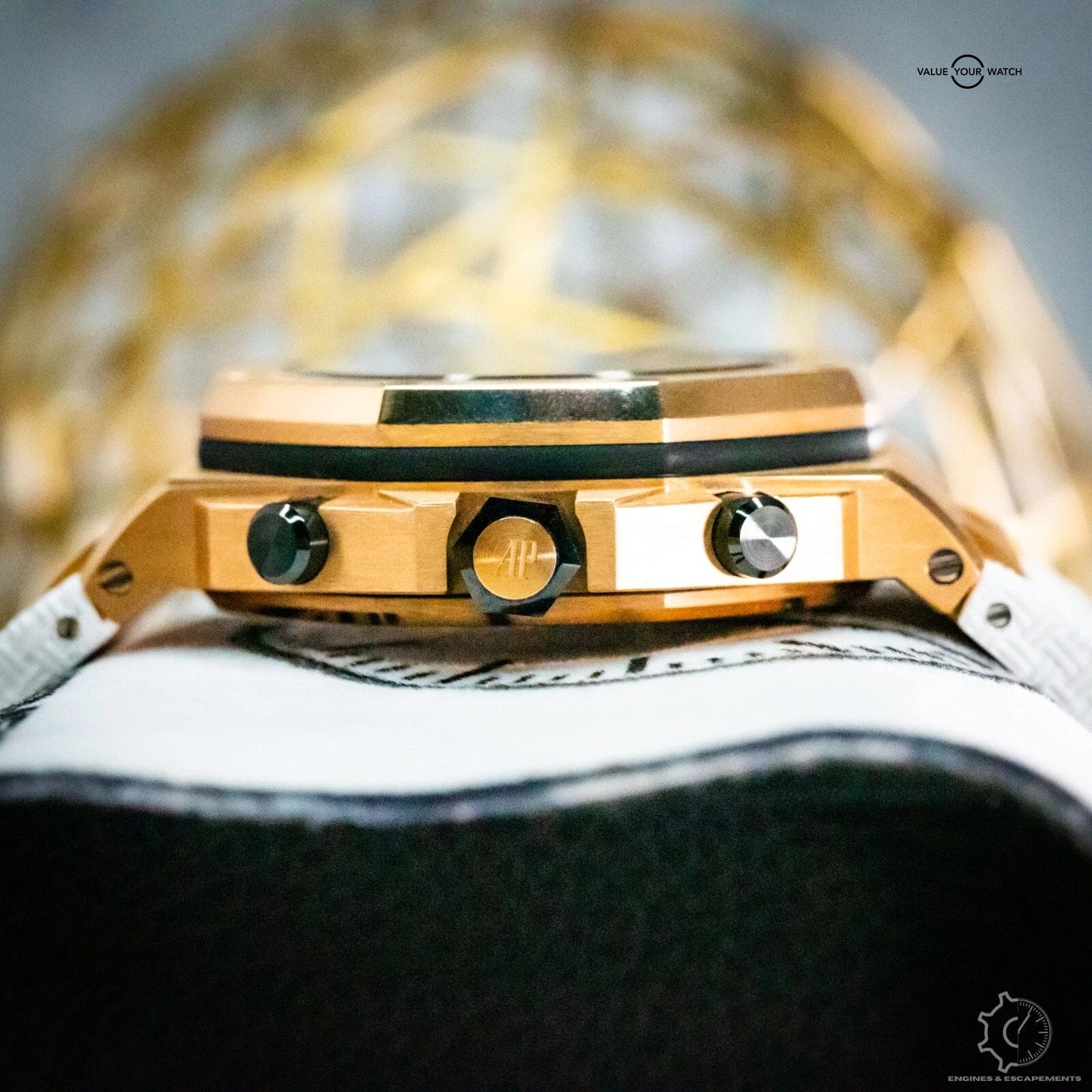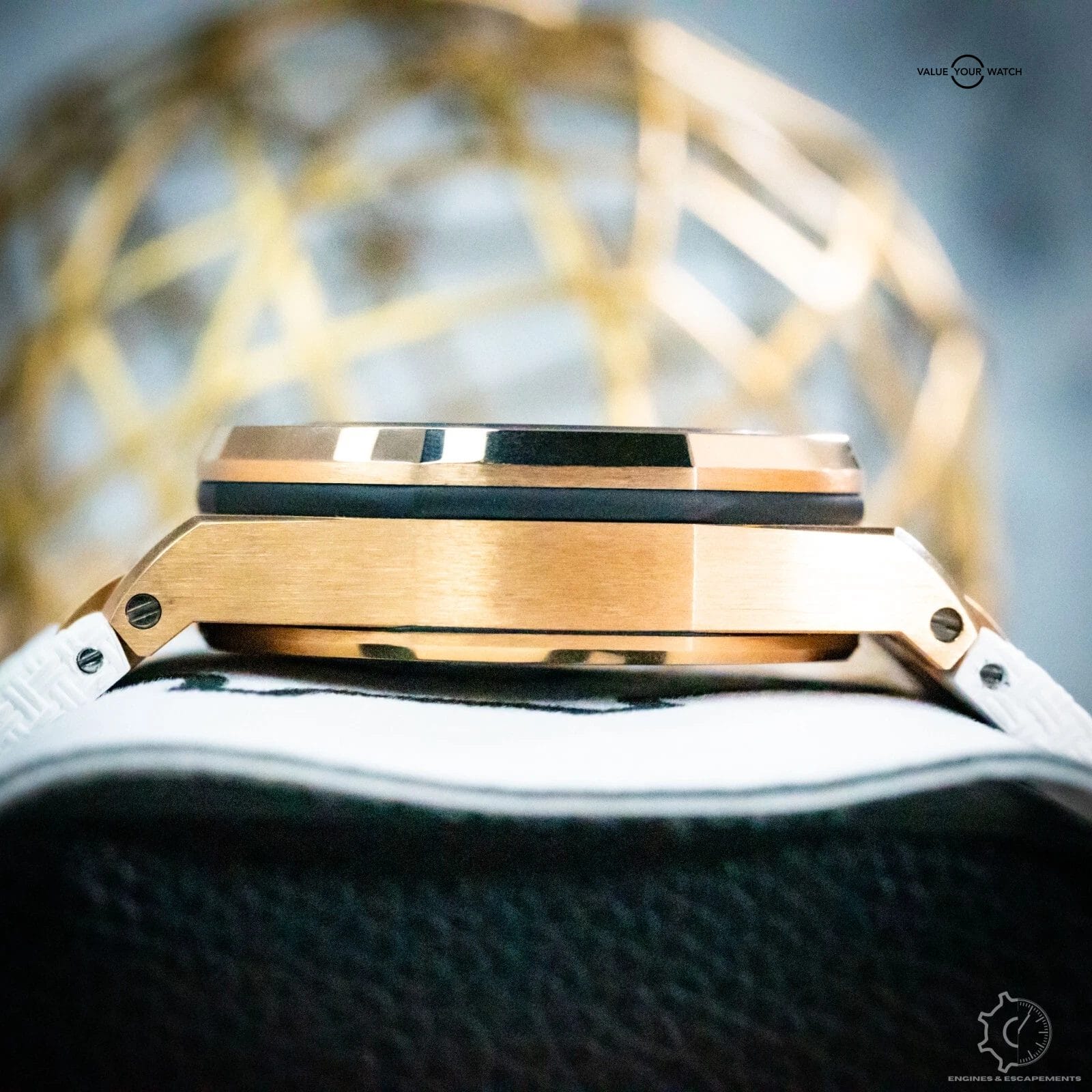 This piece doesn’t just stand out—it defines the room. The rose gold bezel, crown guards & black ceramic pushers are flawlessly finished, reflecting AP’s unmatched attention to detail. Beneath the surface, the automatic chronograph movement powers the watch with precision and authority.
