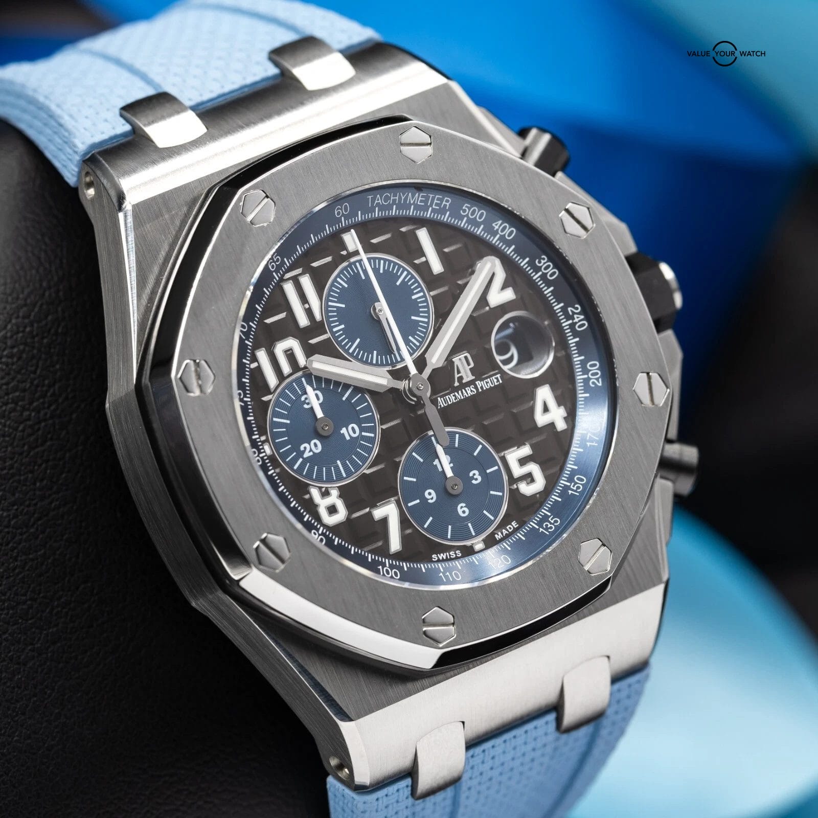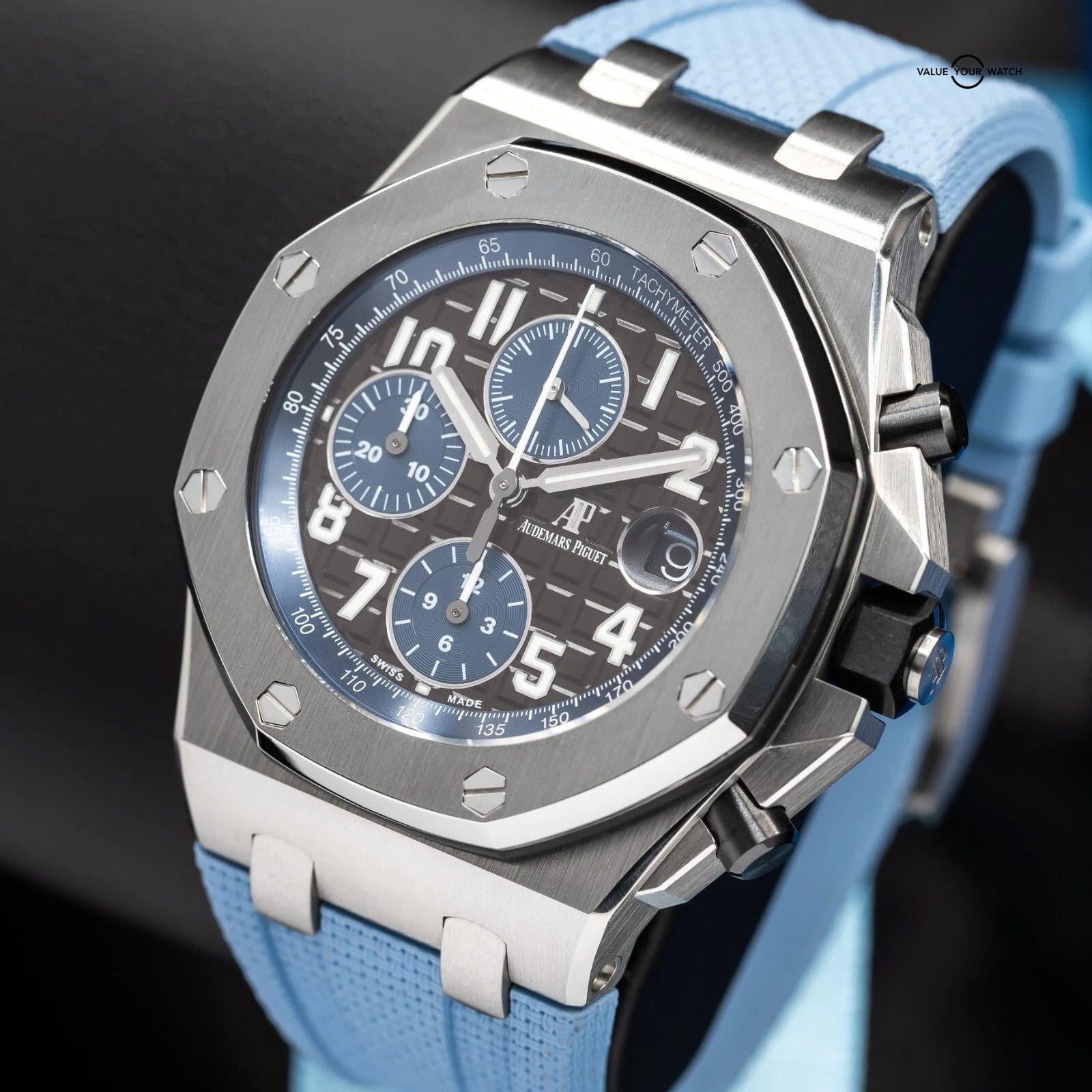 Nicknamed “The Batman” for its stealthy black-and-blue color scheme, this Audemars Piguet Royal Oak Offshore Chronograph 26470ST is a bold, rugged, and unmistakable timepiece. With its imposing 42mm stainless steel case, dramatic Méga Tapisserie dial, and muscular black ceramic crown and pushers, this Offshore delivers iconic design with serious wrist presence. Also features the new Audemars Piguet’s updated Quick Change strap system ($2600 cost) and comes fitted with a new and unworn AP rubber strap for enhanced comfort, versatility, and everyday wearability.