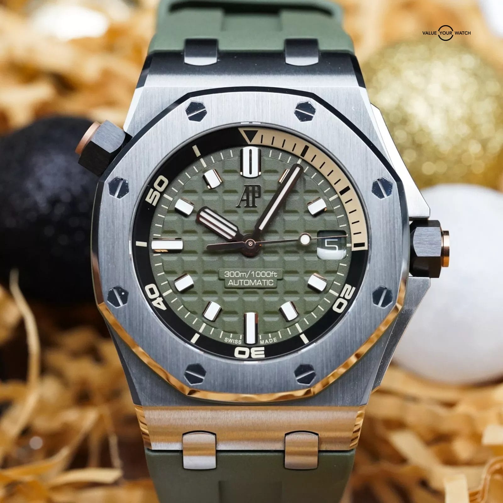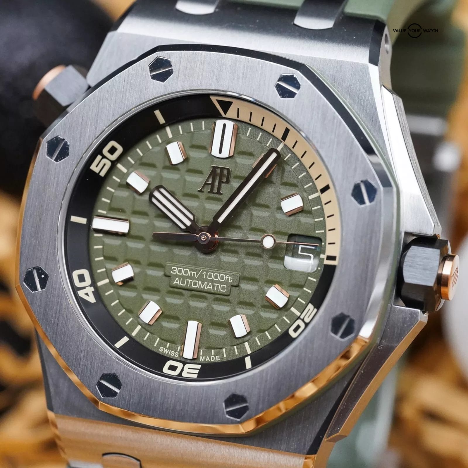 The new generation AP Diver in the intoxicating olive-green combo. This colorway has become a staple in men’s styling, and best yet, it is the only real element of color you’ll need to complement a standard, neutral tone outfit. Jeans and a black t-shirt to the office… anyone? Concur.