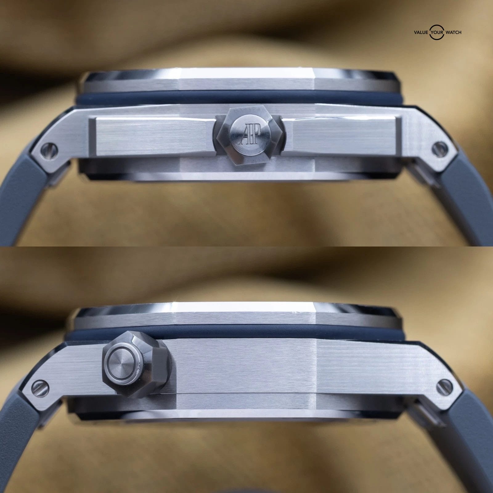 Included are full box and papers including the warranty card from 2022, so under warranty until 2027. The case, crystal and buckle are in outstanding condition. Watch is in complete working order and keeping great time, as you’d expect from the house of AP.