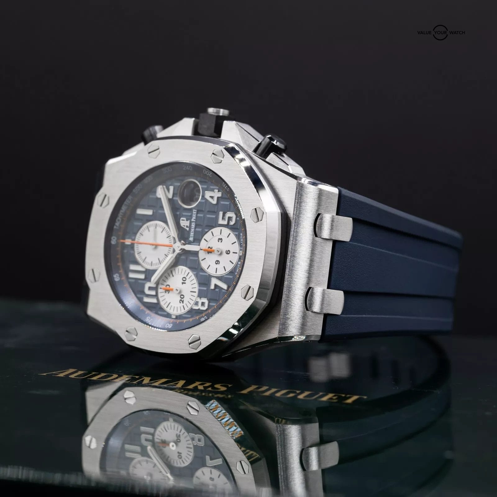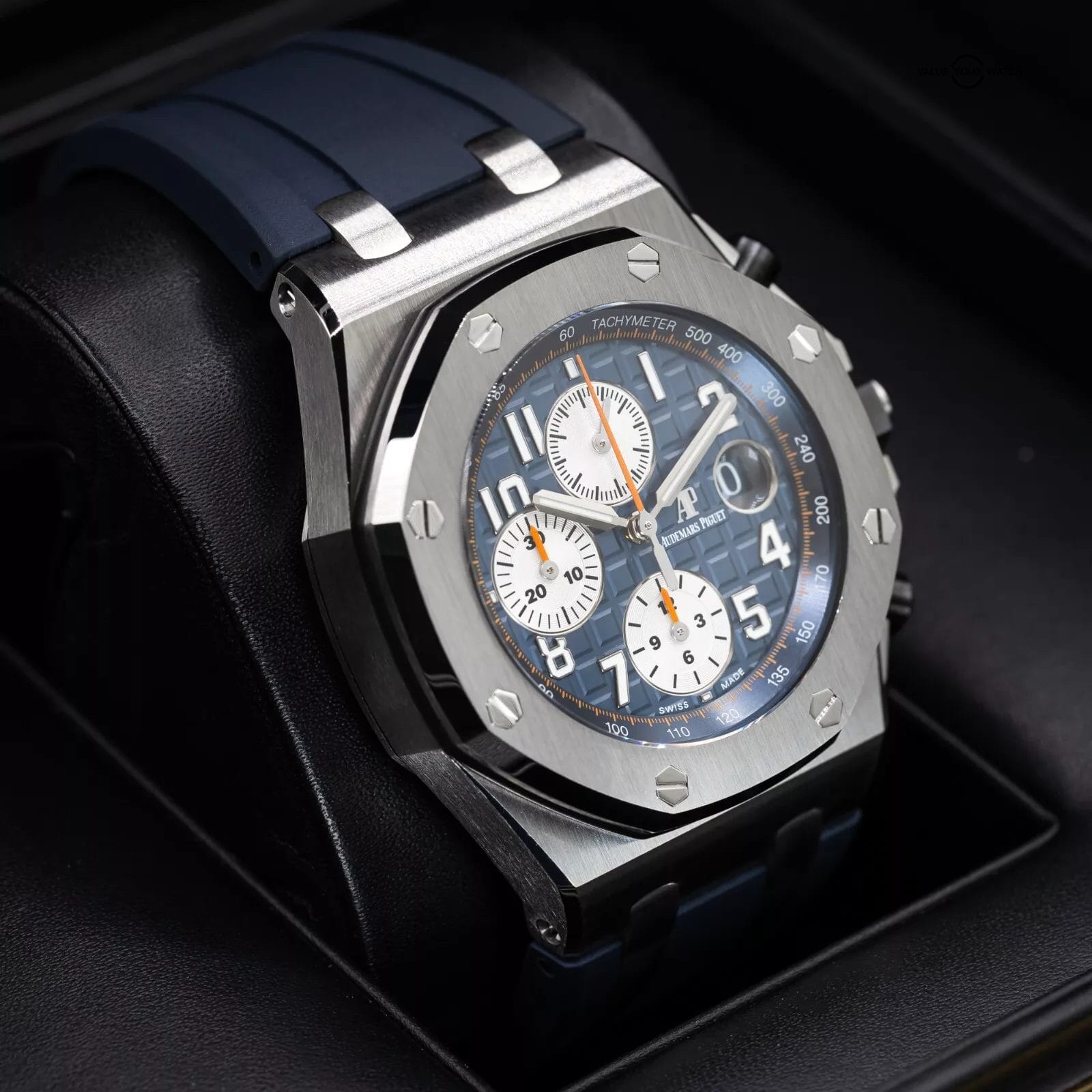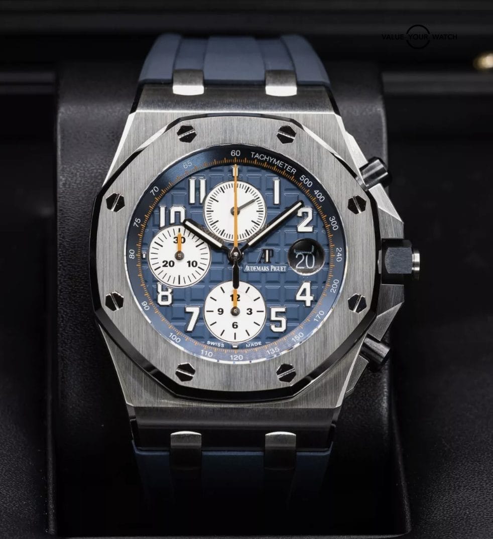 Up for sale here is an excellent example of one of the better AP Offshore variants. The blue is a very nice hue, and with the “reverse panda” look of the silver sub dials, the overall theme of the watch is incredibly well put together. Ref. 26470ST.