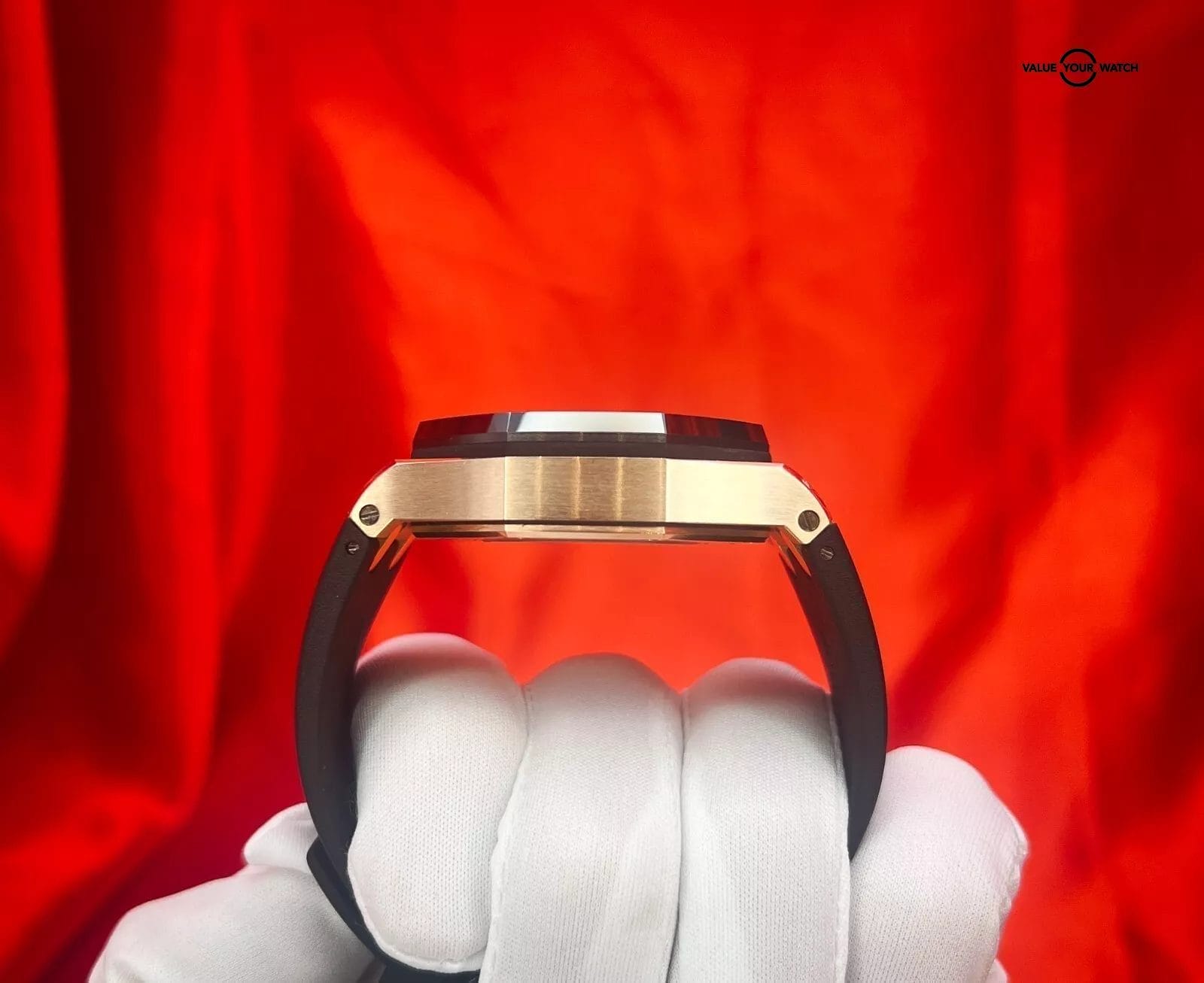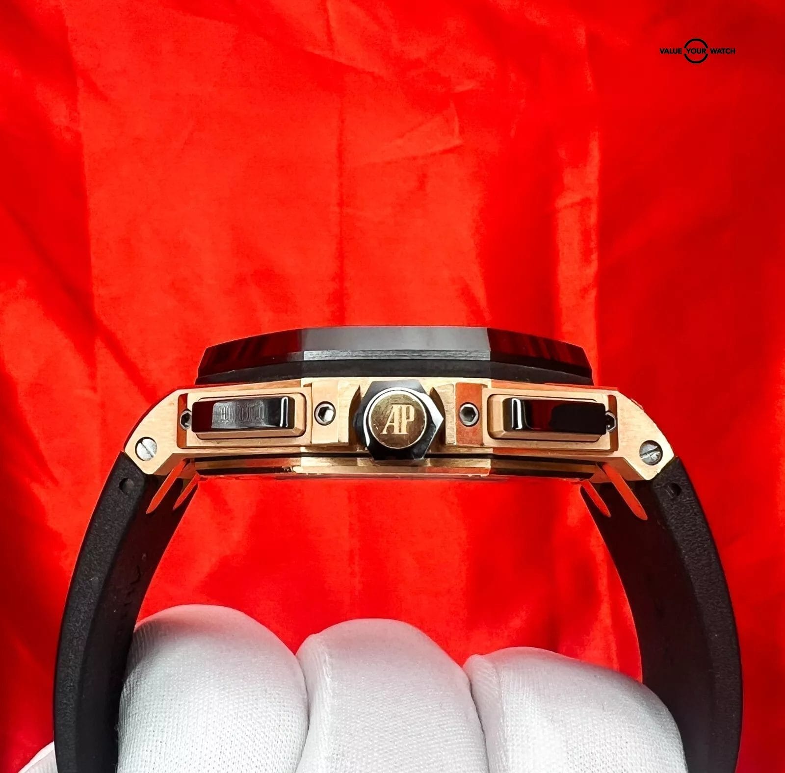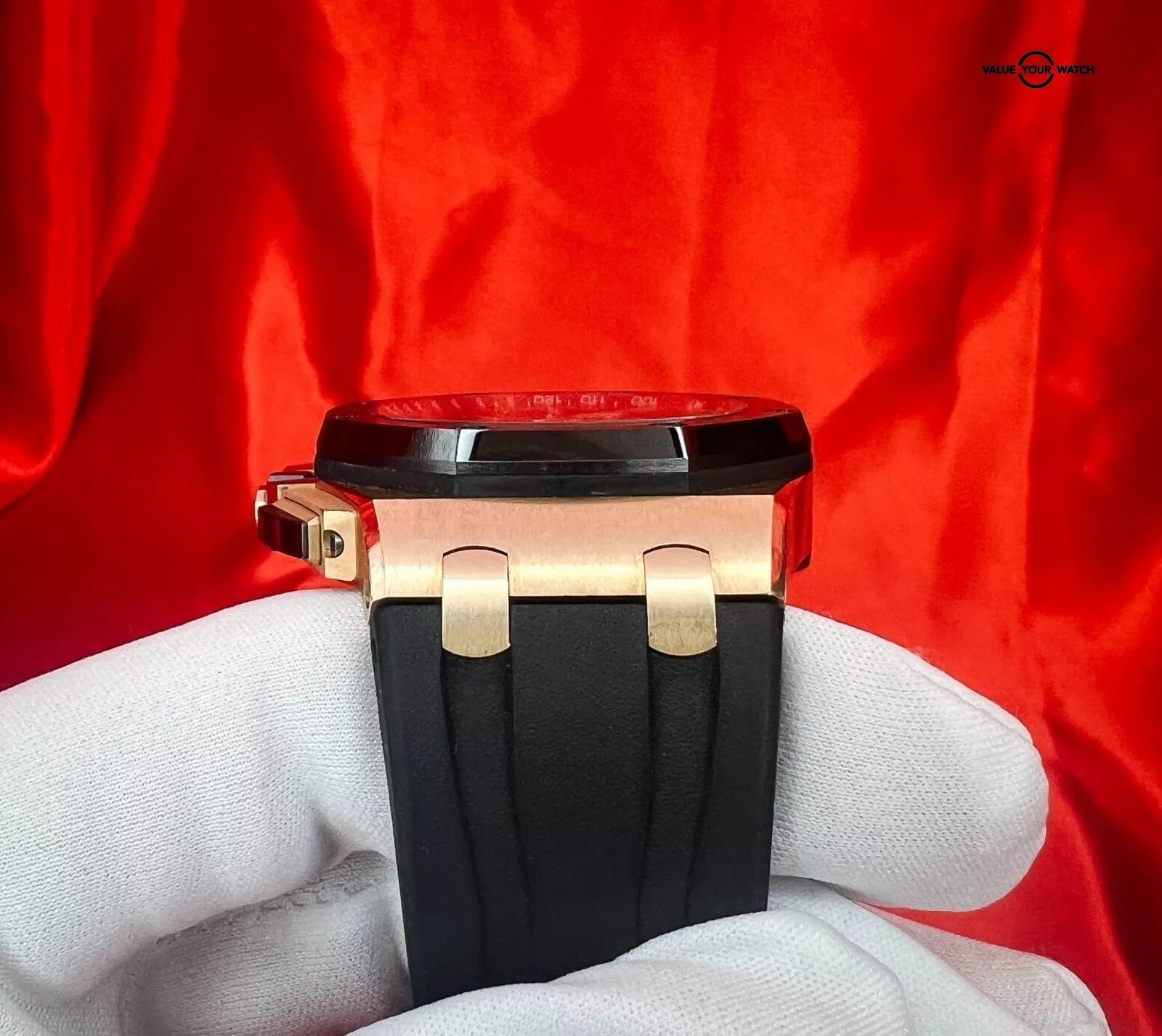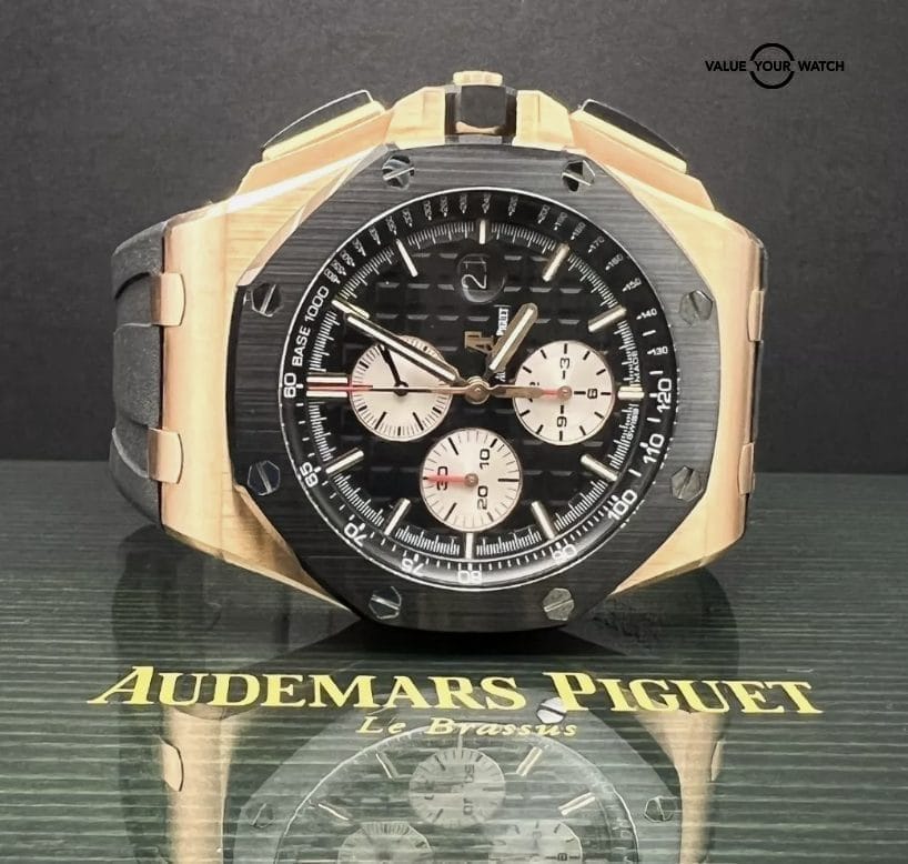 Elegant, Classy, Sporty, and Beautiful all in the same watch !! The Audemars Piguet Royal Oak Offshore Chronograph 26401RO stands out as a distinctive timepiece, effortlessly fusing luxury with precision and style. Housed within a 44mm rose gold case, this watch features a striking black ceramic bezel. Its black “Mega Tapisserie” dial showcases golden-rimmed white sub-dials and hour markers, contributing an exquisite touch. Watch is in excellent condition and is going to be an awesome addition to someone’s watch collection.