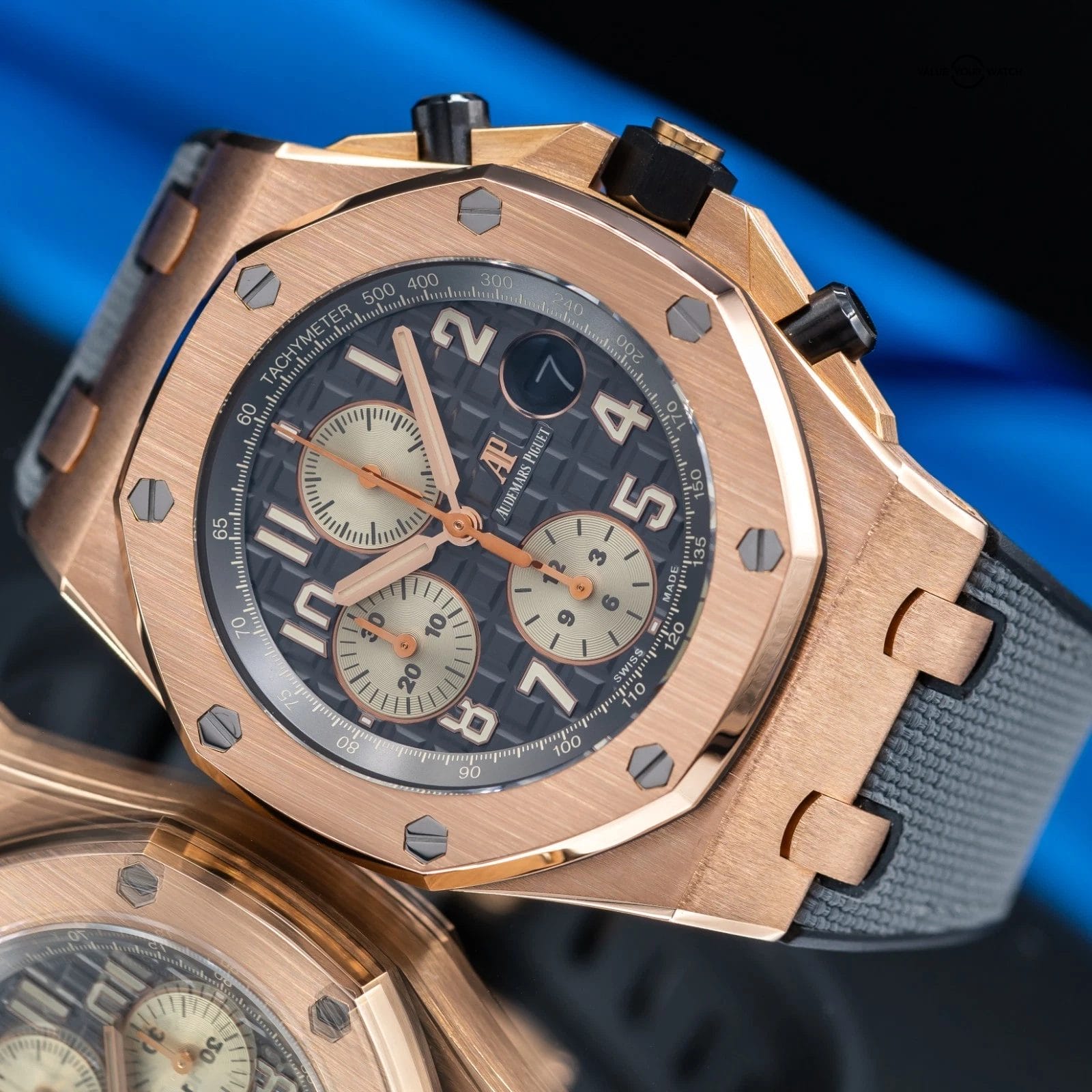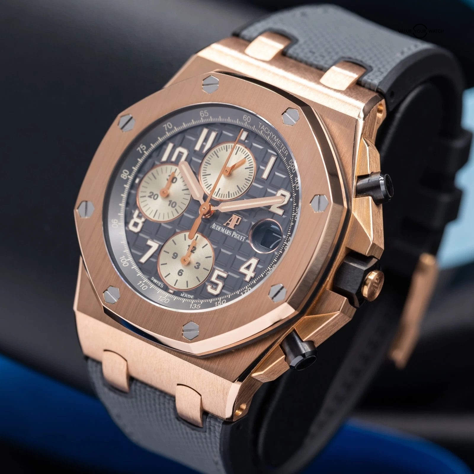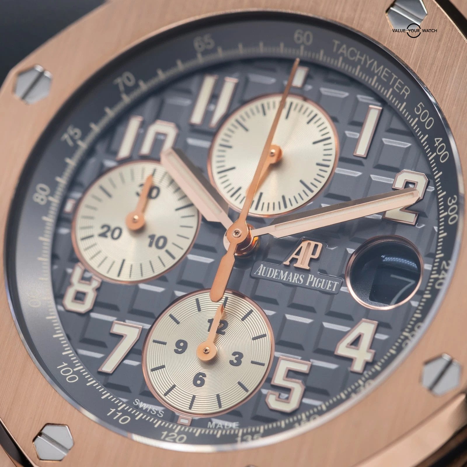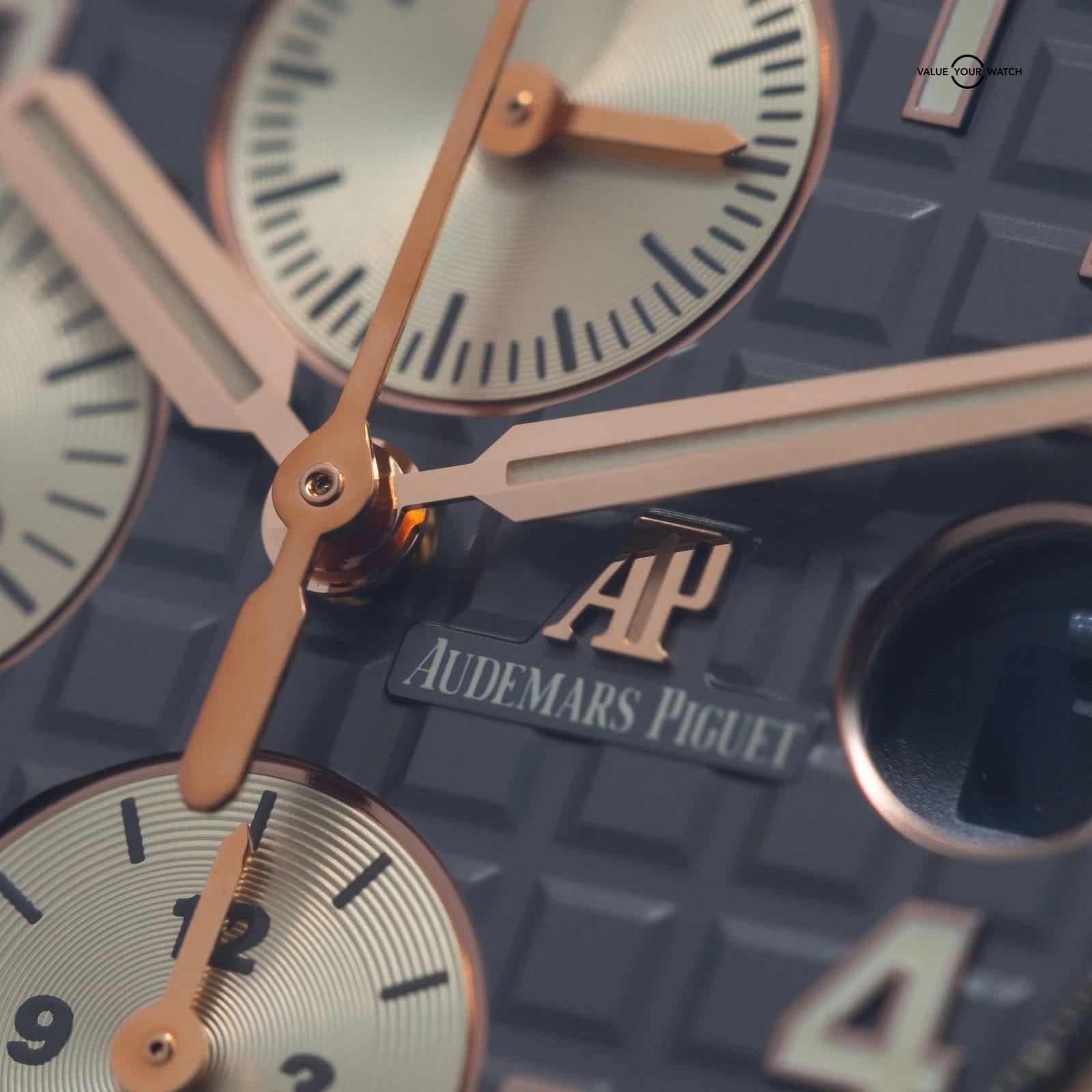 • Dial: Grey rhodium dial with “Méga Tapisserie” pattern, ivory-toned chronograph counters, rose gold Arabic numerals with beige luminescent coating, rose gold Royal Oak hands with beige luminescent coating, grey ruthenium-toned inner bezel