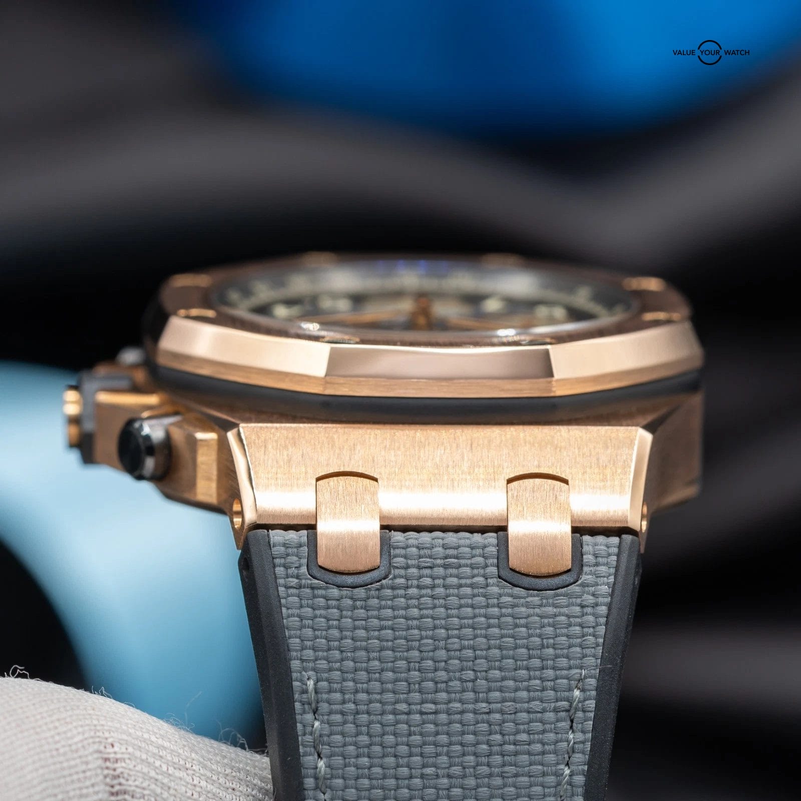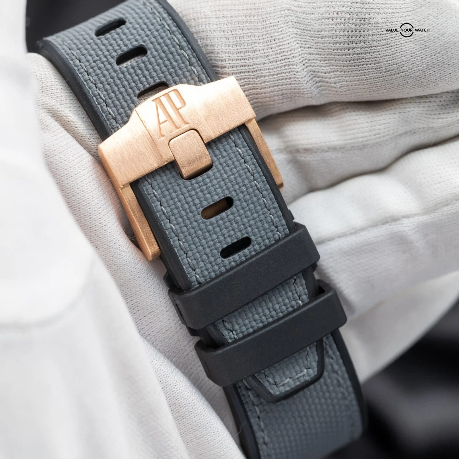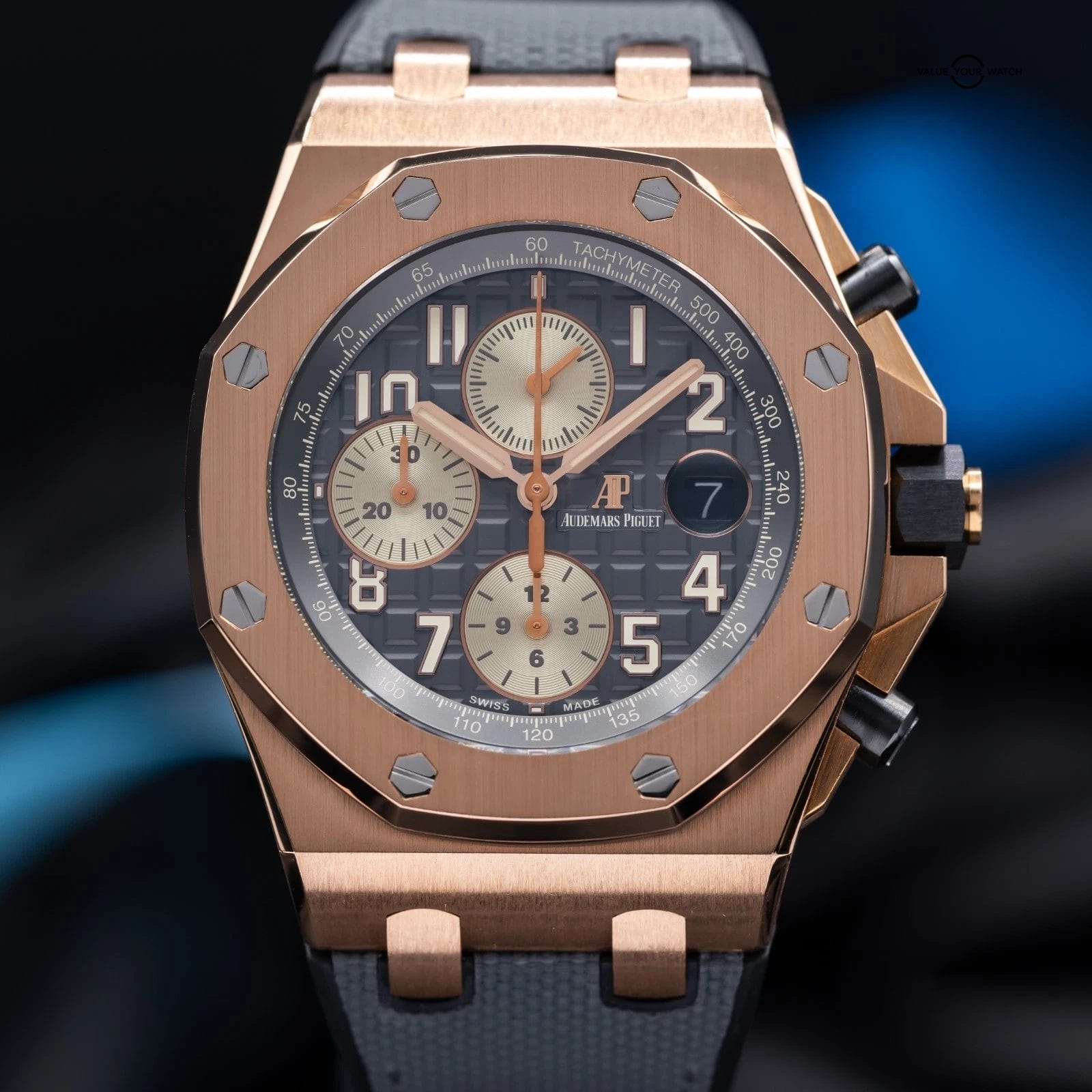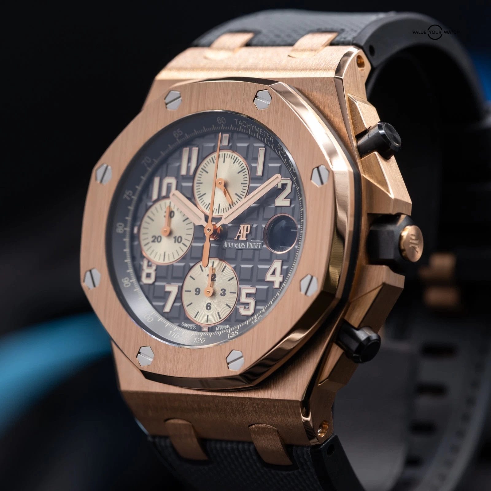 • Dial: Grey rhodium dial with “Méga Tapisserie” pattern, ivory-toned chronograph counters, rose gold Arabic numerals with beige luminescent coating, rose gold Royal Oak hands with beige luminescent coating, grey ruthenium-toned inner bezel