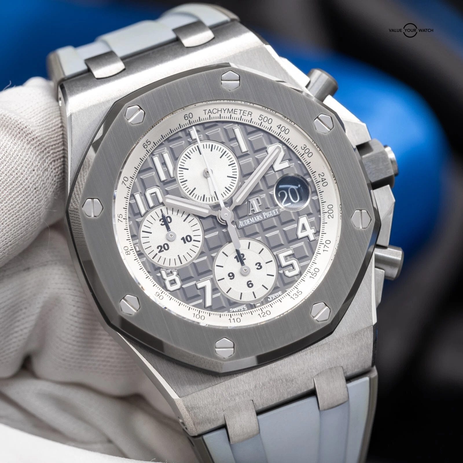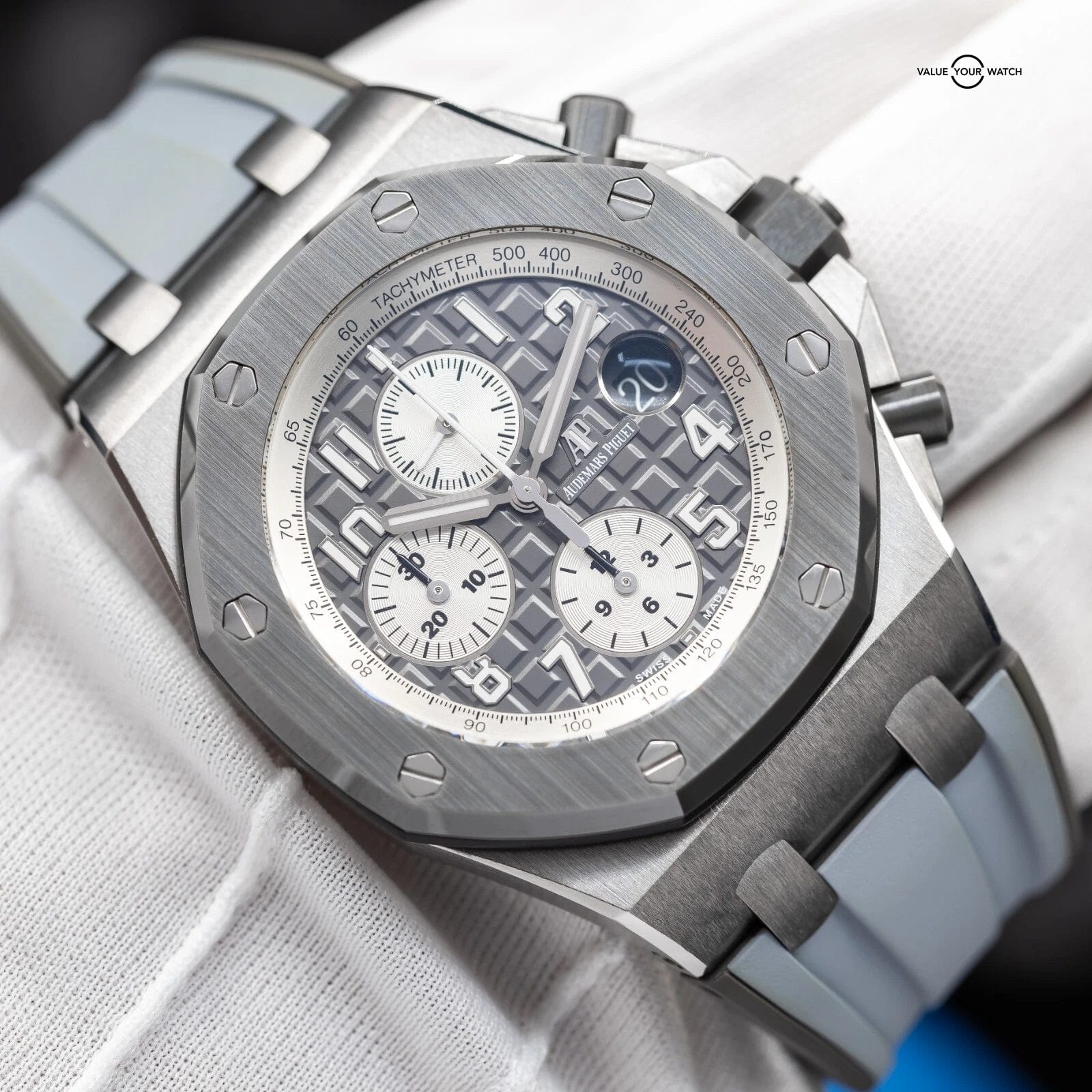 Stealthy, sleek, and seriously hard to find — the Titanium Royal Oak Offshore 26470IO.OO.A006CA.01, nicknamed “The Ghost,” is one of the most sought-after discontinued models in the Offshore lineup. Featuring a 42mm titanium case with a slate grey “Méga Tapisserie” dial and matching grey ceramic bezel, it delivers a uniquely muted presence with undeniable impact. Silver sub-dials and bold luminescent markers contrast beautifully against the monochromatic color palette, while the in-house Caliber 3126/3840 automatic chronograph movement powers it all with confidence. If you’re after a rugged and rare AP that whispers exclusivity rather than shouting, The Ghost is your watch.