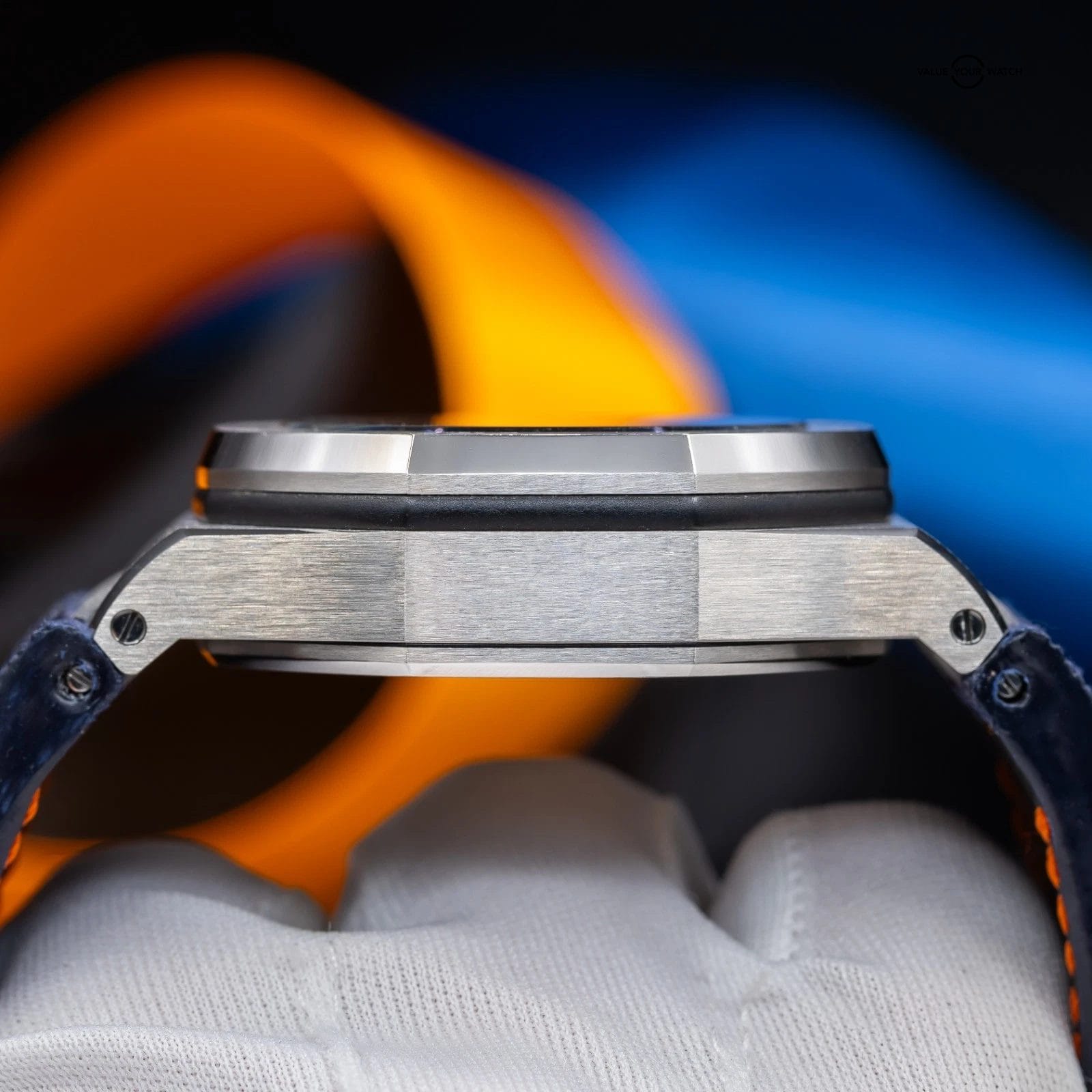 Nicknamed “The Navy” for its bold maritime-inspired styling, the Audemars Piguet Royal Oak Offshore 26470ST.OO.A027CA.01 showcases the brand’s luxury watchmaking legacy in a 42 mm steel case, radiating strength and sophistication. This unique design features the iconic “octagonal steel bezel” for that distinctive touch. Its striking blue “Méga Tapisserie” dial with crisp white Arabic numerals, contrasting silver subdials, and orange chronograph hands delivers a look that is both clean and commanding. Paired with a robust stainless-steel case and sporty blue strap, this Offshore is as rugged as it is refined. A true collector’s favorite, the Navy embodies the perfect blend of daring design and AP precision.