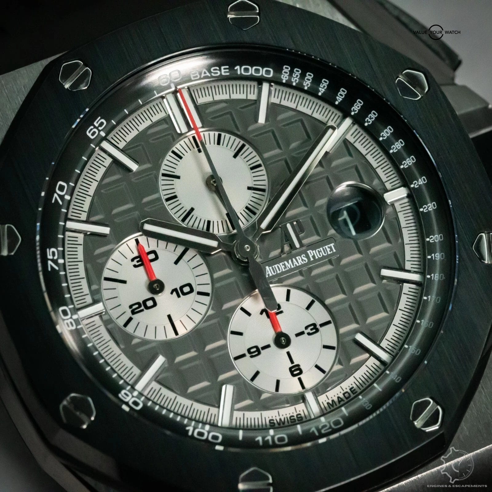The Audemar Piguet Royal Oak Offshore 26400IO is a beast in every sense—built to dominate both the wrist and the room. With its massive 44mm titanium case and unmistakable Royal Oak Offshore silhouette, this timepiece is equal parts engineering and attitude. The black ceramic bezel and matching pushers give it a rugged, high-tech feel, while the slate grey “Méga Tapisserie” dial adds depth and dimension beneath the bold red chronograph accents. It doesn’t ask for attention—it takes it.