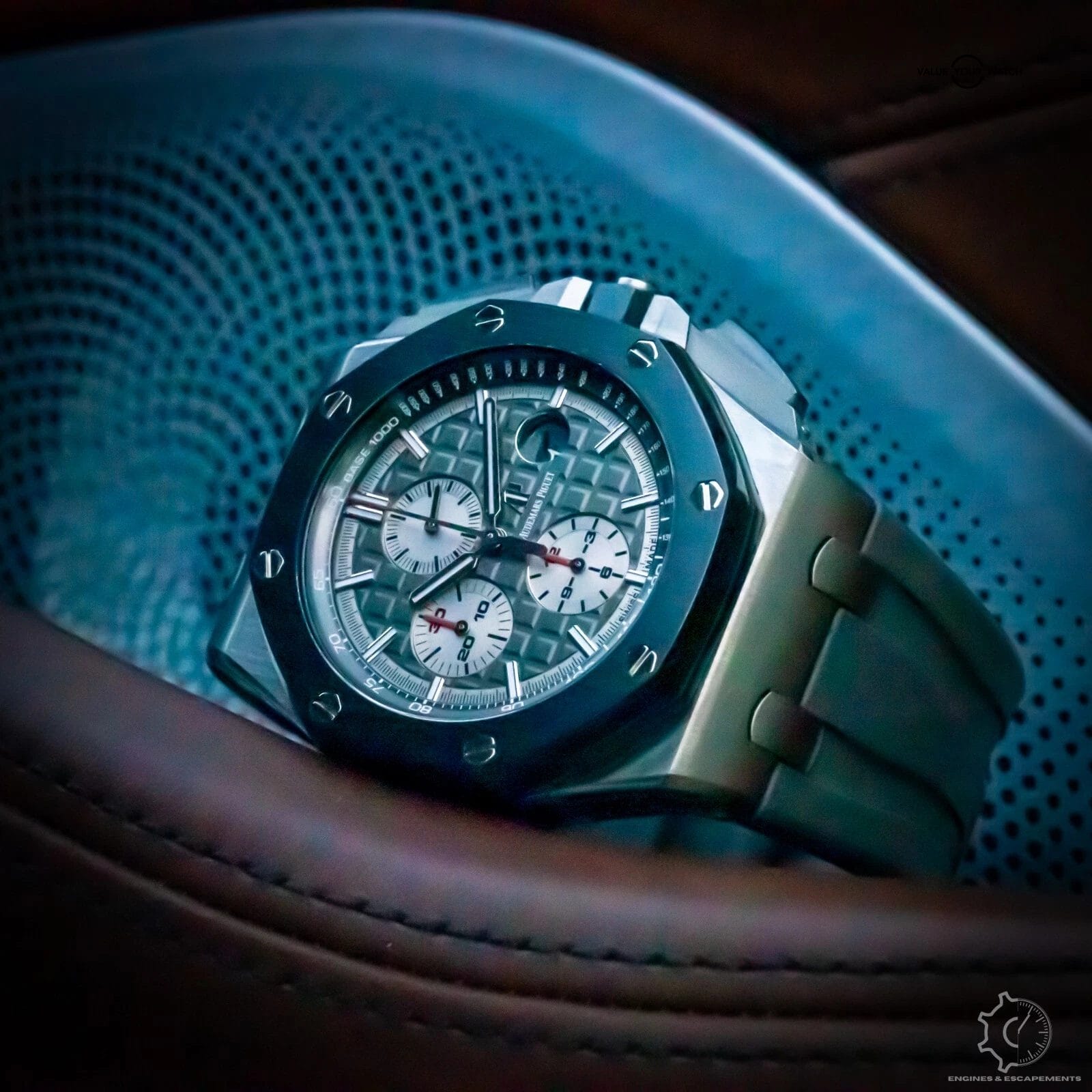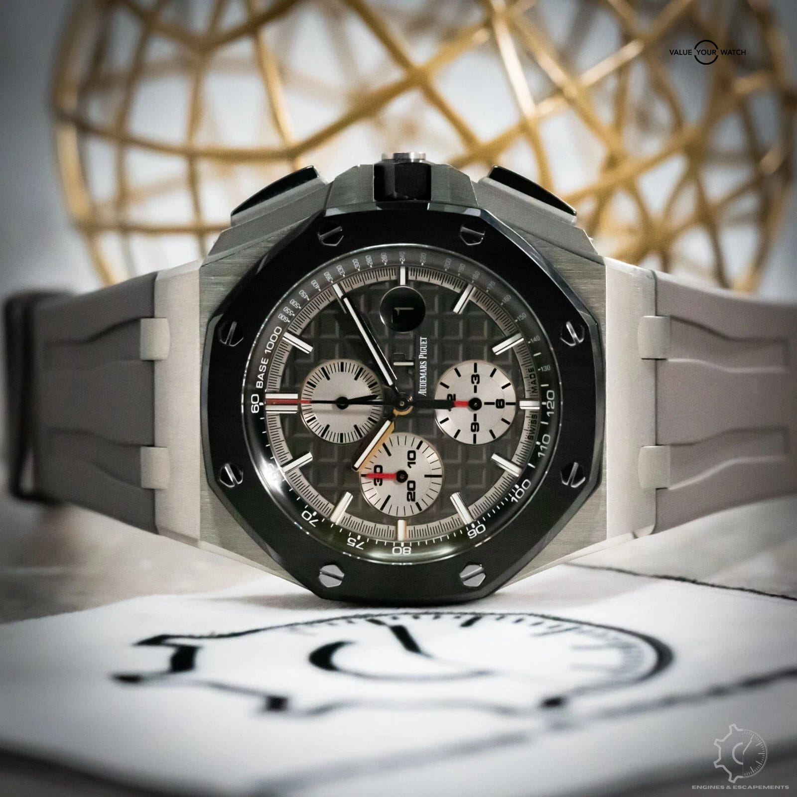 Powered by AP’s automatic chronograph movement, the 26400IO is as capable as it is commanding. Every detail, from the recessed sub-dials to the precise finishing of the case, reflects the brand’s legacy of uncompromising craftsmanship. The grey rubber strap wraps the wrist in comfort while reinforcing the watch’s ultra-modern, almost tactical aesthetic.