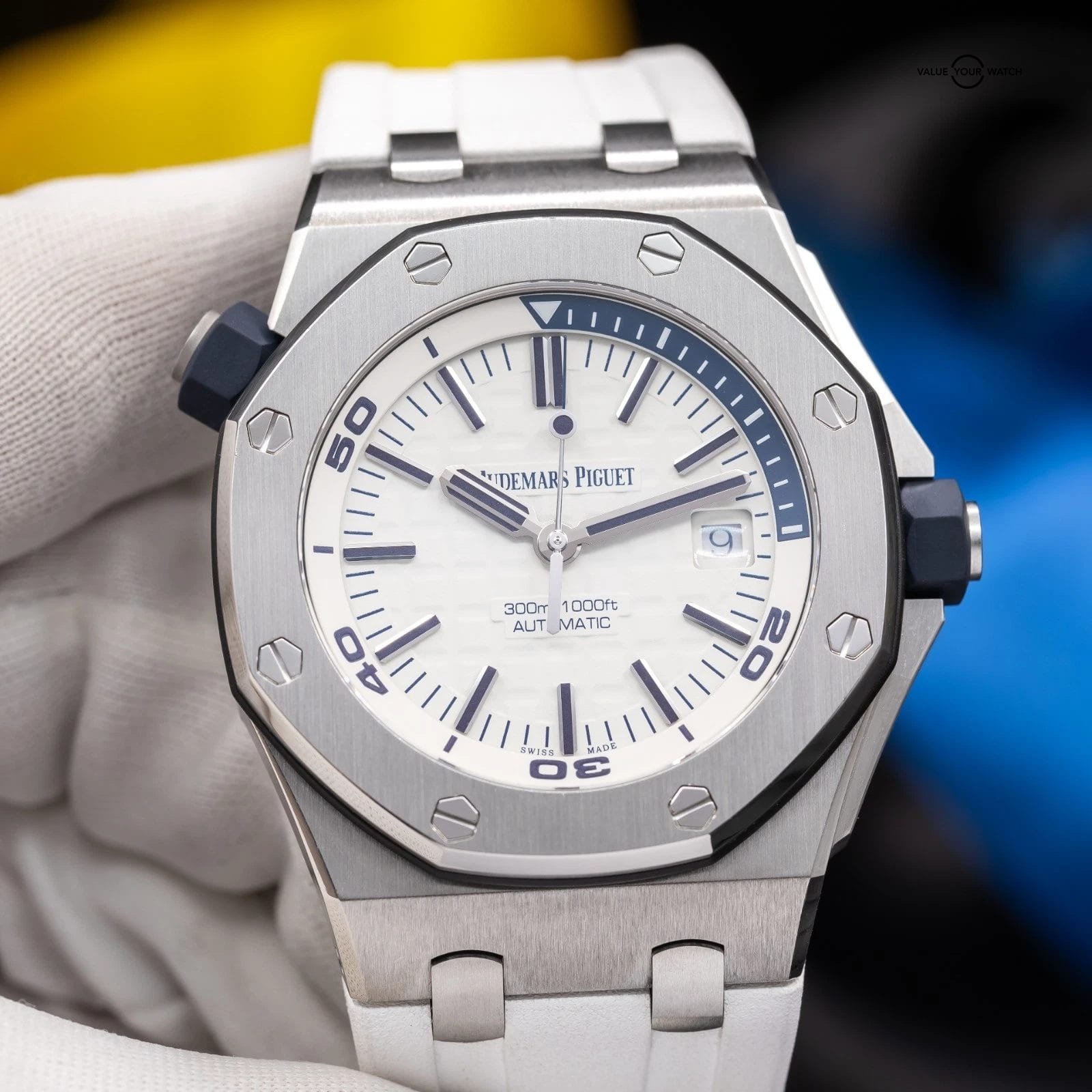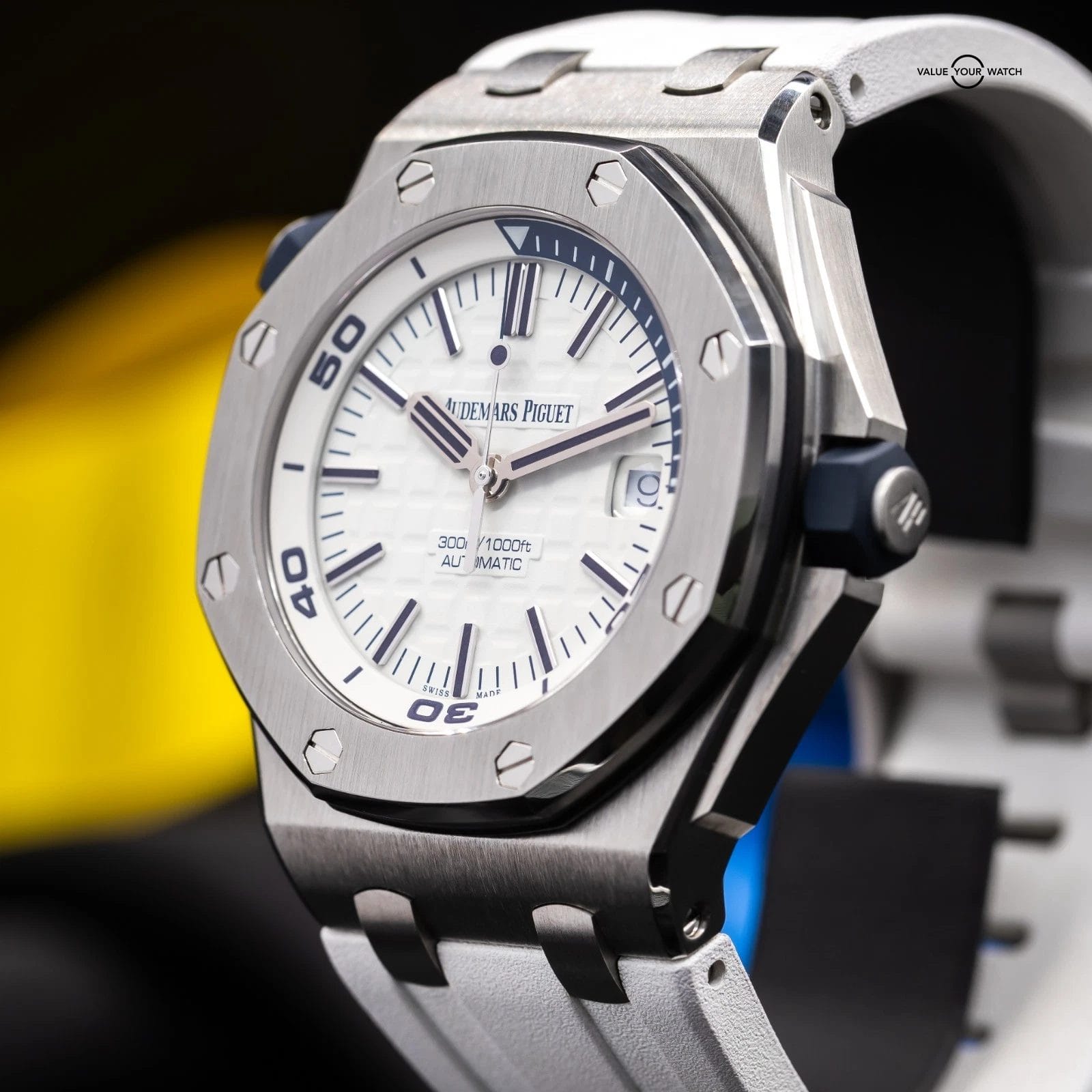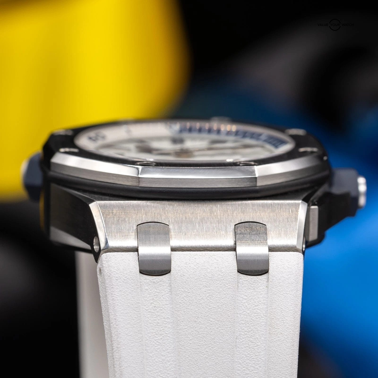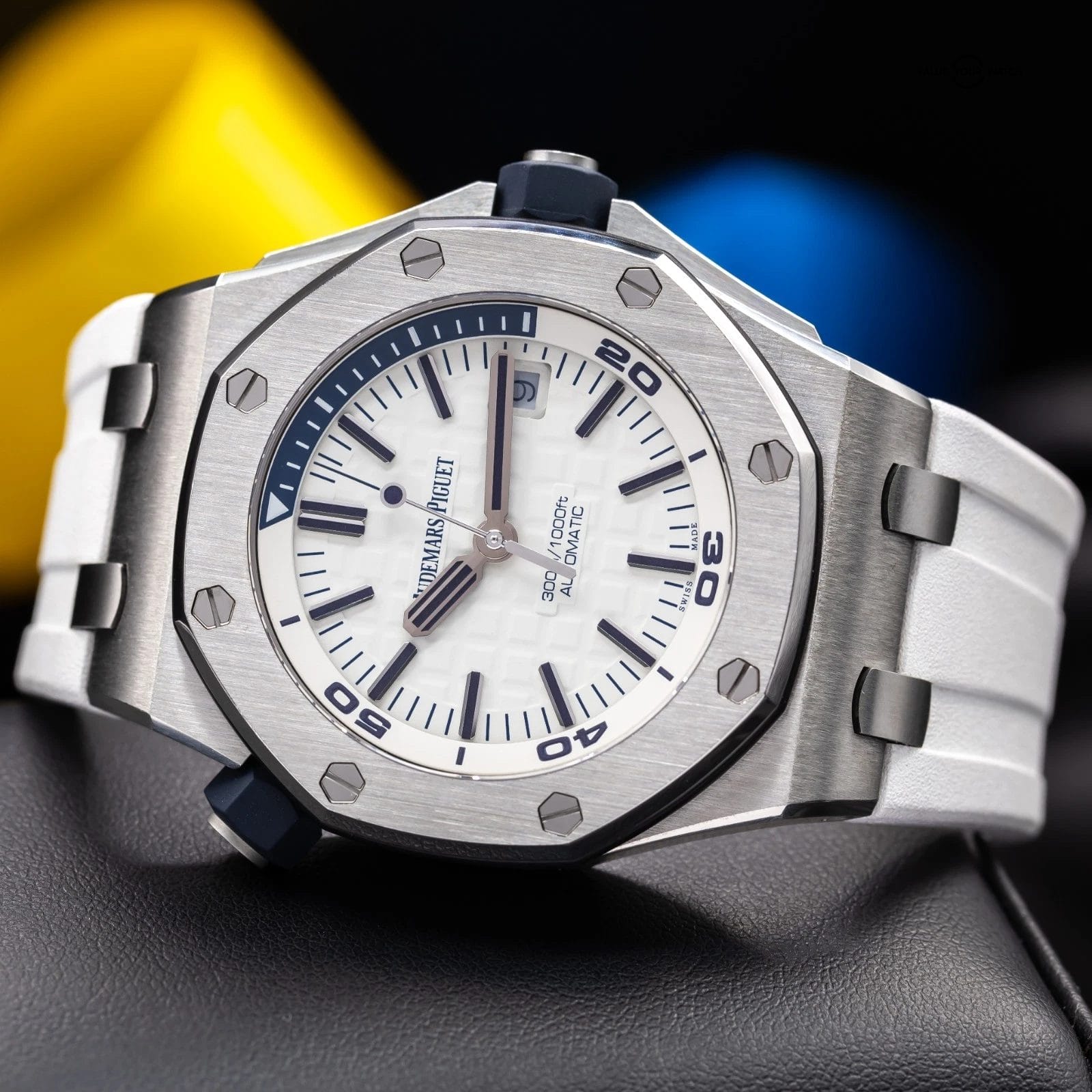 Clean, commanding, and built for adventure — the Audemars Piguet Royal Oak Offshore Diver ref. 15710ST.OO.A010CA.01, known as “The Admiral,” is one of the most sought-after divers in the Offshore lineup. Its 42mm stainless steel case pairs perfectly with the crisp white “Méga Tapisserie” dial and matching white rubber strap, delivering a bold look that is both refined and rugged. Powered by AP’s in-house Caliber 3120, this watch offers 300m water resistance, a rotating inner dive bezel, and a 60-hour power reserve. Whether you’re hitting the ocean or headed to the boardroom, this is a timepiece that exudes confidence with every glance — a true rarity that remains hard to find and impossible to ignore..