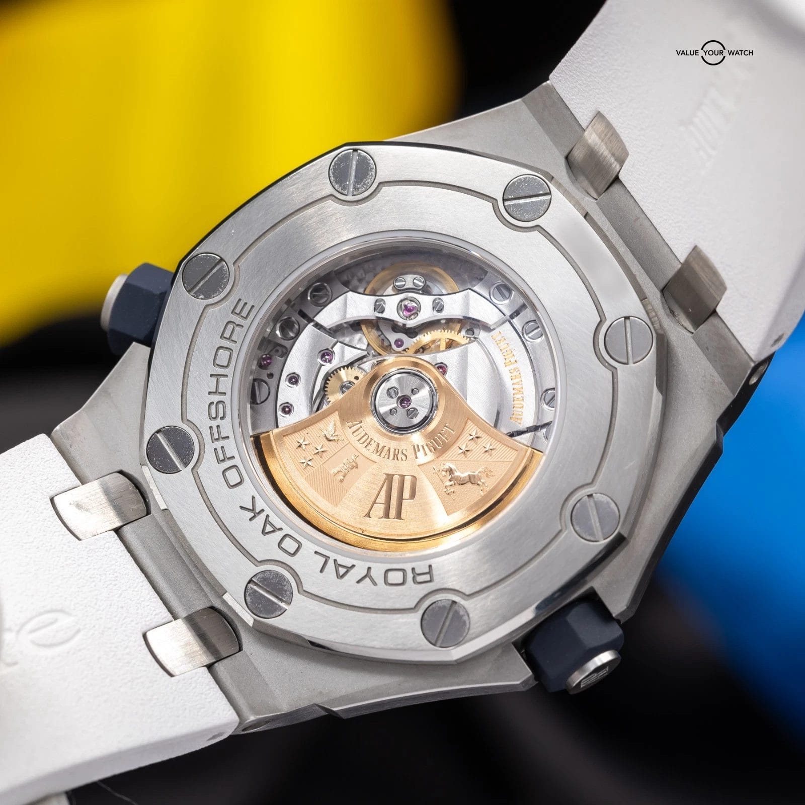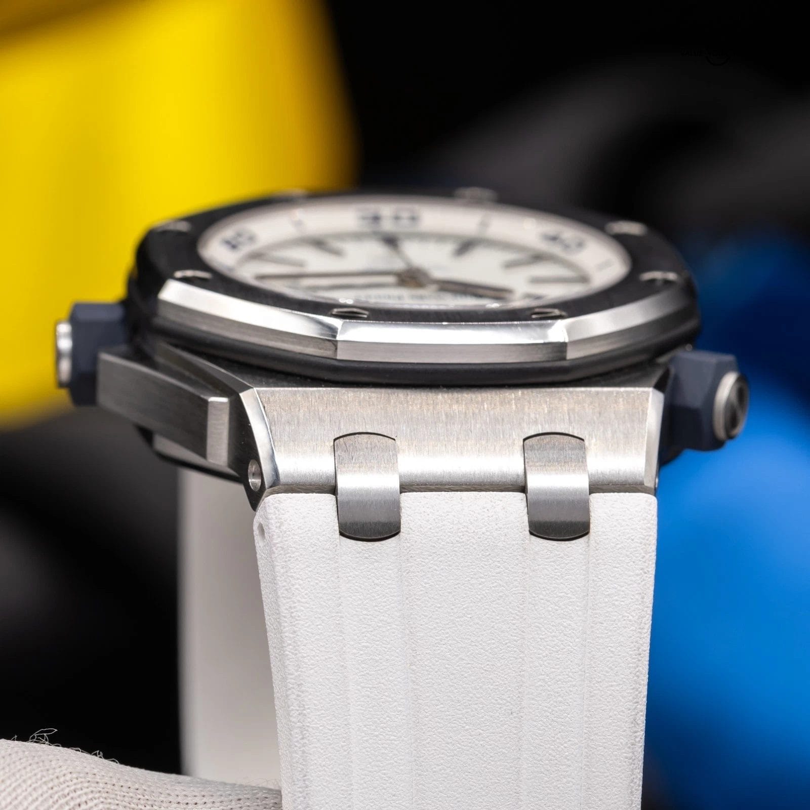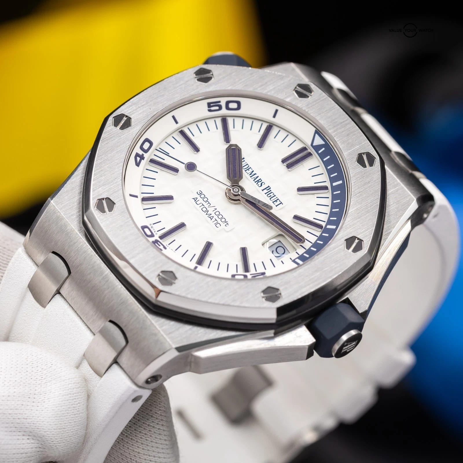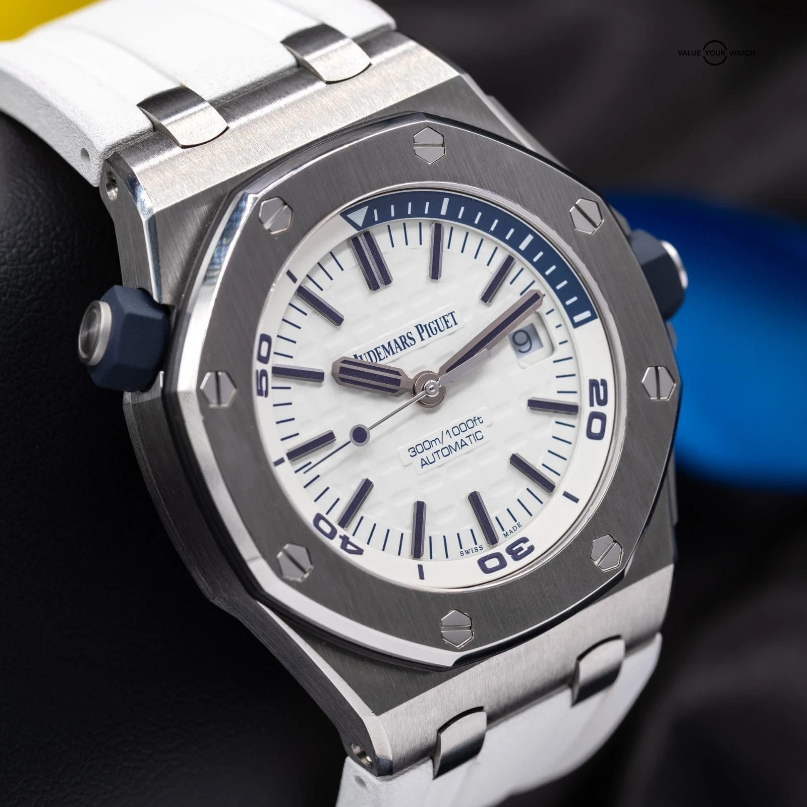 Clean, commanding, and built for adventure — the Audemars Piguet Royal Oak Offshore Diver ref. 15710ST.OO.A010CA.01, known as “The Admiral,” is one of the most sought-after divers in the Offshore lineup. Its 42mm stainless steel case pairs perfectly with the crisp white “Méga Tapisserie” dial and matching white rubber strap, delivering a bold look that is both refined and rugged. Powered by AP’s in-house Caliber 3120, this watch offers 300m water resistance, a rotating inner dive bezel, and a 60-hour power reserve. Whether you’re hitting the ocean or headed to the boardroom, this is a timepiece that exudes confidence with every glance — a true rarity that remains hard to find and impossible to ignore..