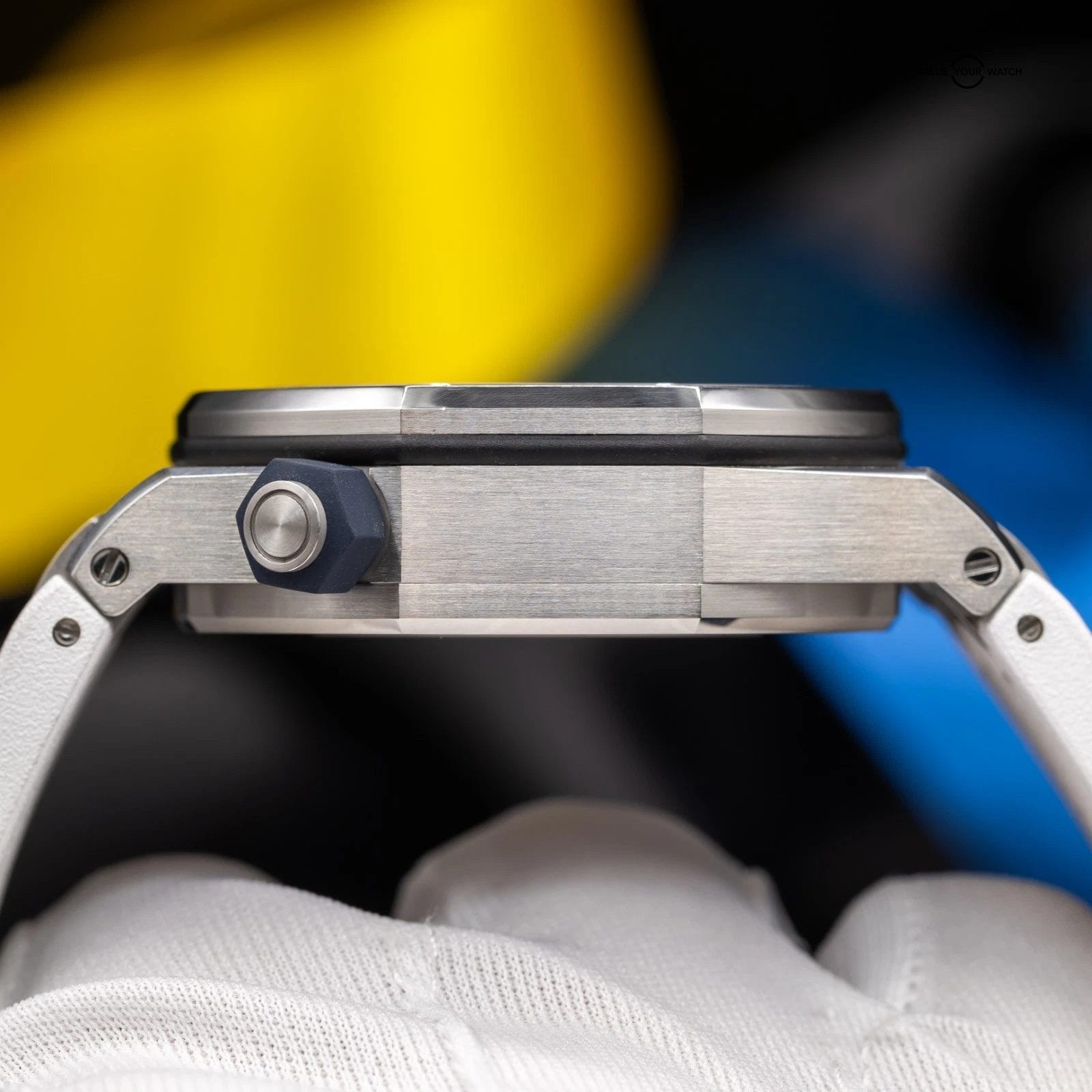 § Dial: White Méga Tapisserie with blue rotating inner bezel and blue accents