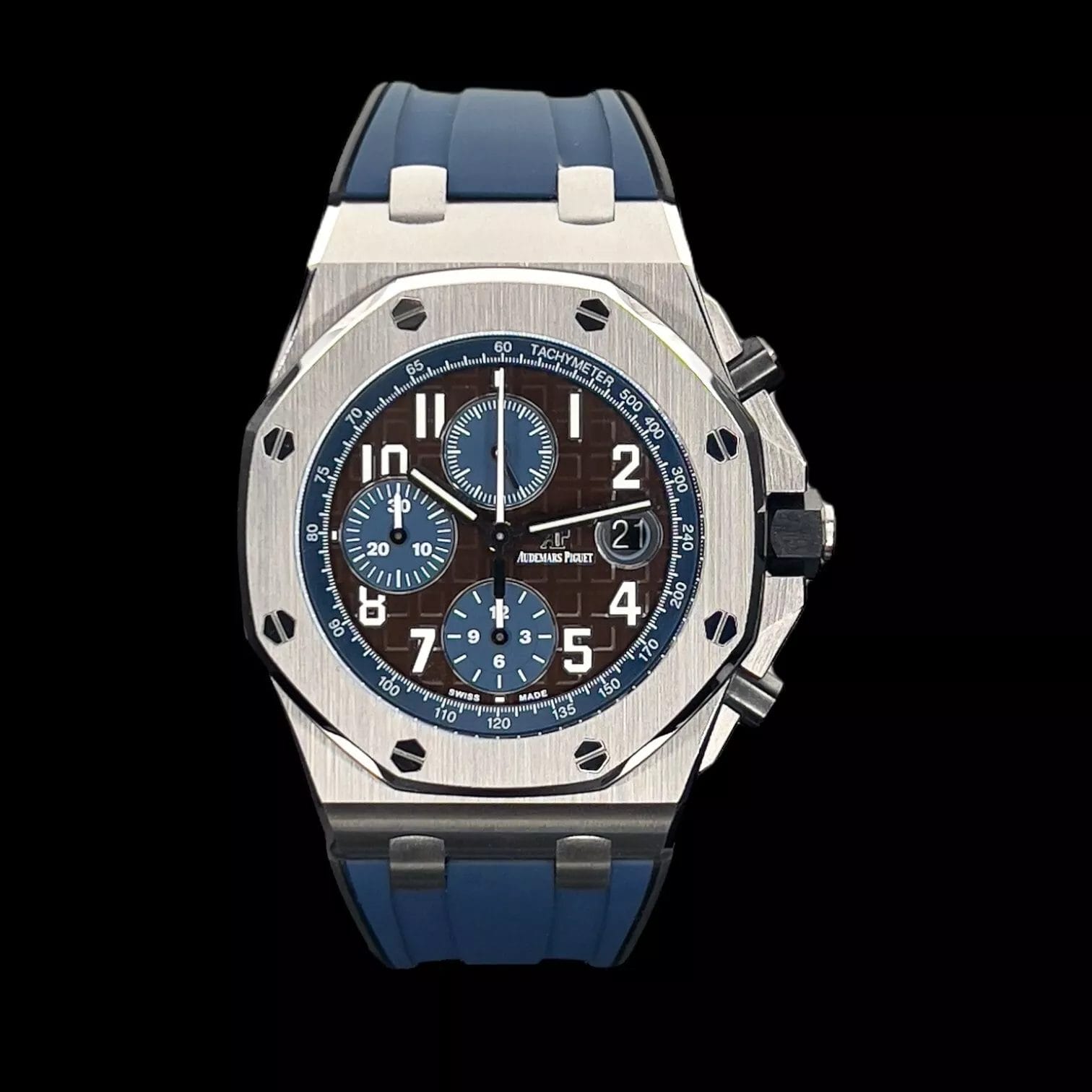 Audemars Piguet is celebrated for its elegant craftsmanship that embodies a classic design with modern sophistication for a statement of style and prestige. Encased in durable stainless steel, the 42mm watch combines robustness with sophistication, enhanced by an octagonal smooth steel bezel for added refinement that is crafted for enduring quality. Paired with the Audemars Piguet signature black rubber strap it stands as a testament to the fusion of art and engineering in the world of luxury watches.