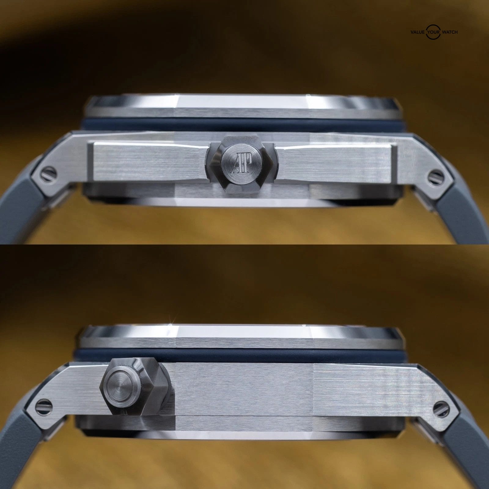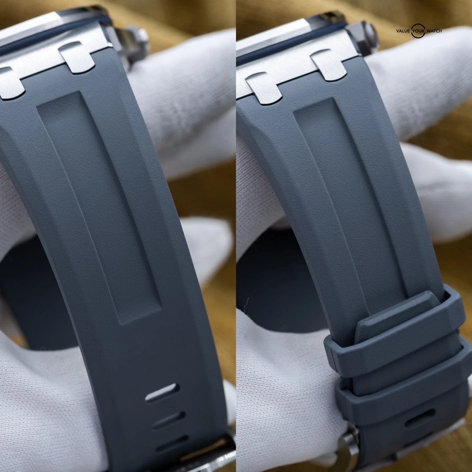This Royal Oak Offshore Diver is a true sports luxury piece with the technical chops to back it up. At 42mm in steel, it wears substantial but not oversized, with the iconic octagonal bezel that’s watchmaking’s most famous silhouette. The grey “Méga Tapisserie” dial ties in perfectly with the grey rubber strap, making the whole piece feel stealthy and contemporary. Inside, you’ve got the in-house caliber 4308 — automatic, robust, and with a solid 60-hour power reserve. The rotating inner bezel, adjusted via the 10 o’clock crown, is a nod to its dive credentials, and the 300m water resistance means it’s not just desk-diver material.