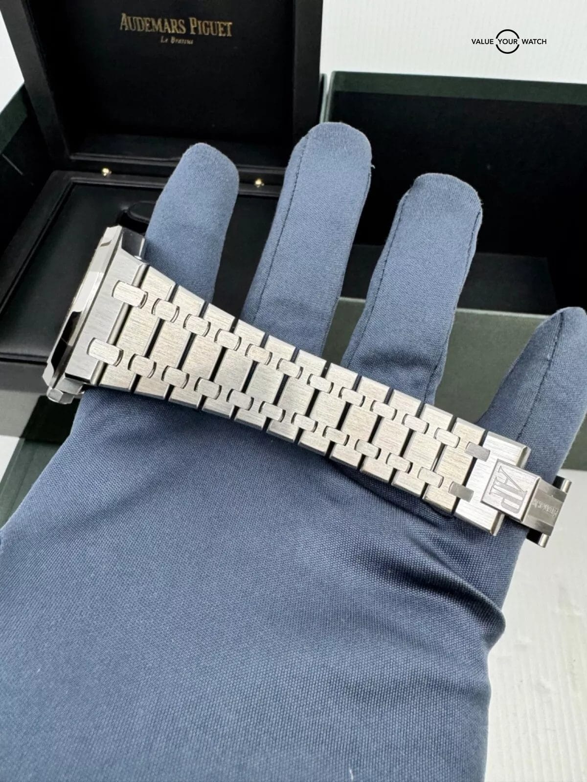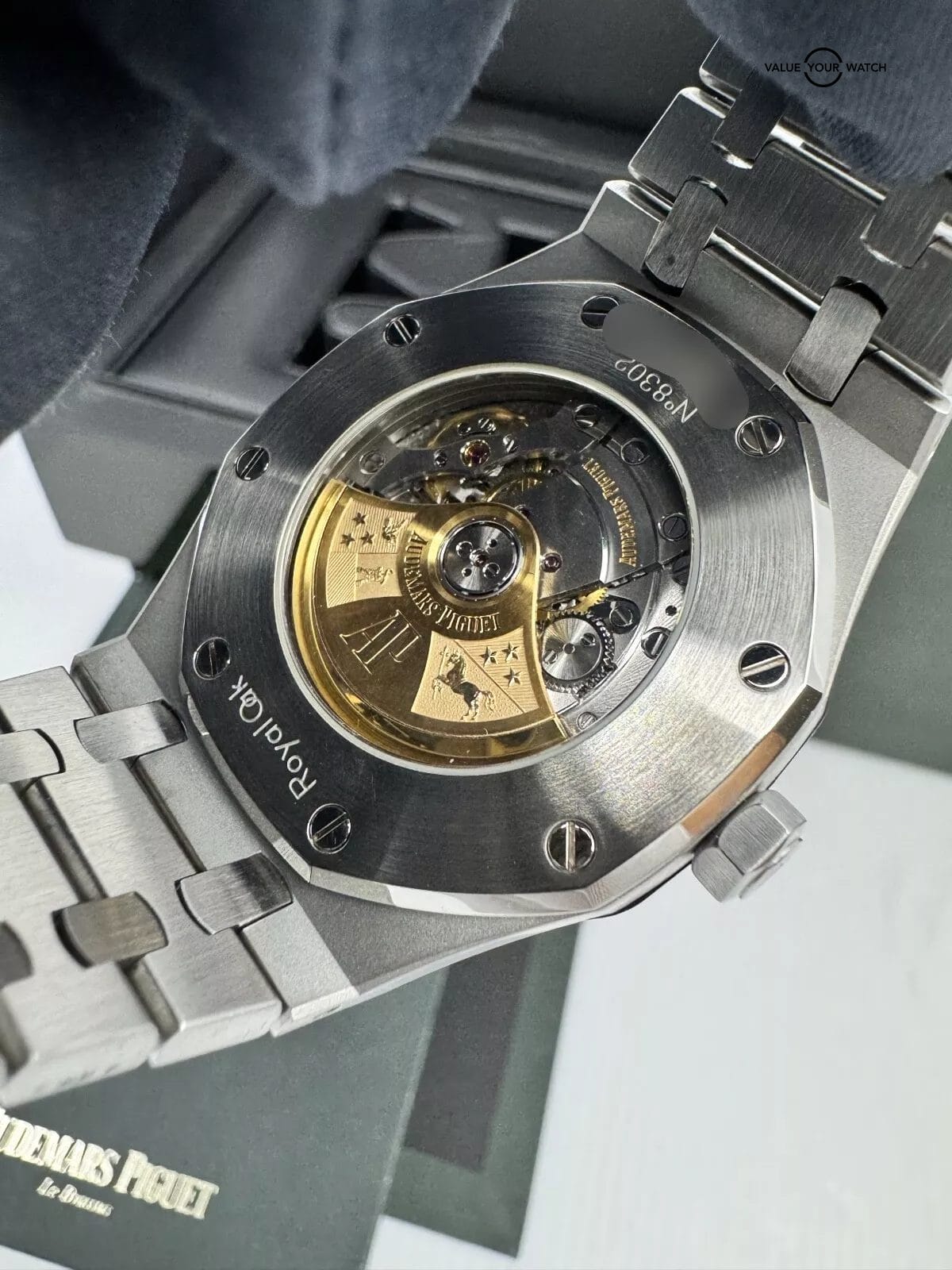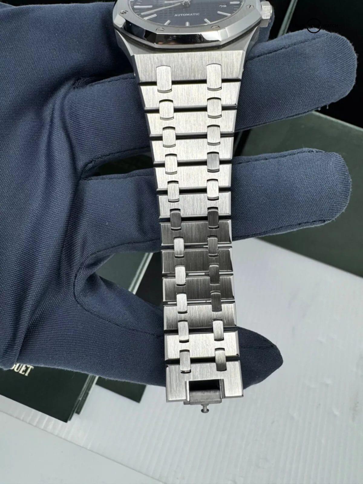 - The stainless steel case offers durability and a refined finish, maintaining the signature look of the Royal Oak.