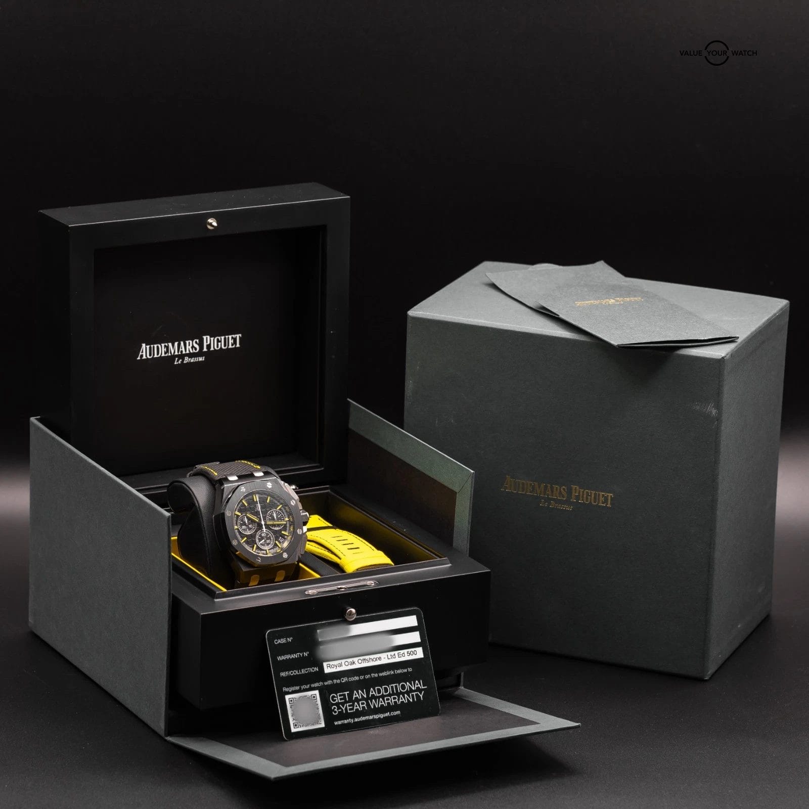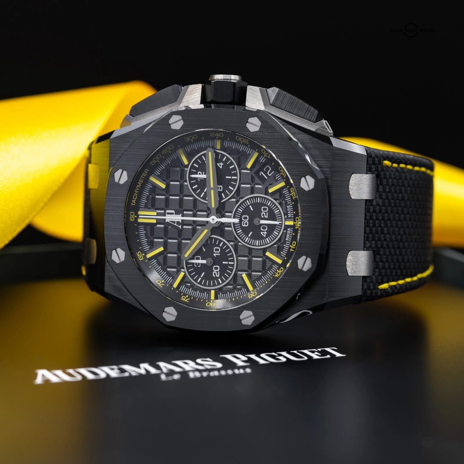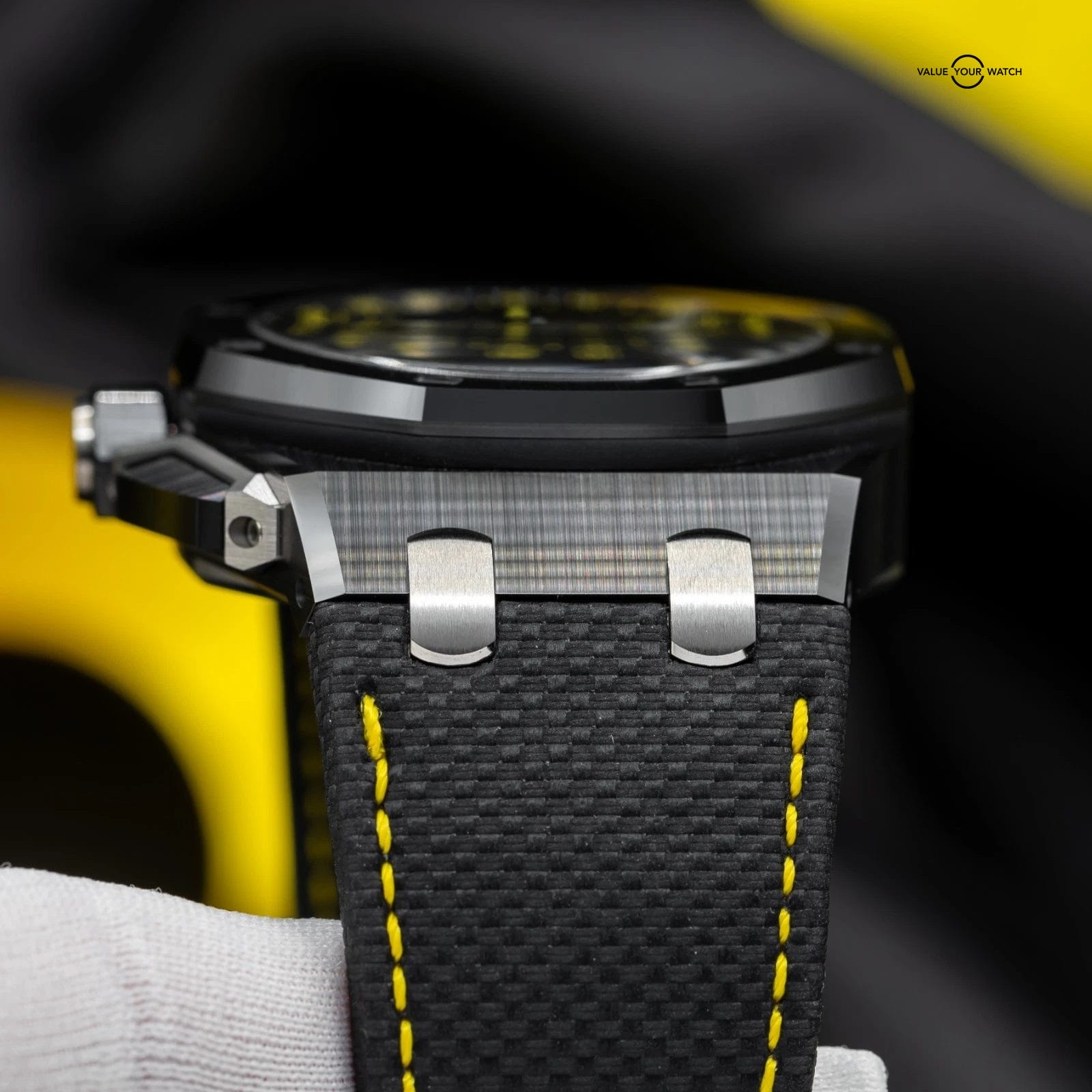 Its black “Méga Tapisserie” dial features black counters, a black external ring, and a black inner bezel, dramatically contrasted by white gold applied hour-markers and Royal Oak hands coated with bright yellow luminescent material. Audemars Piguet’s interchangeable strap system is included, along with two straps: a black calfskin strap with yellow stitching and a full yellow calfskin strap with black accents. Rare, visually explosive, and powered by AP’s modern flyback chronograph movement, this limited Offshore perfectly blends sporty aggression with high-end craftsmanship.