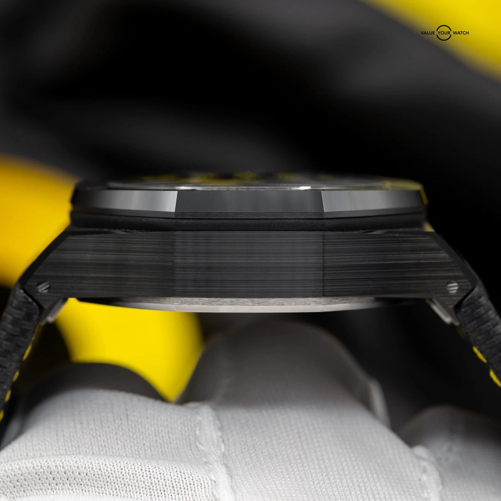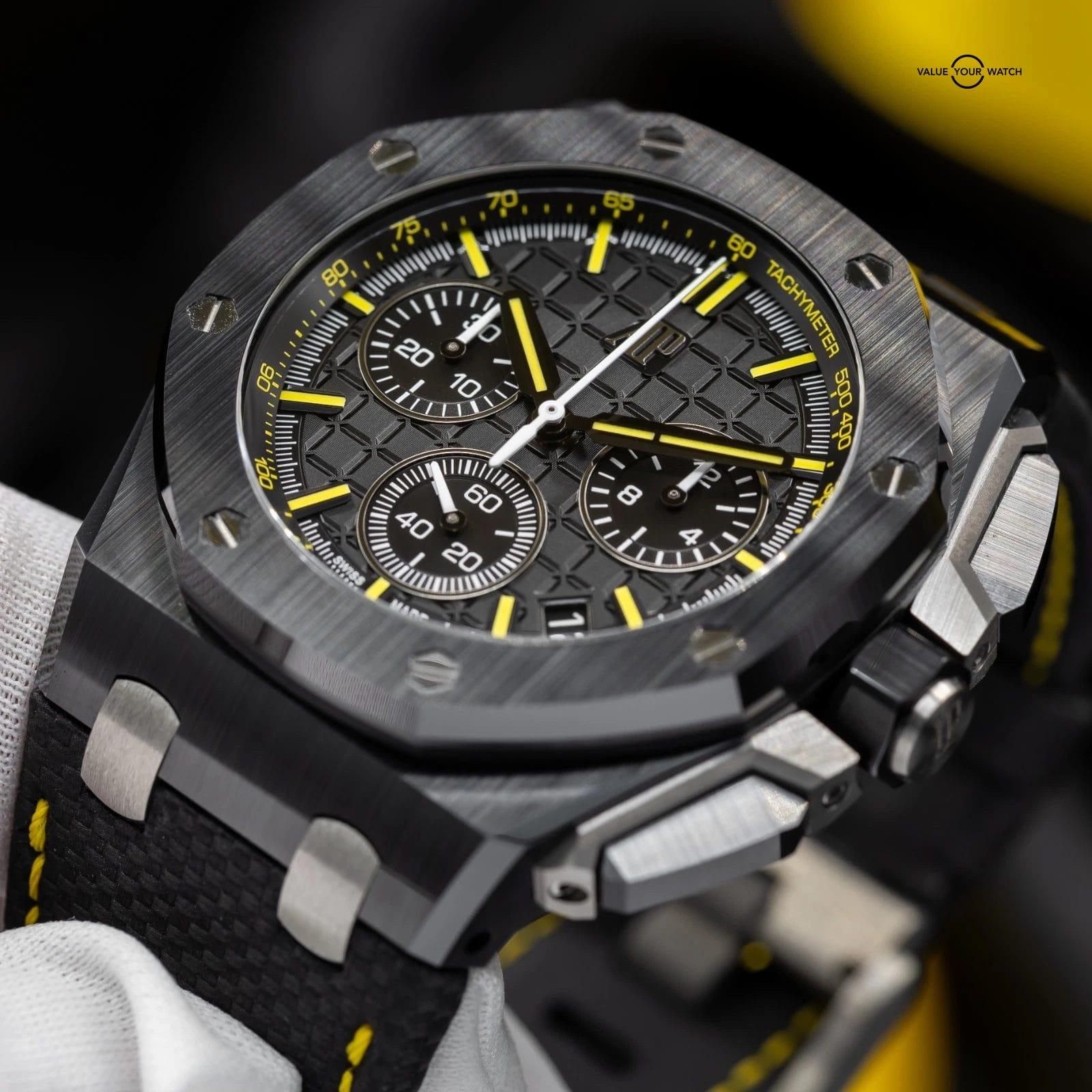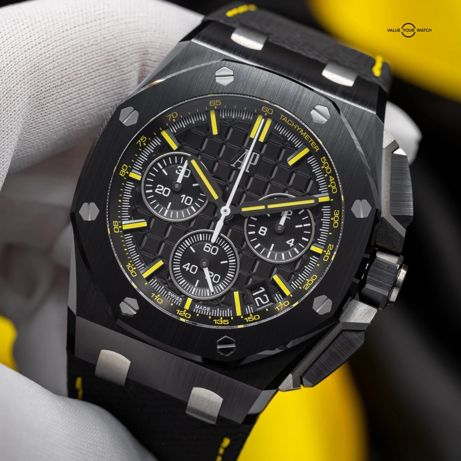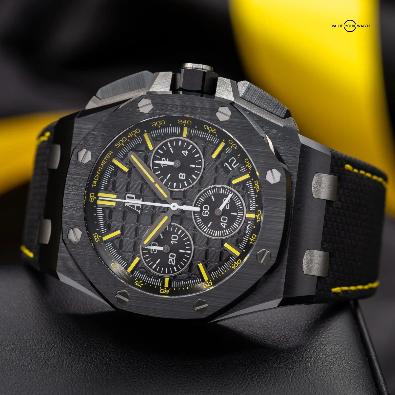 Its black “Méga Tapisserie” dial features black counters, a black external ring, and a black inner bezel, dramatically contrasted by white gold applied hour-markers and Royal Oak hands coated with bright yellow luminescent material. Audemars Piguet’s interchangeable strap system is included, along with two straps: a black calfskin strap with yellow stitching and a full yellow calfskin strap with black accents. Rare, visually explosive, and powered by AP’s modern flyback chronograph movement, this limited Offshore perfectly blends sporty aggression with high-end craftsmanship.