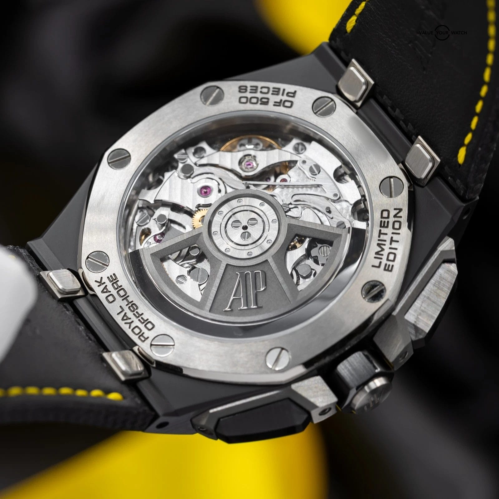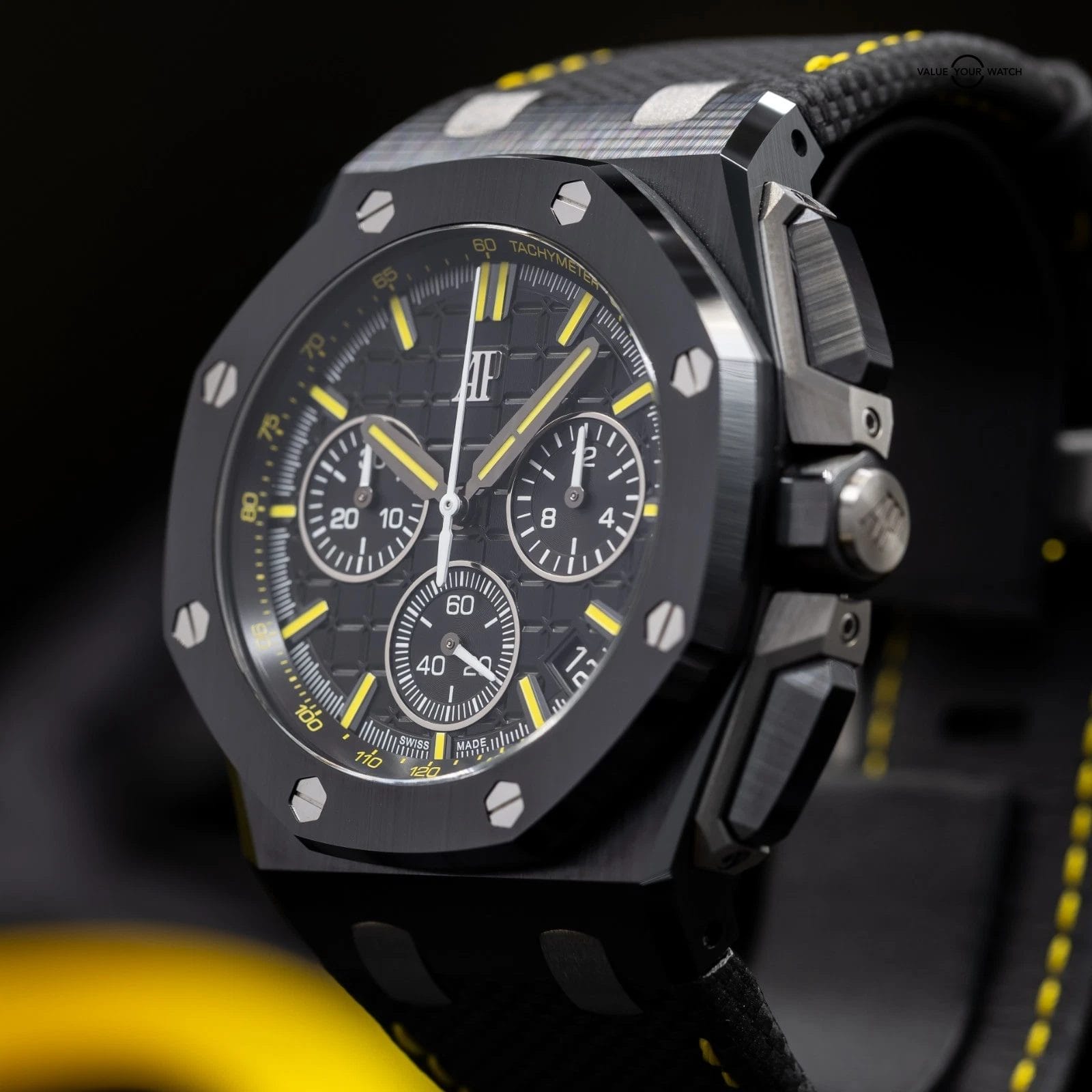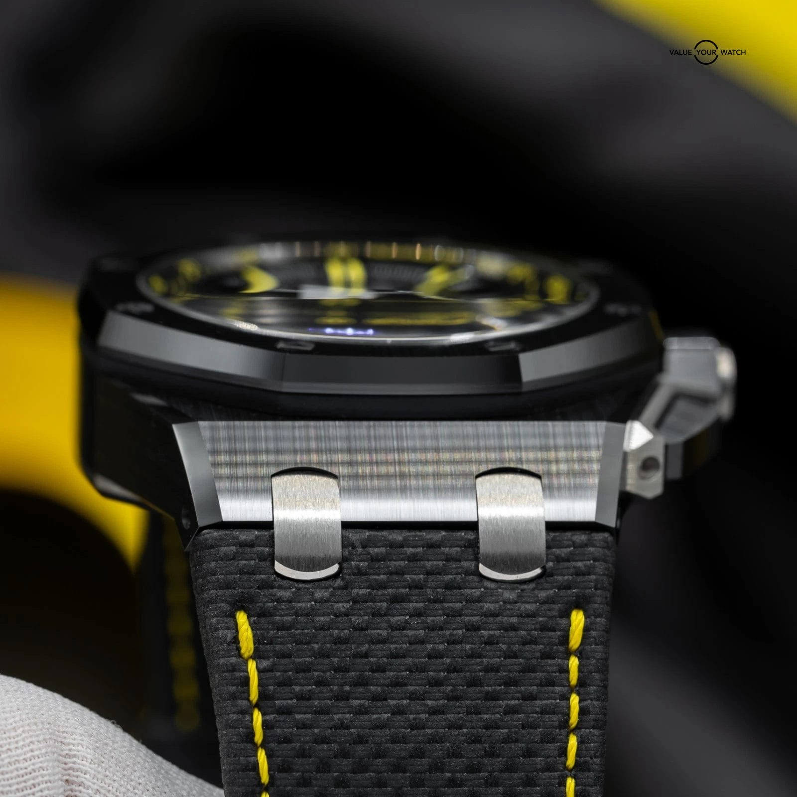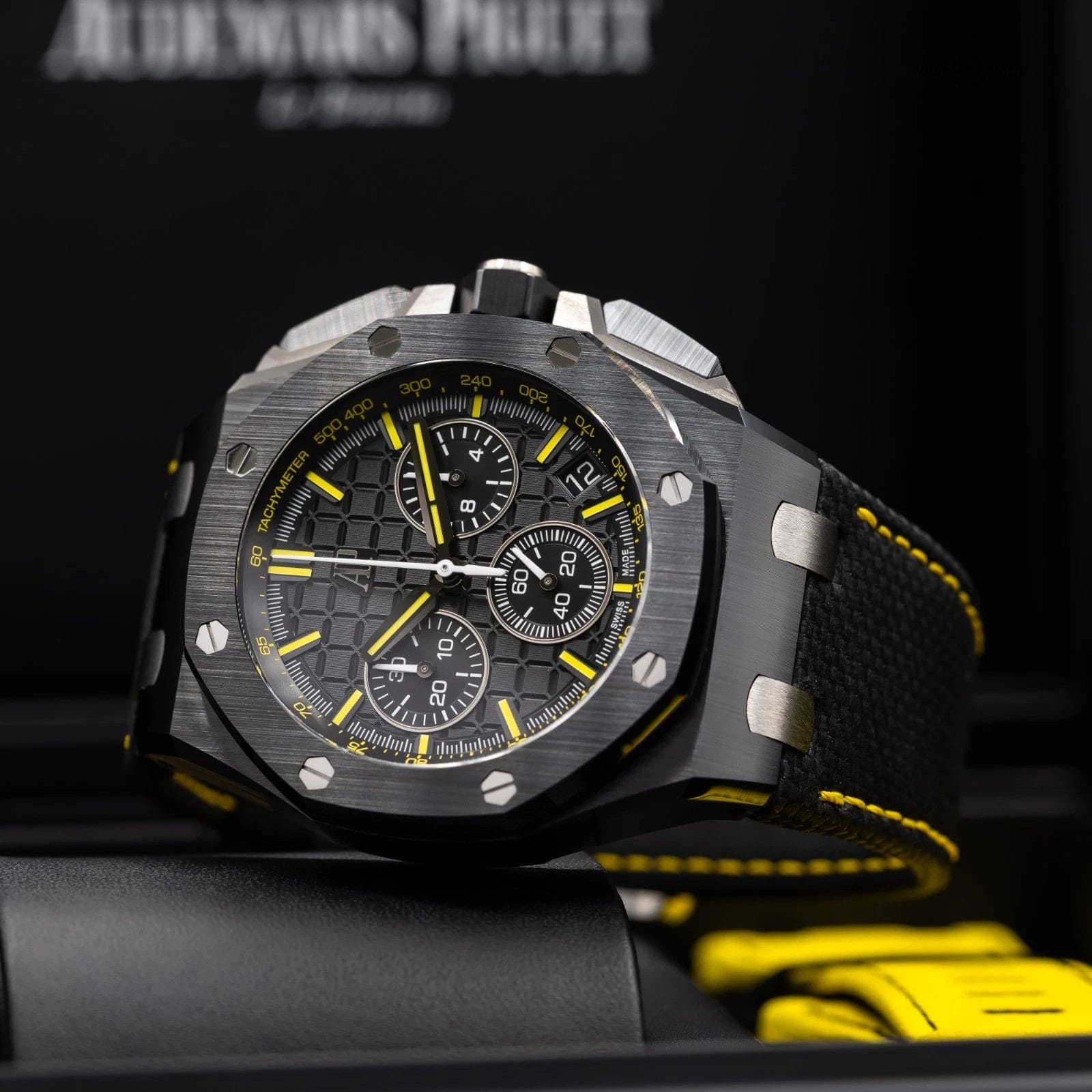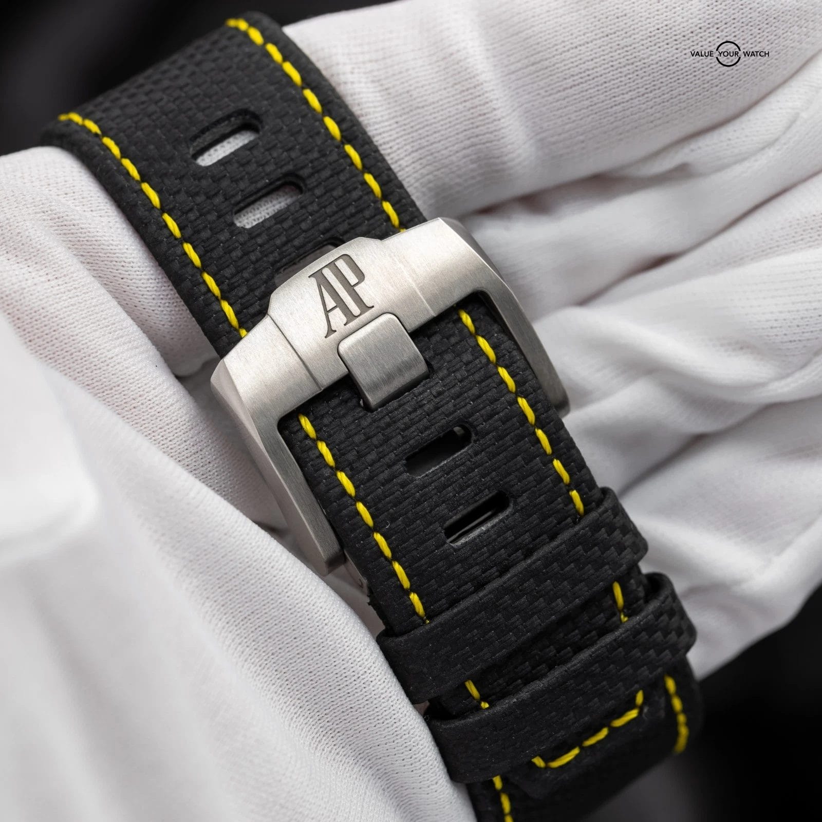 · Straps: Includes two AP “Quick Change” interchangeable straps — black calfskin with yellow stitching & yellow calfskin strap with black stitching