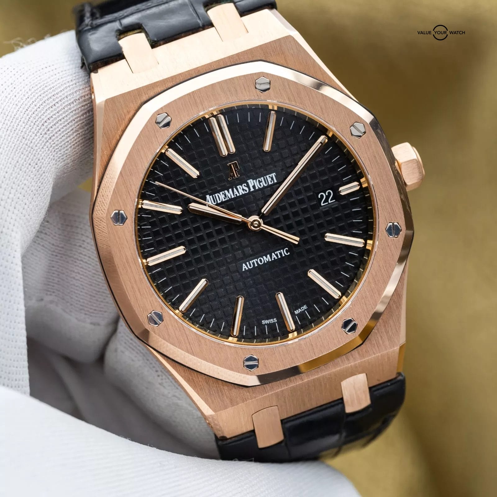 Up for sale or trade is the Royal Oak Offshore in exquisite rose gold and the harder to find black dial! A complete full set with box and all the warranty paperwork. The watch is housed in a insanely finished 18-carat gold case which contrasts beautiful against the stunning black dial. Balanced perfectly with the rose gold deployant clasp holding together the beautiful AP leather strap.