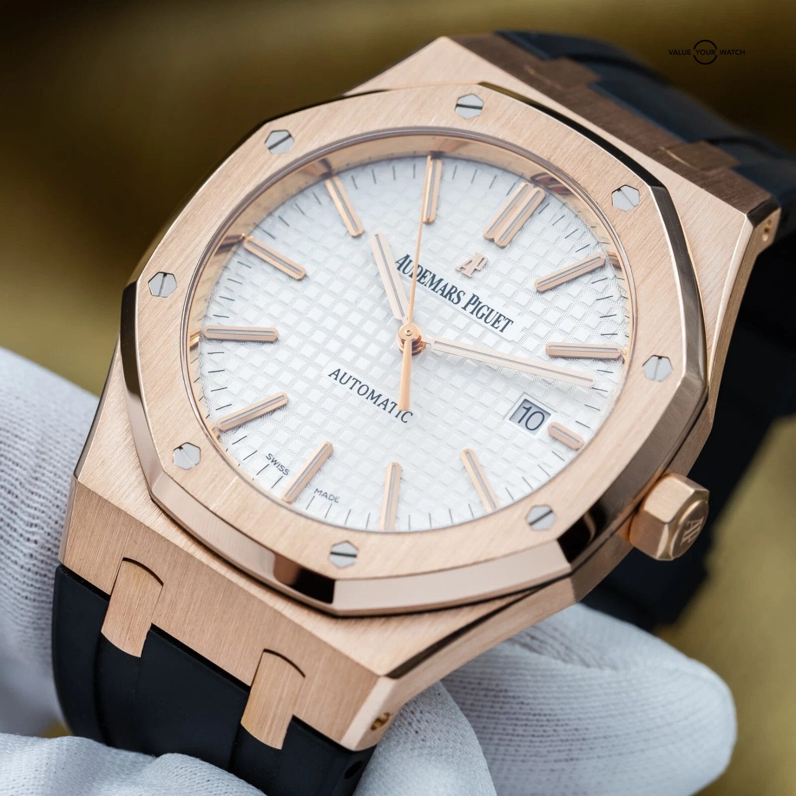 Grail alert! Up for sale or trade is the Royal Oak Offshore Chronograph in exquisite rose gold. It’s housed in an insanely finished 18-carat gold case that showcases Audemars Piguet’s signature octagonal bezel. The iconic “Tapisserie” pattern adds depth and texture, and the white dial against the rose case is so good in the flesh. Each element of this timepiece, from its polished surfaces to its intricate details, reflects the brand’s commitment to excellence. This timepiece is ideal for those who desire a statement piece that seamlessly blends elegance with functionality in one of AP’s most sought-after configurations.