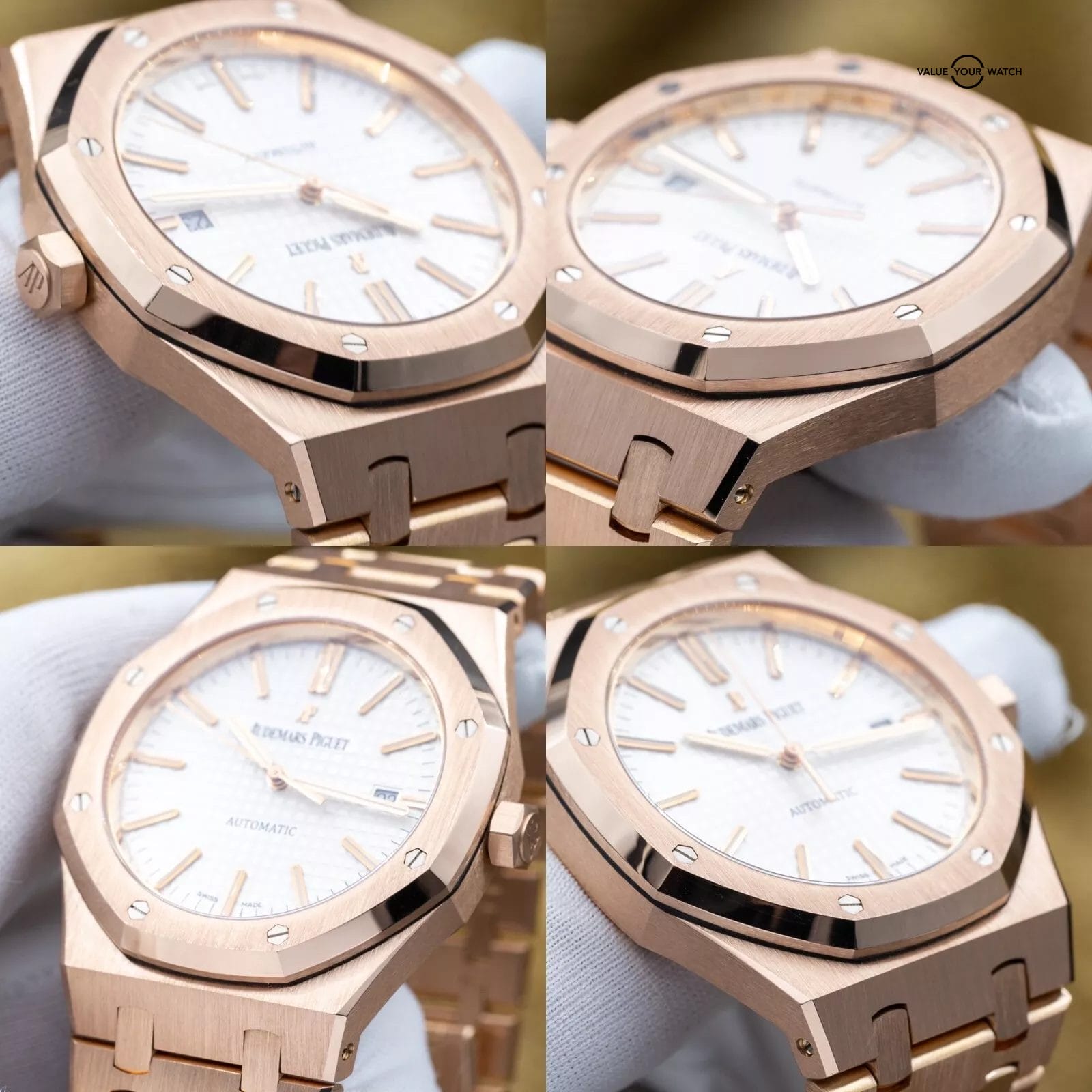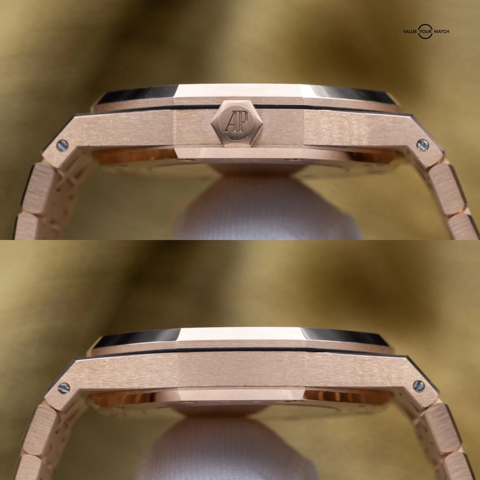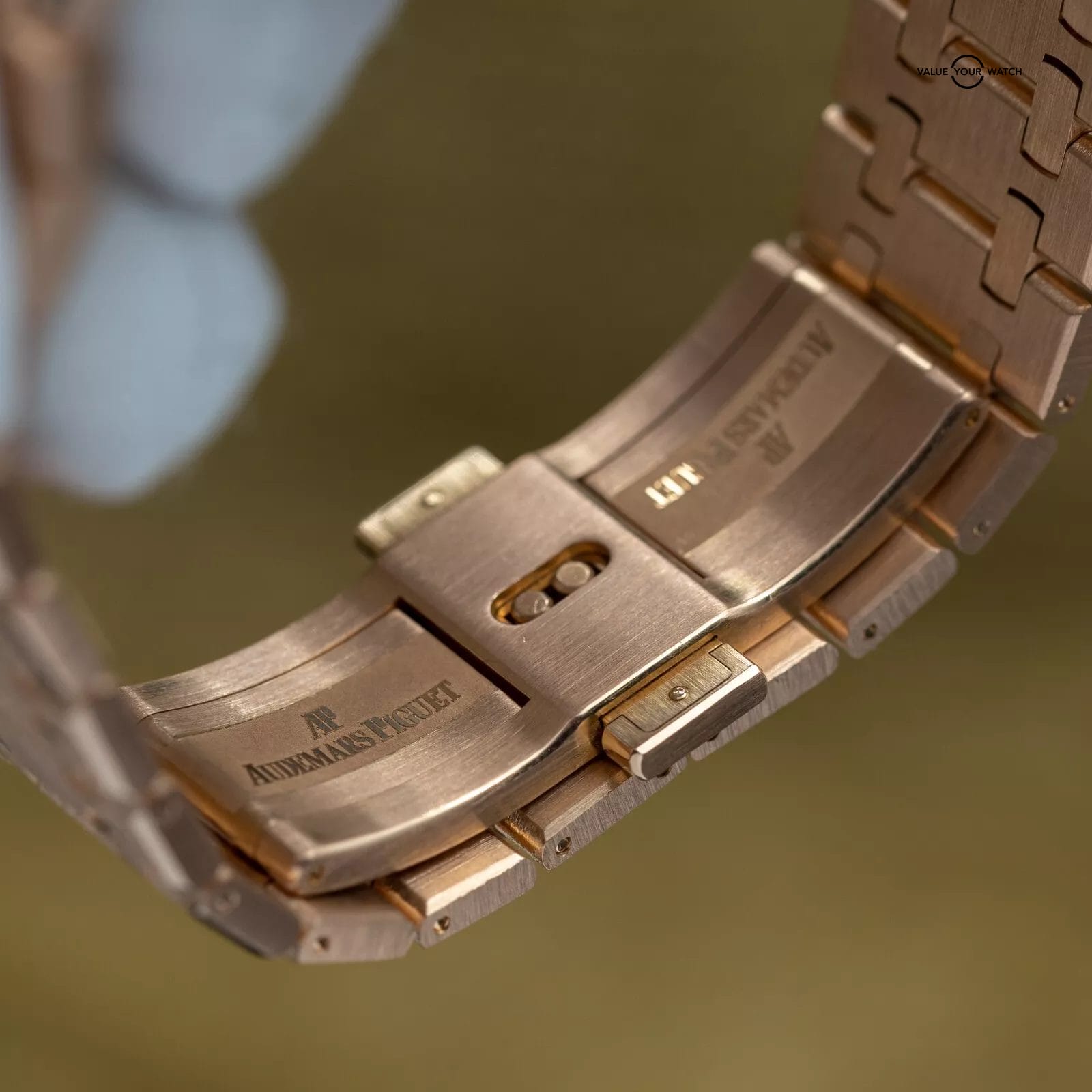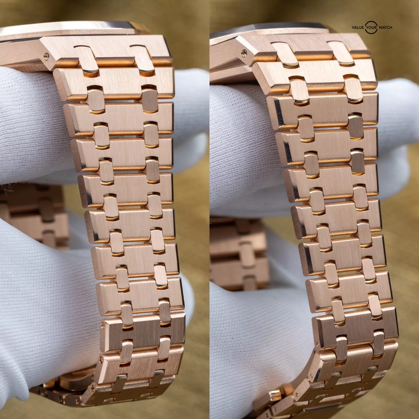 Grail alert! Up for sale or trade is the Royal Oak Offshore in exquisite rose gold. It’s housed in a insanely finished 18-carat gold case and matching bracelet finished to the highest quality AP knows how to do. This piece came with the bracelet, so it is not a converted watch…this is the real deal with the correct reference! The white dial against the rose is so good in the flesh. Pretty much the epitome of the best piece of jewelry a man can wear…just like Genta intended!