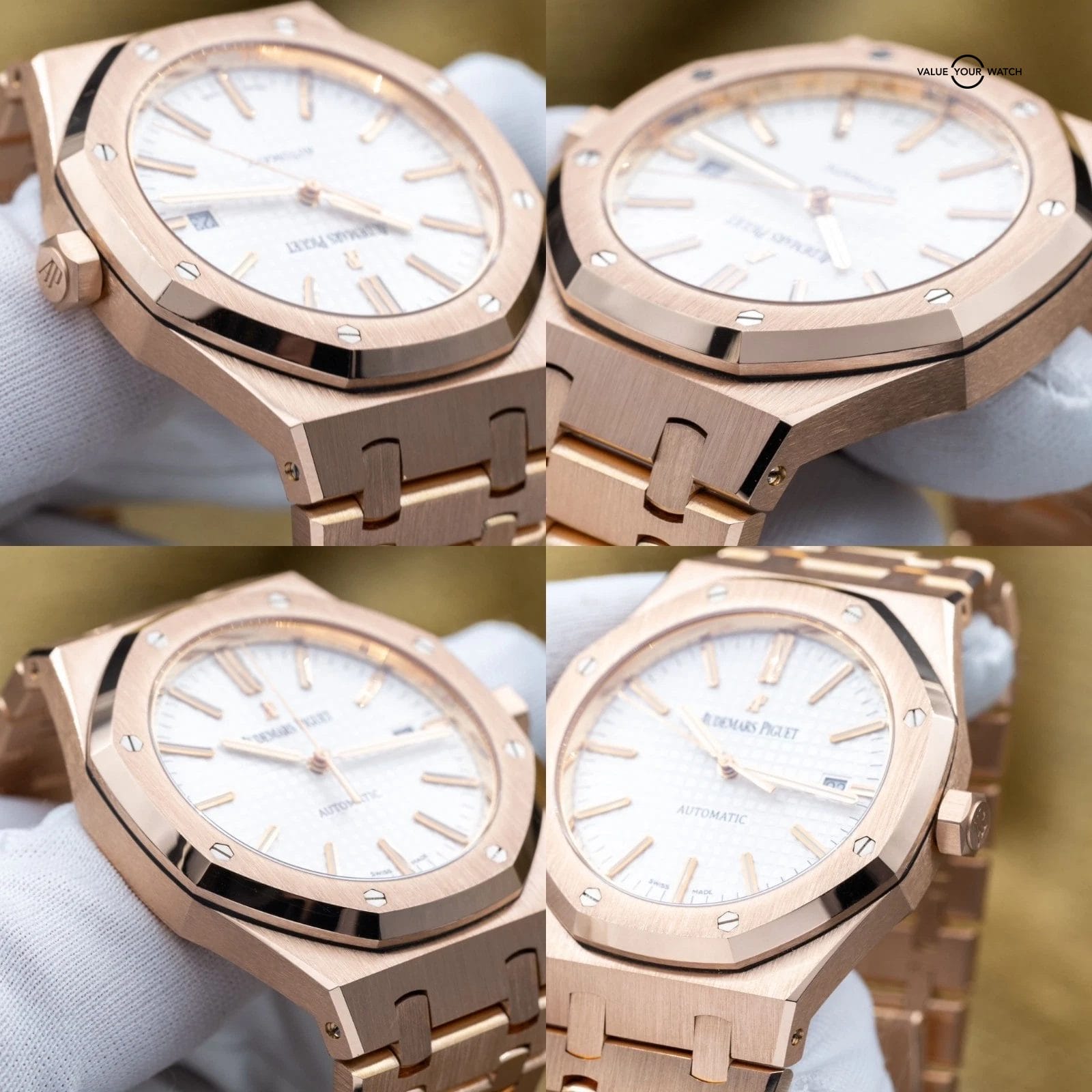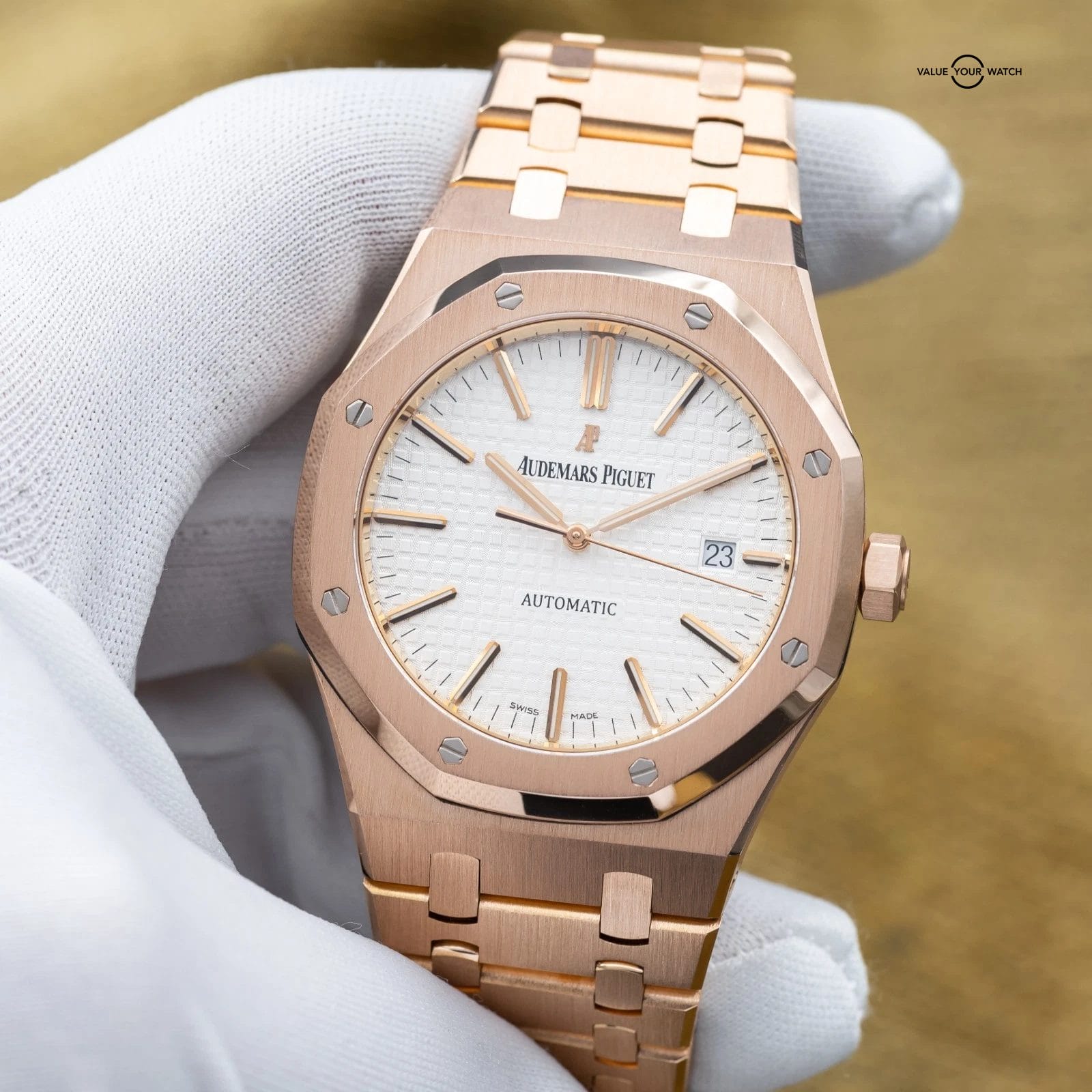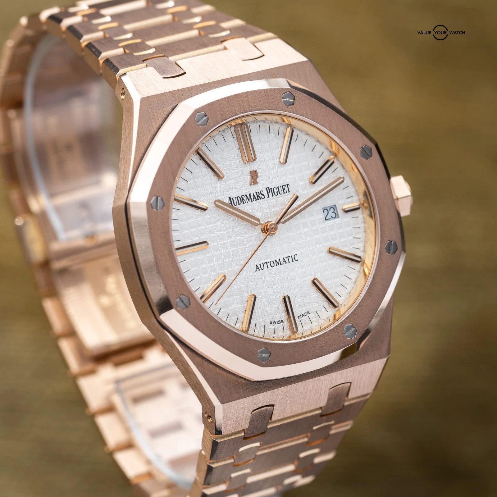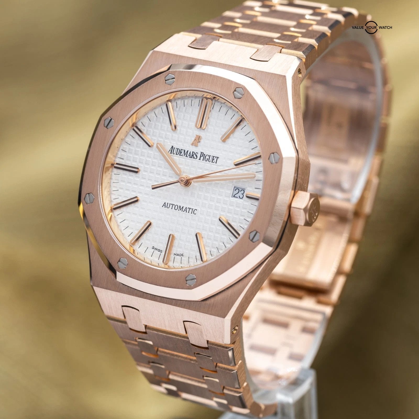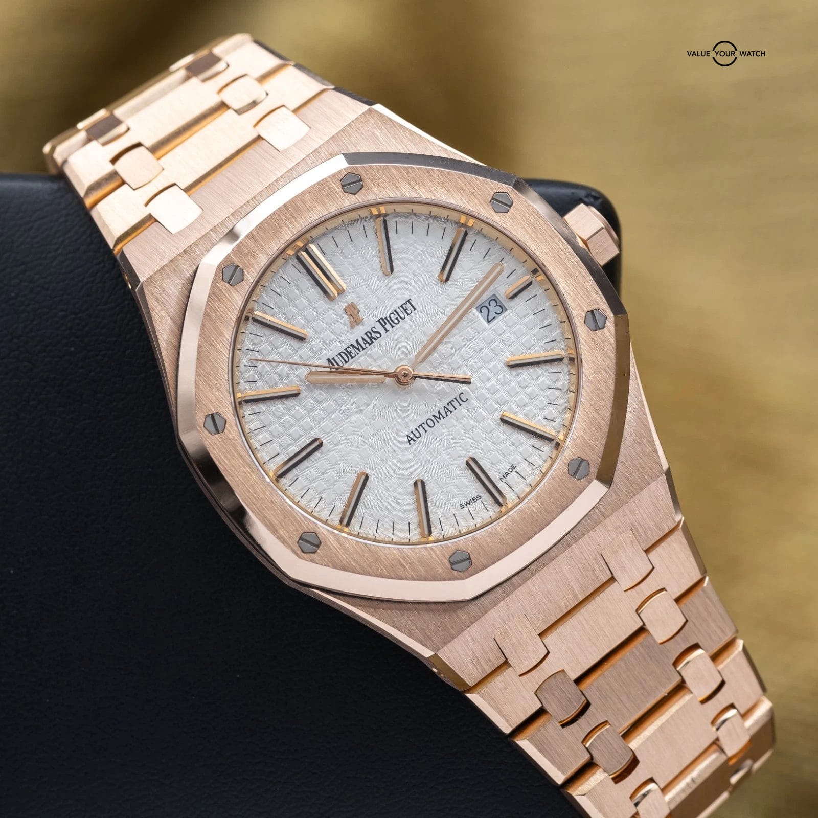 Grail alert! Up for sale or trade is the Royal Oak Offshore in exquisite rose gold with the stunning silver dial! A complete set with the warranty paperwork and non-converted bracelet originally from AP. Doesn’t get any better than that! The watch is housed in an insanely finished 18-carat gold case and matching bracelet finished to the highest quality AP knows how to do. Pretty much the epitome of the best piece of jewelry a man can wear…just like Genta intended!