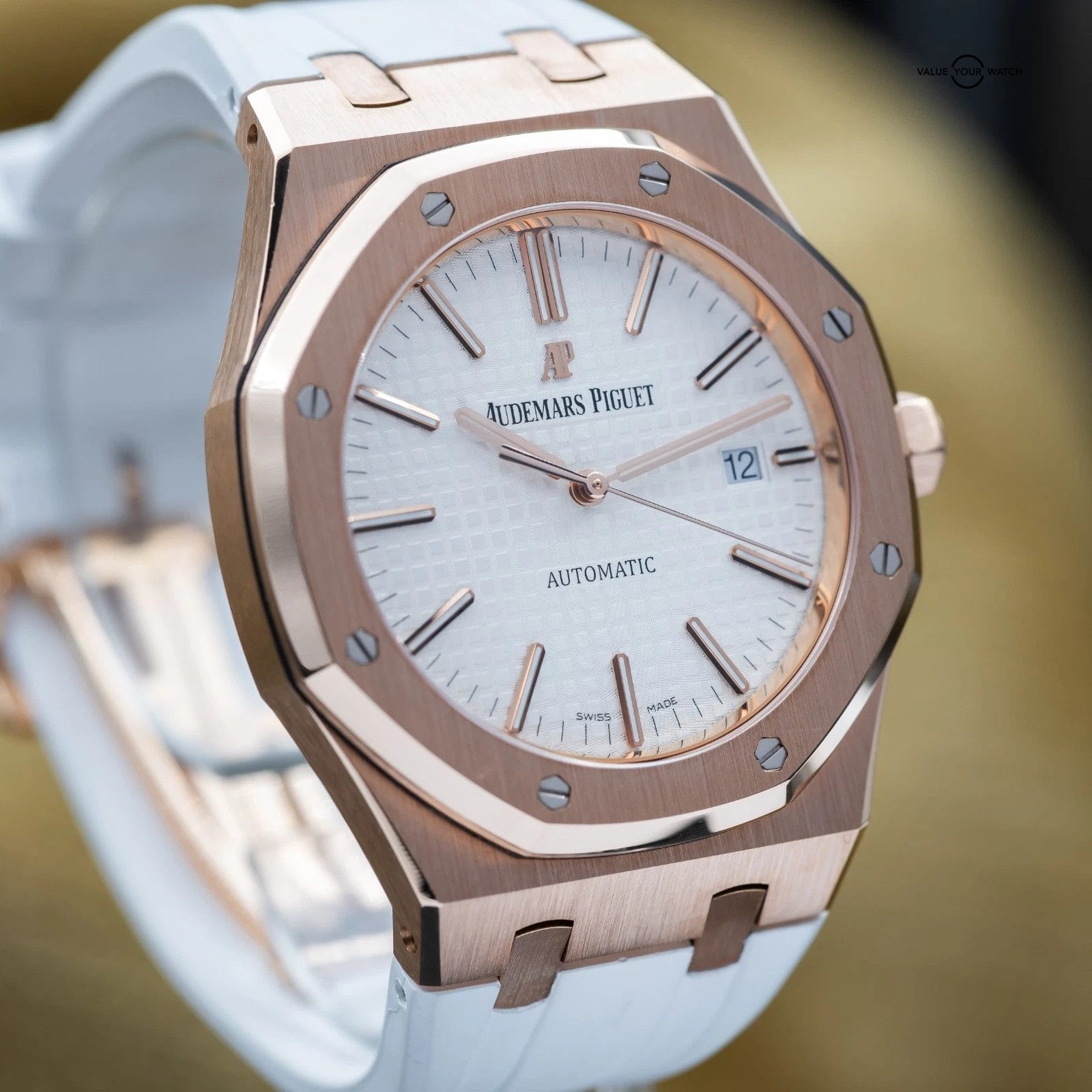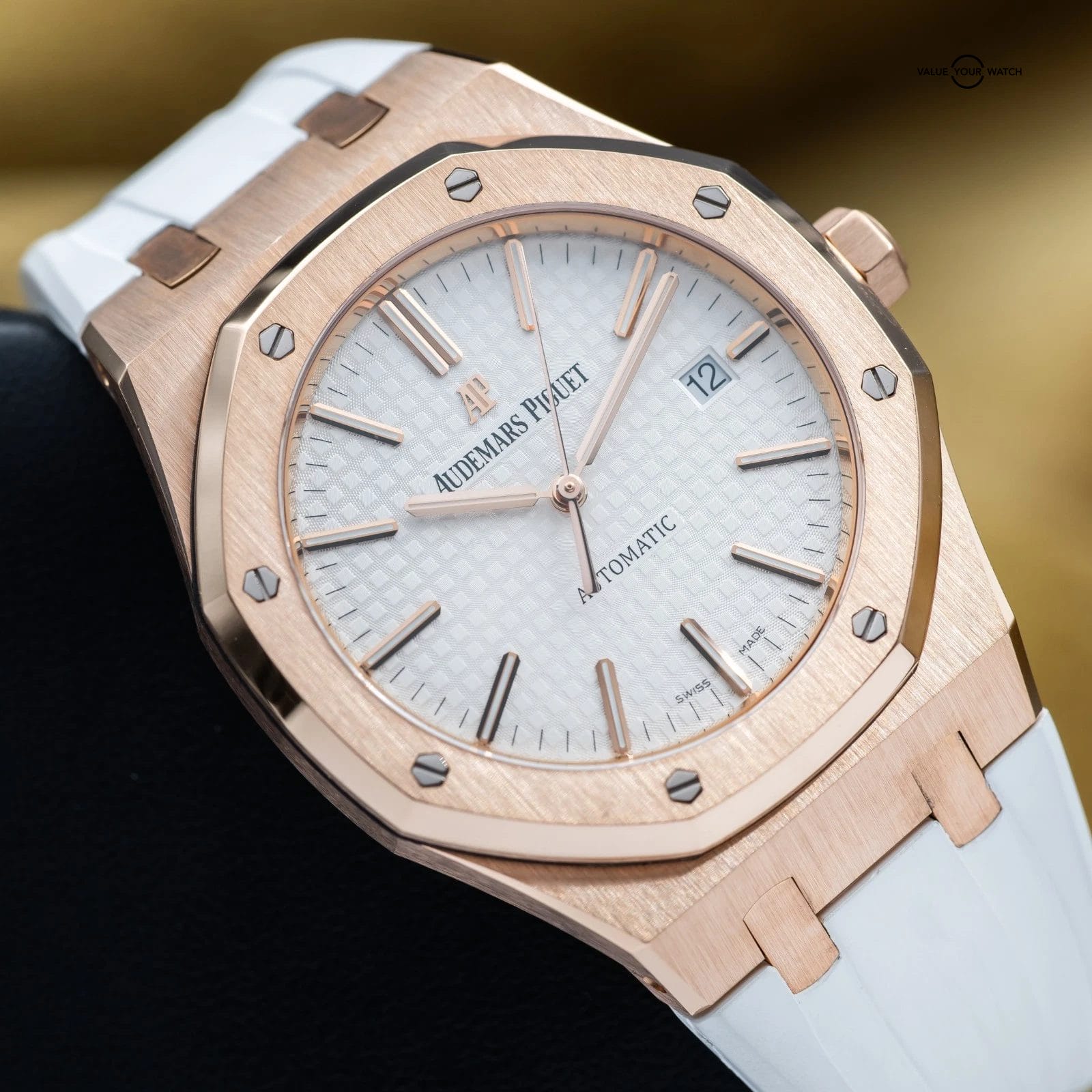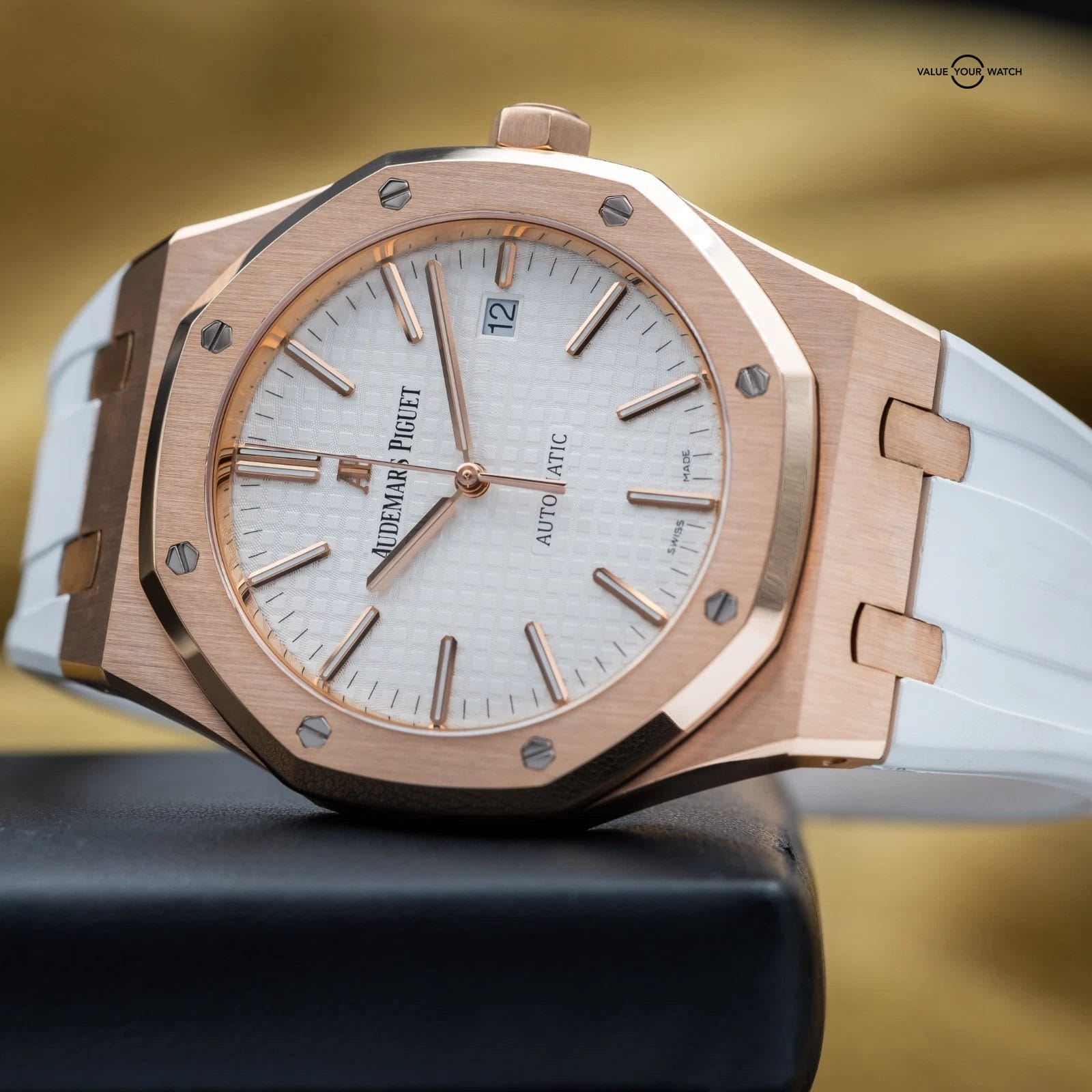 Up for sale or trade is the Royal Oak in exquisite rose gold and the stunning silver dial! A complete full set with box and all the warranty paperwork. The watch is housed in an insanely finished 18-carat gold case, which contrasts beautifully against that silver dial. Choose between a white rubber, black rubber or black leather strap. Don’t miss your chance to grab it while you can!