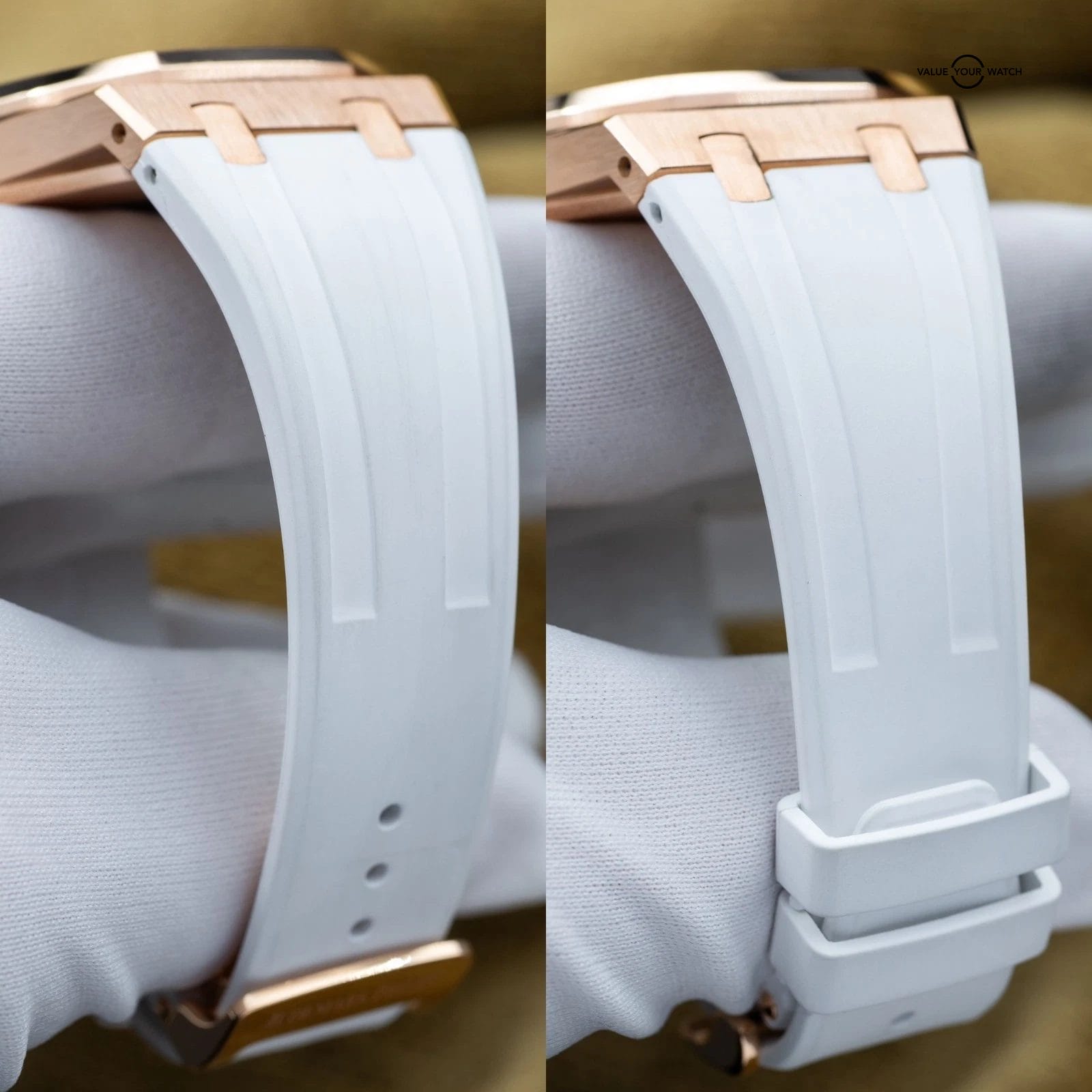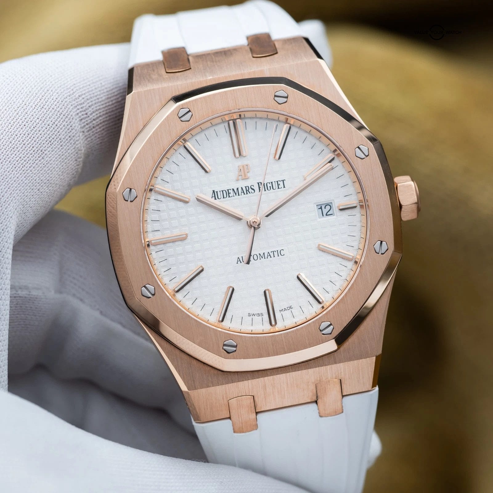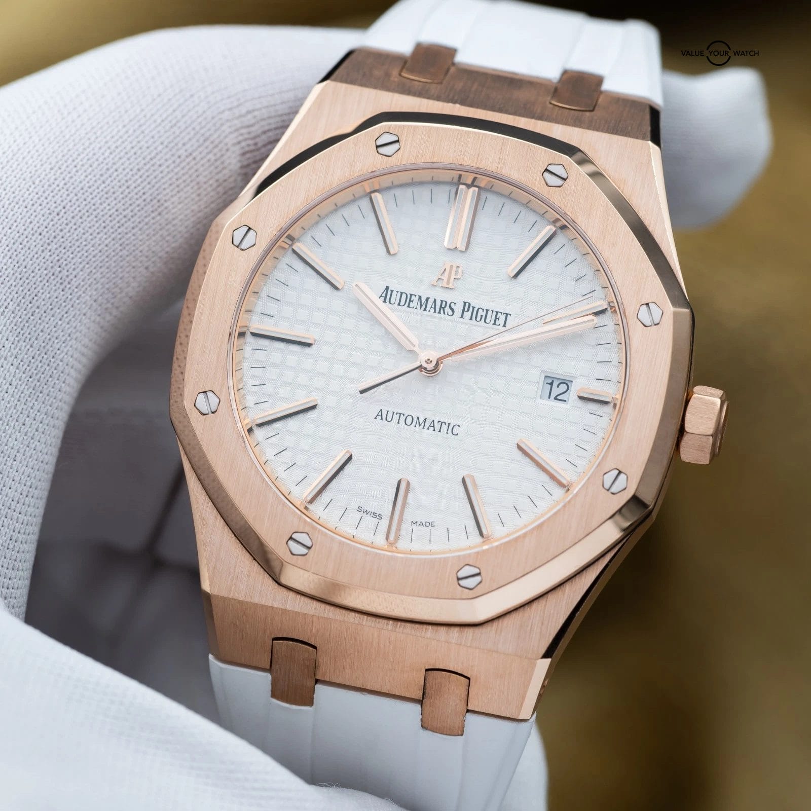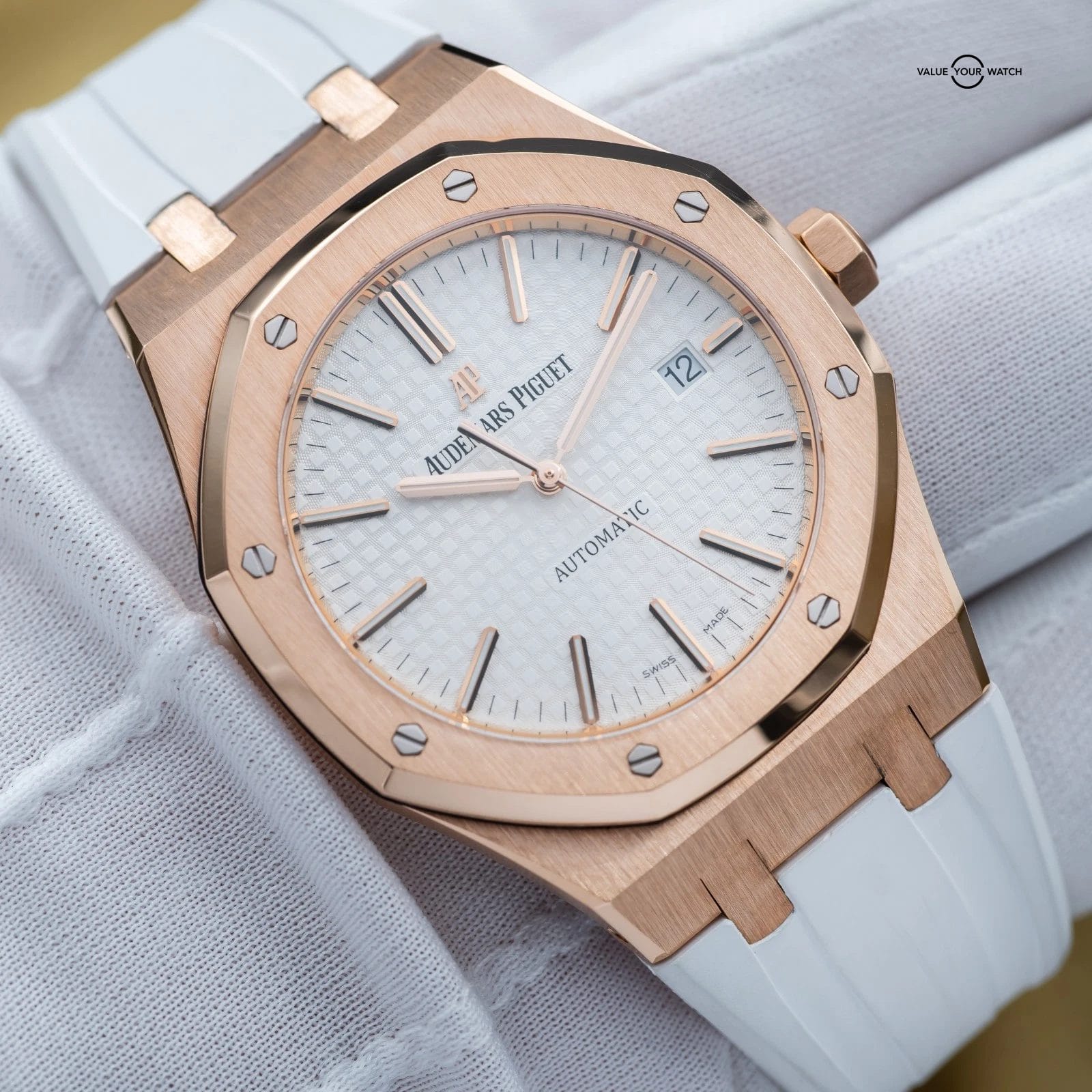 Up for sale or trade is the Royal Oak in exquisite rose gold and the stunning silver dial! A complete full set with box and all the warranty paperwork. The watch is housed in an insanely finished 18-carat gold case, which contrasts beautifully against that silver dial. Choose between a white rubber, black rubber or black leather strap. Don’t miss your chance to grab it while you can!