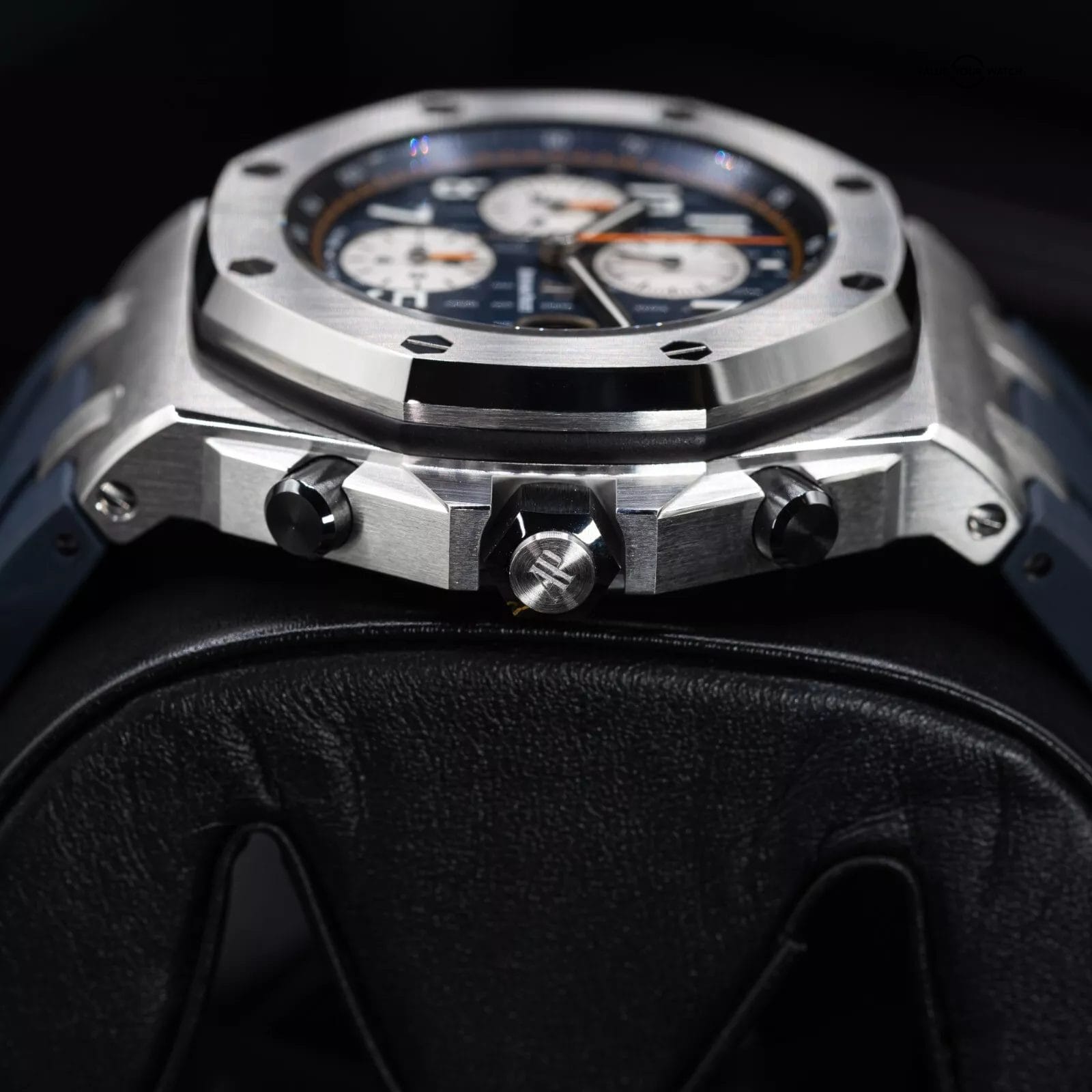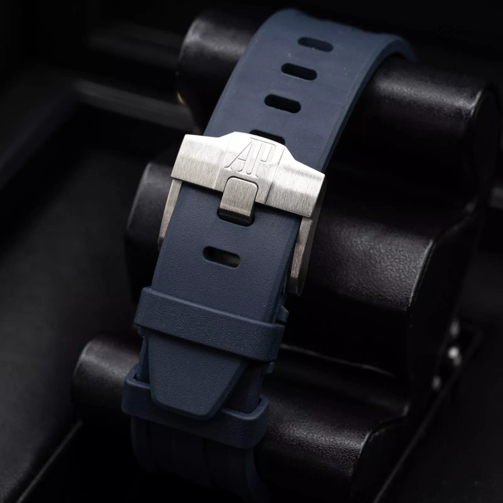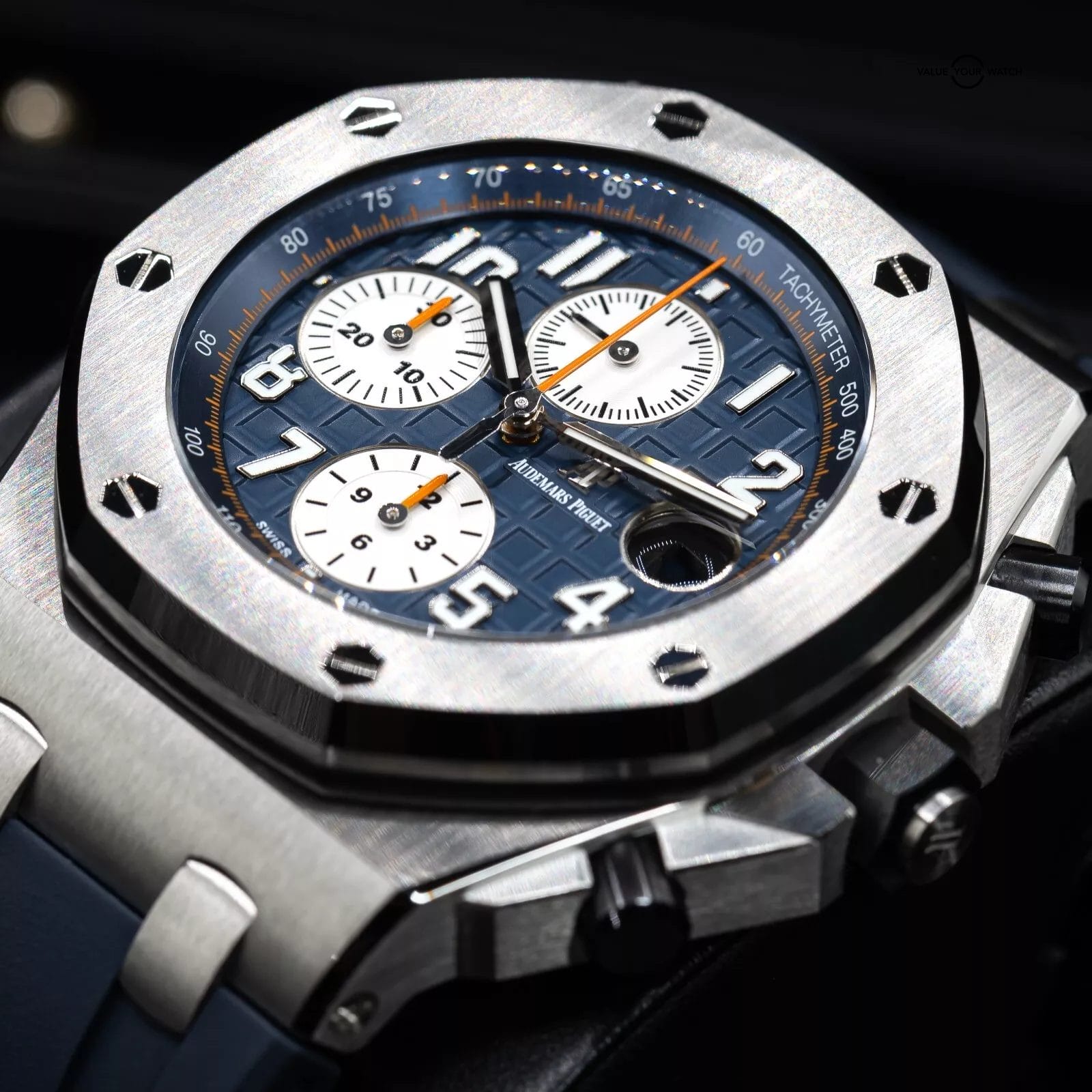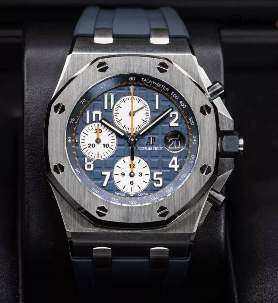 Up for sale here is an excellent example of one of the better AP Offshore variants. The blue is a very nice hue, and with the “reverse panda” look of the silver sub dials, the overall theme of the watch is incredibly well put together. Ref. 26470ST.
