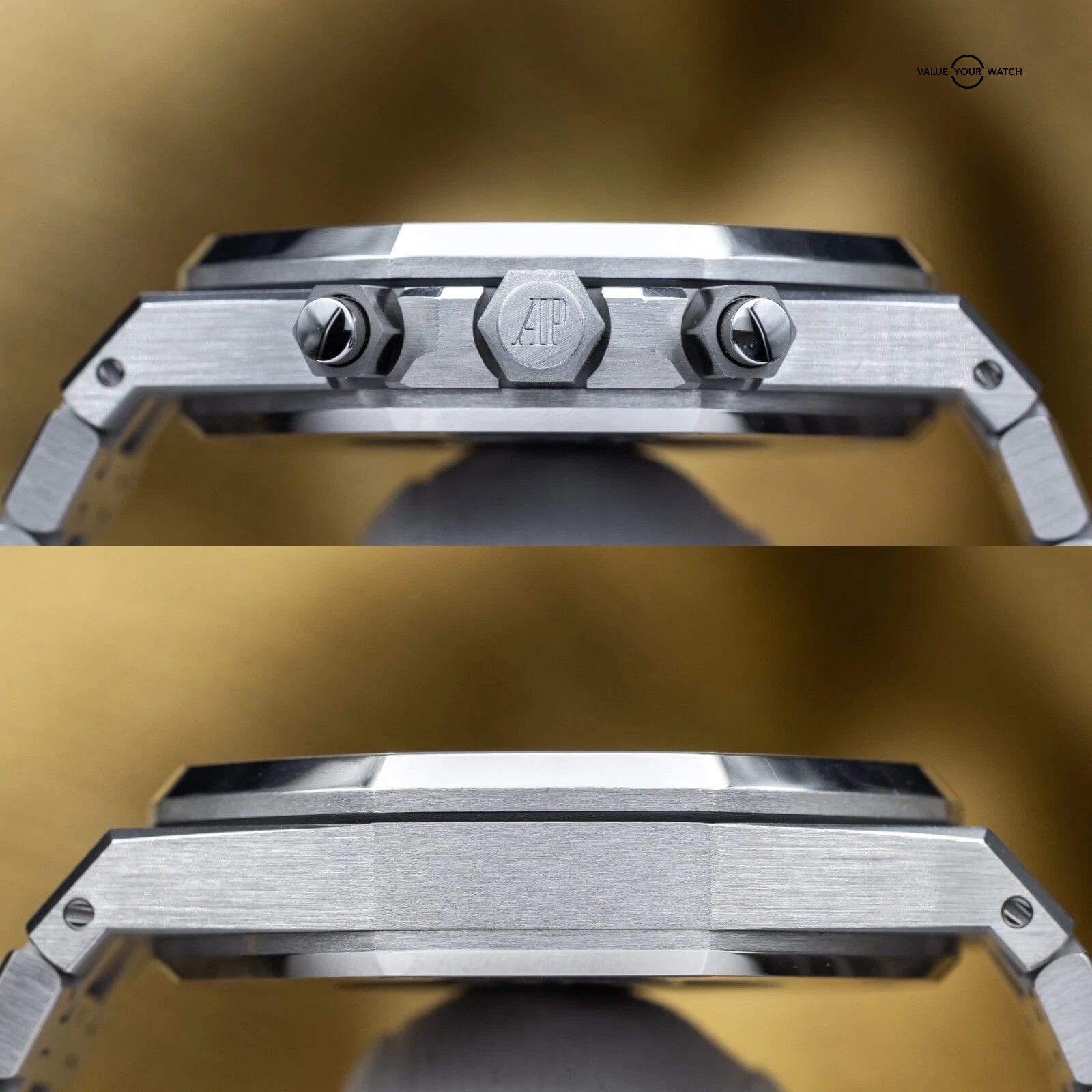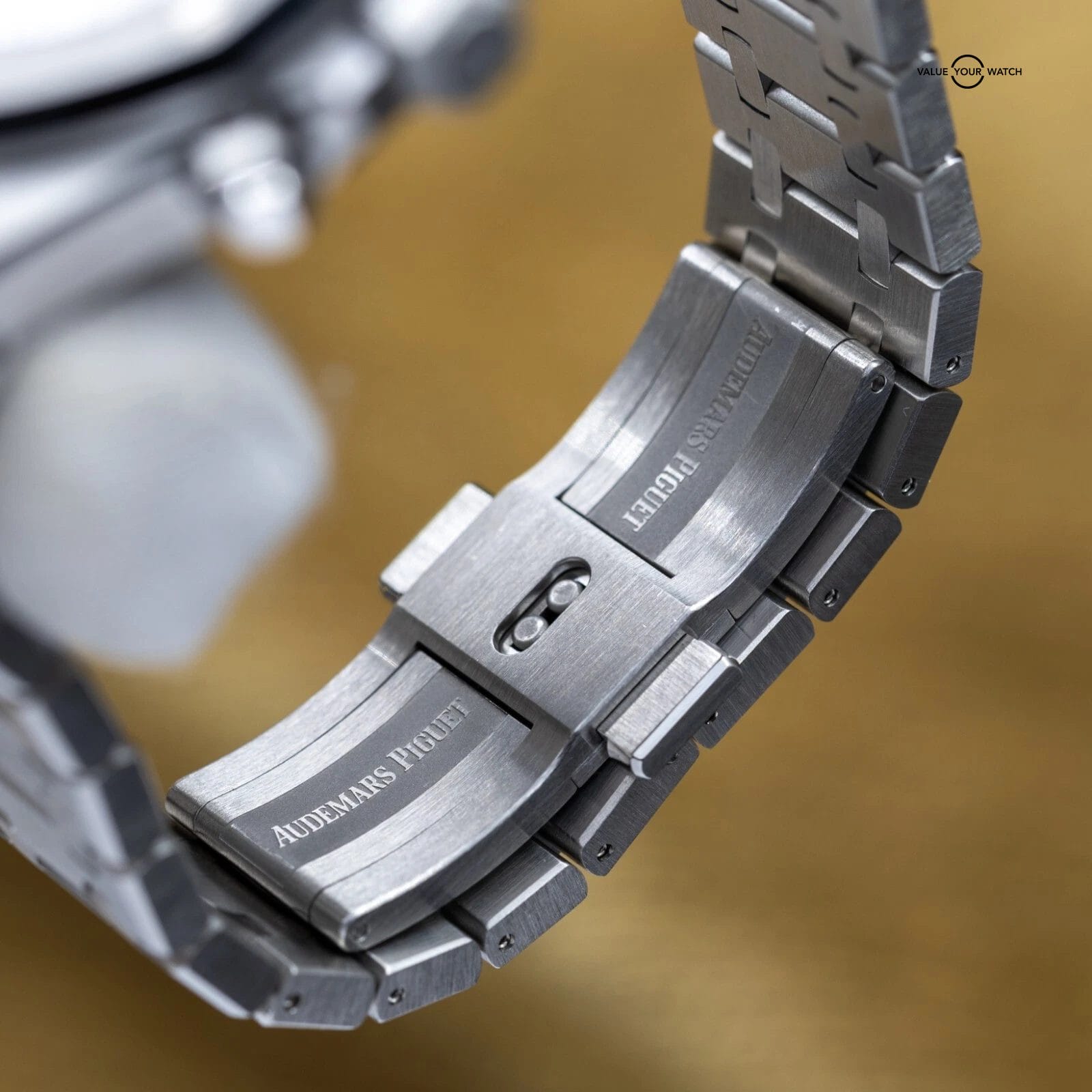 Included are the original inner and outer boxes, AP archive papers and all original bracelet links from 2021 purchase. Watch was just serviced by AP so is in complete working order and keeping great time and even comes with a two-year AP service warranty. The case, crystal and buckle are in absolutely stunning mint condition. Don’t miss your chance to get the AP Royal Oak Chronograph you’ve always wanted!