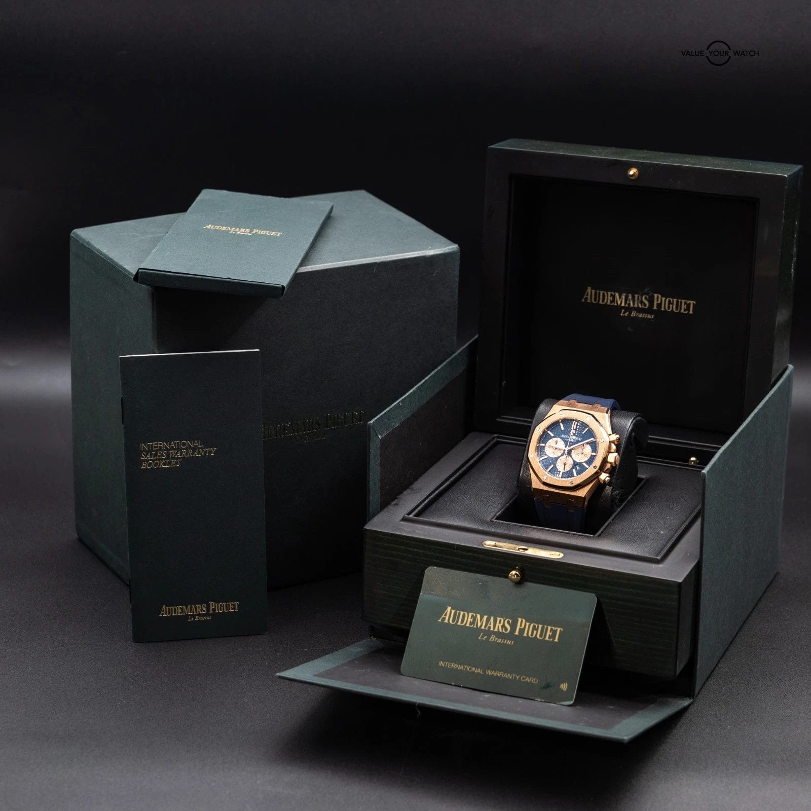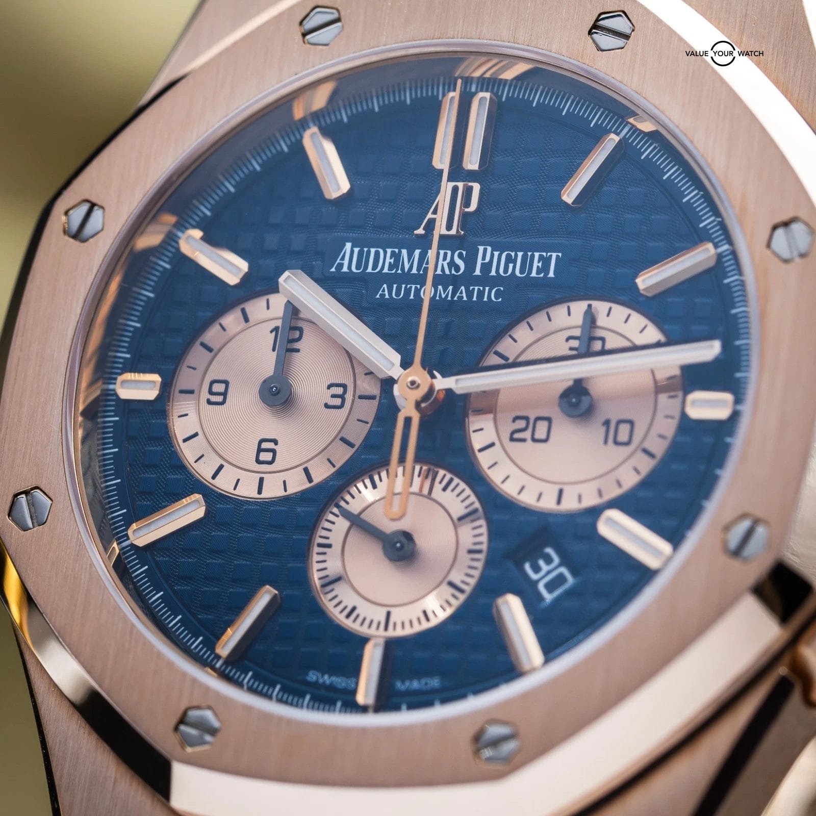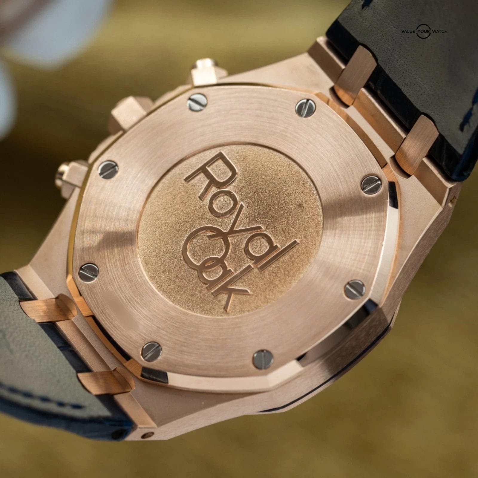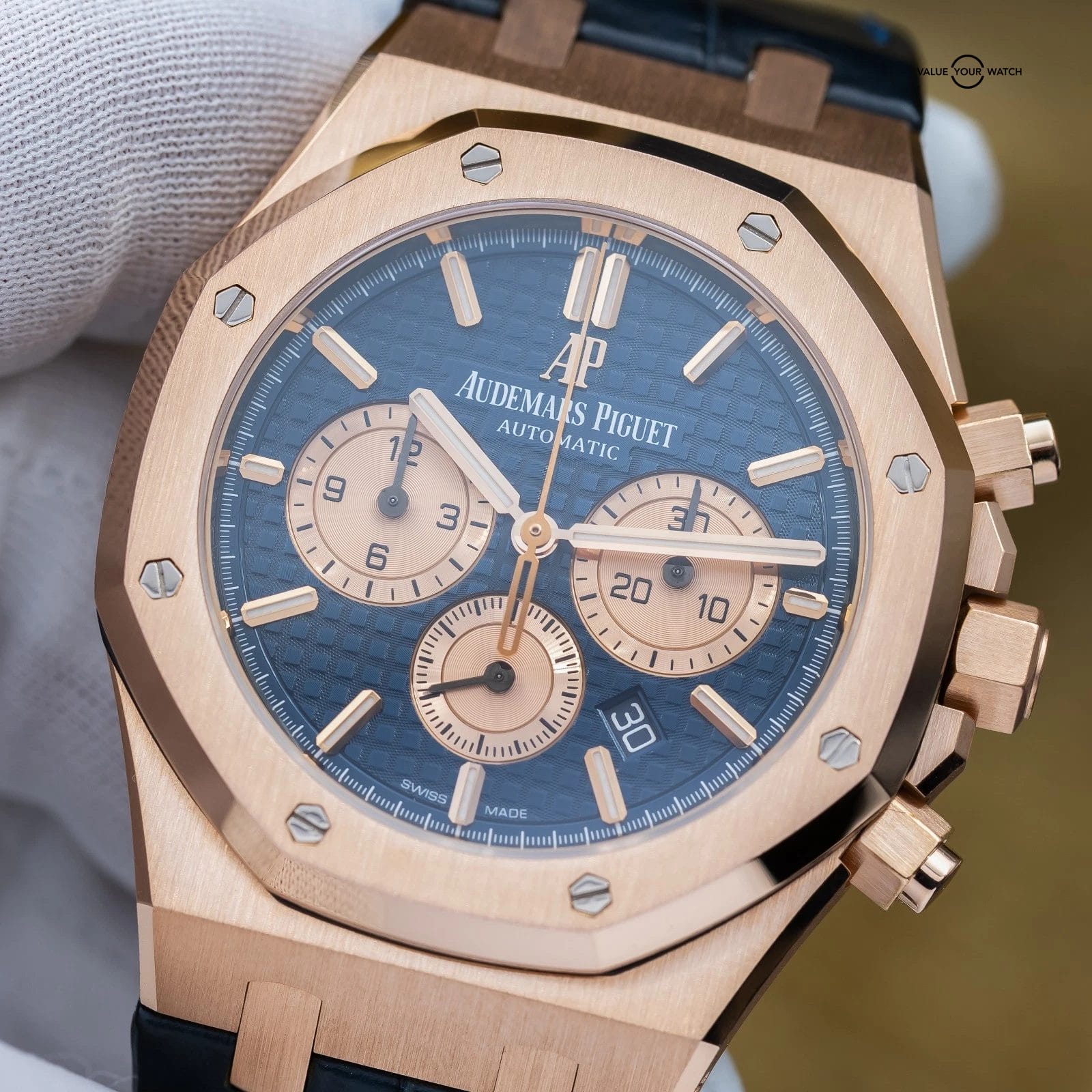 Up for sale or trade is the Royal Oak Chronograph, which features a captivating blue and rose gold design. It’s housed in a beautifully crafted 18-carat gold case that showcases Audemars Piguet’s signature octagonal bezel. The gorgeous blue “Méga Tapisserie” dial is the perfect complement to the brilliant rose gold throughout. The self-winding mechanical movement with a power reserve of up to 50 hours ensures reliability and accuracy. This timepiece is ideal for those who desire a statement piece that seamlessly blends elegance with functionality in one of AP’s most sought-after configurations.