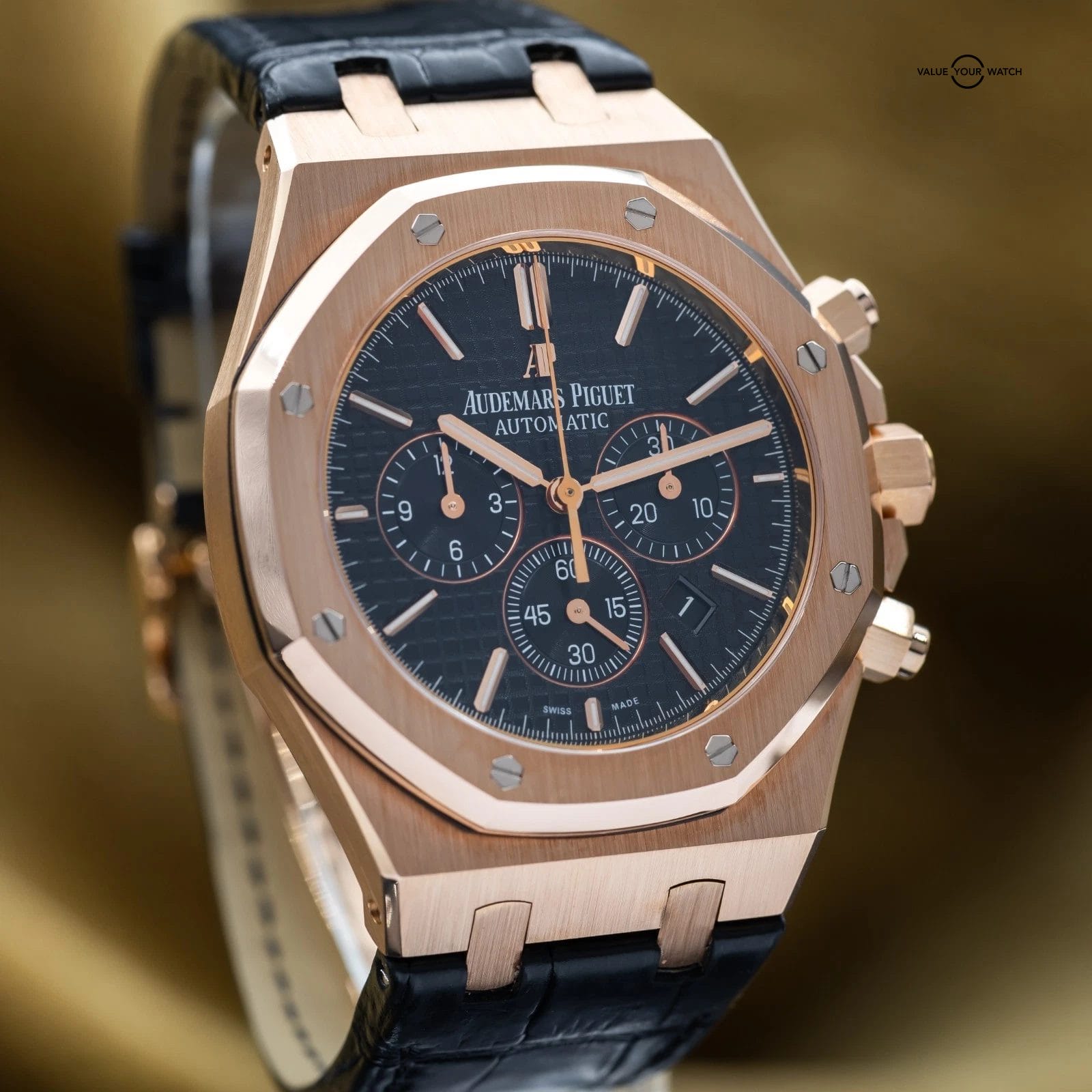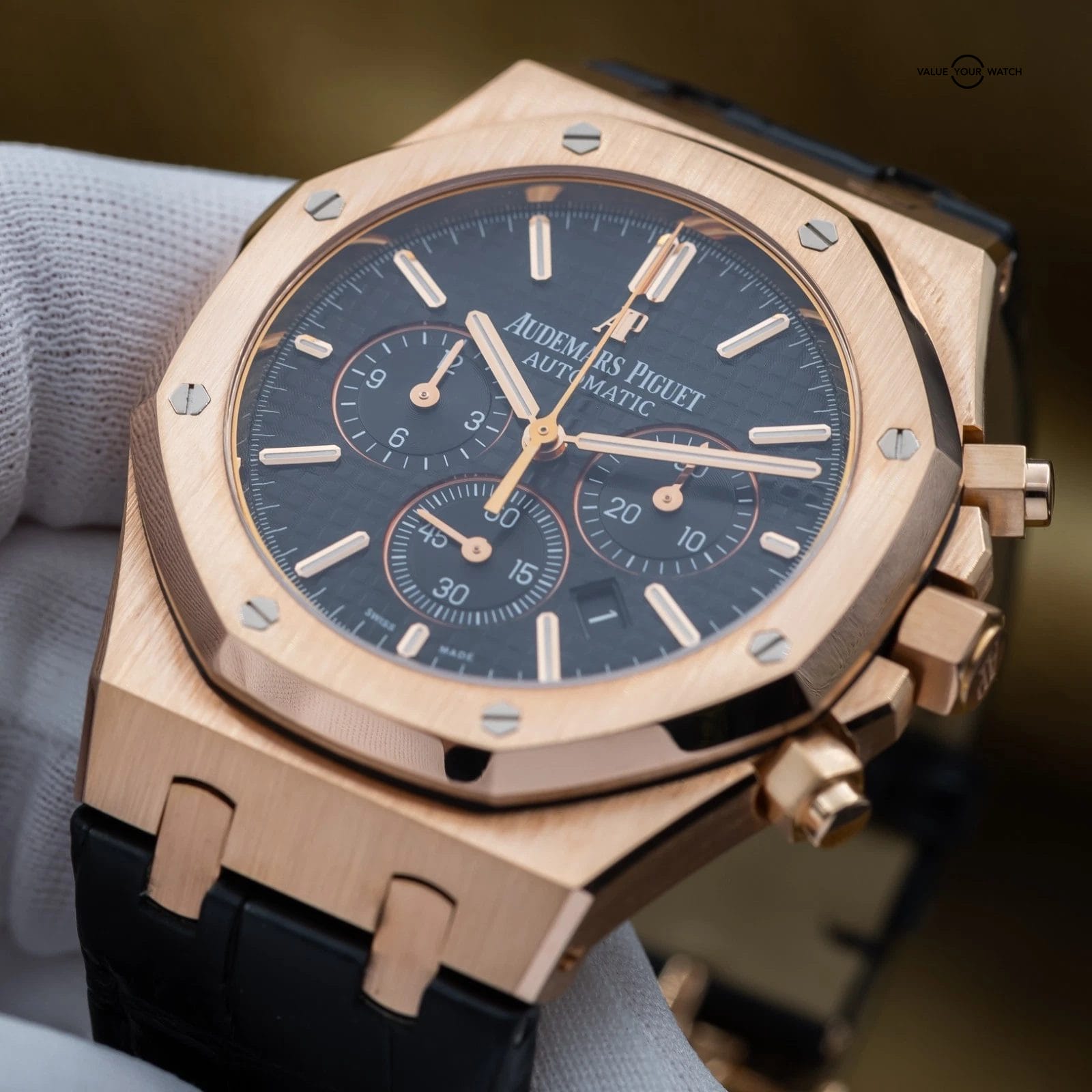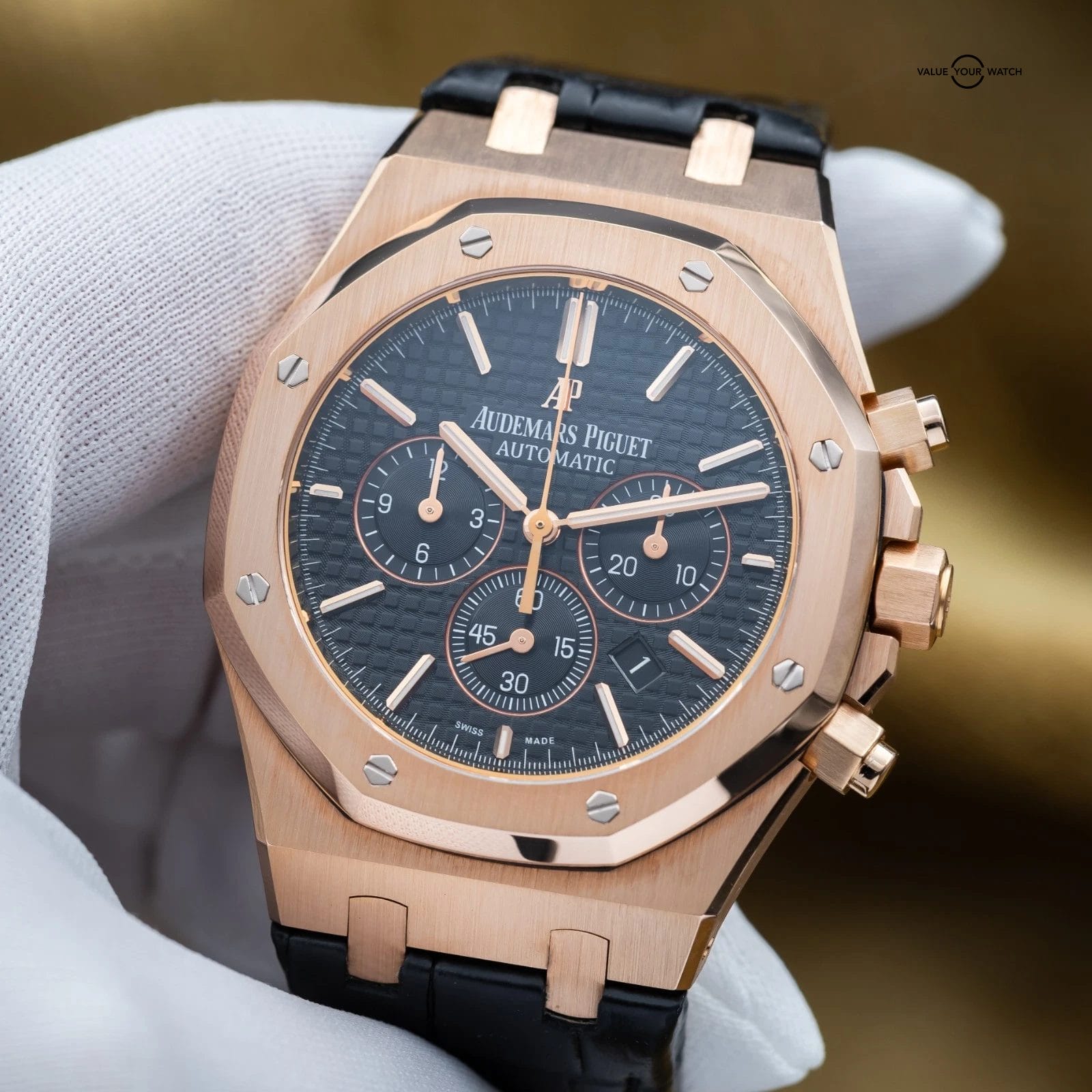 The Audemars Piguet Royal Oak Chronograph sits at the intersection of sport and formal design, representing one of the most enduring expressions of the integrated luxury sports watch category. This example, rendered in rose gold with a black dial and paired to a leather strap, presents a more understated and deliberate interpretation of the Royal Oak than its full-bracelet counterparts. In daily wear, it offers the presence and substance of precious metal while maintaining comfort and versatility through its strap configuration and chronograph functionality. Within a collection, it serves as a strong anchor piece for a collector seeking a Royal Oak that leans luxury rather than overtly sporty. The combination of rose gold, black dial, and strap shifts the watch toward a more understated, almost dress-oriented profile, distinguishing it from more common steel executions.