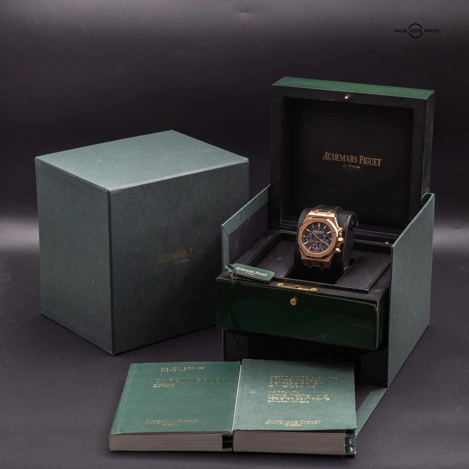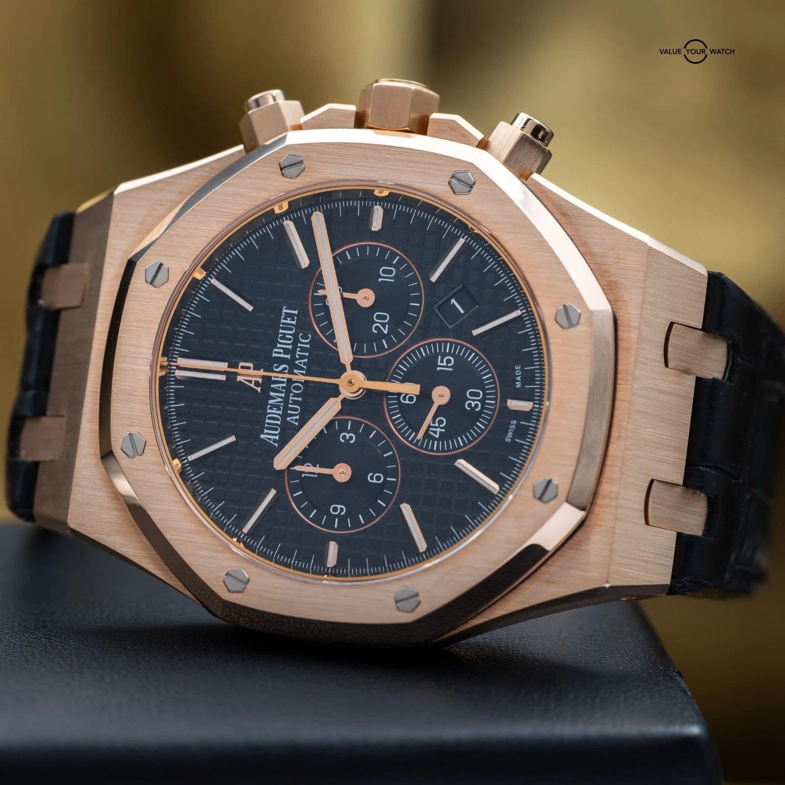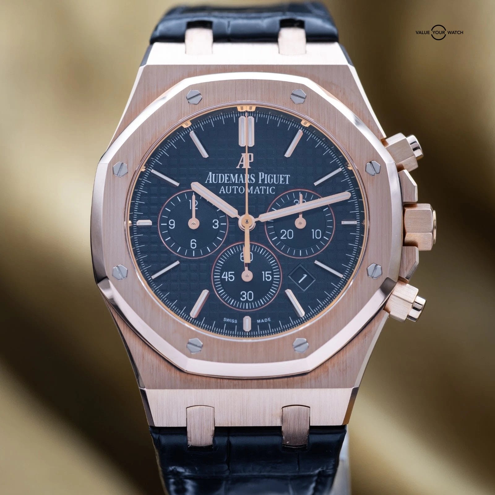 The Audemars Piguet Royal Oak Chronograph sits at the intersection of sport and formal design, representing one of the most enduring expressions of the integrated luxury sports watch category. This example, rendered in rose gold with a black dial and paired to a leather strap, presents a more understated and deliberate interpretation of the Royal Oak than its full-bracelet counterparts. In daily wear, it offers the presence and substance of precious metal while maintaining comfort and versatility through its strap configuration and chronograph functionality. Within a collection, it serves as a strong anchor piece for a collector seeking a Royal Oak that leans luxury rather than overtly sporty. The combination of rose gold, black dial, and strap shifts the watch toward a more understated, almost dress-oriented profile, distinguishing it from more common steel executions.