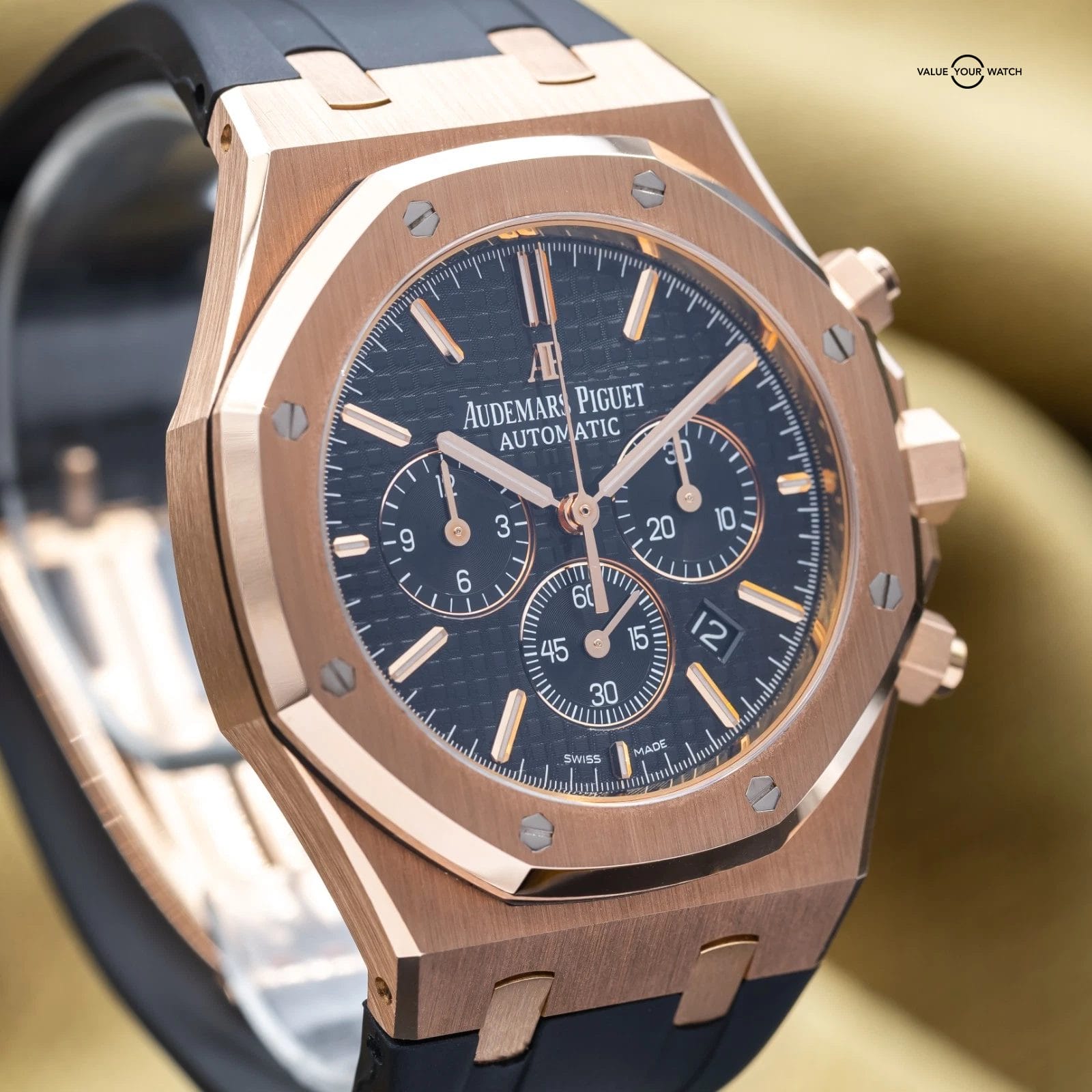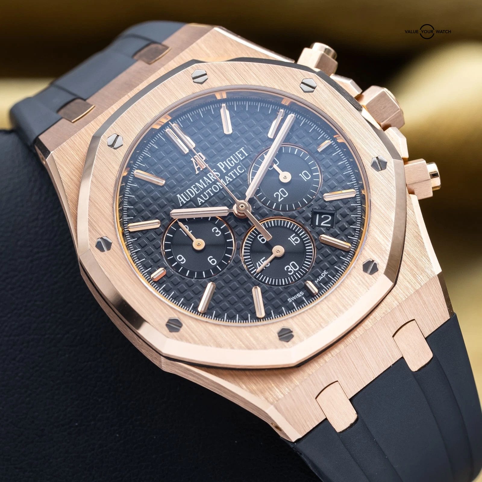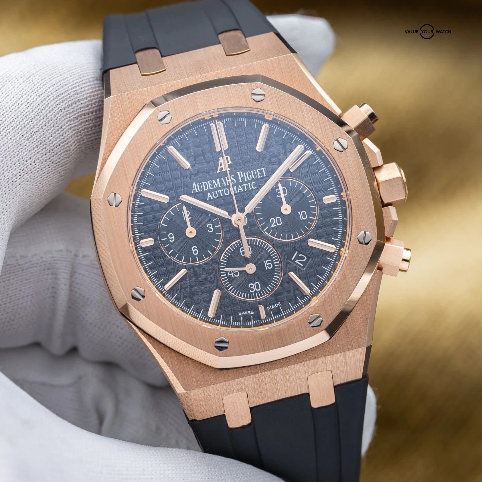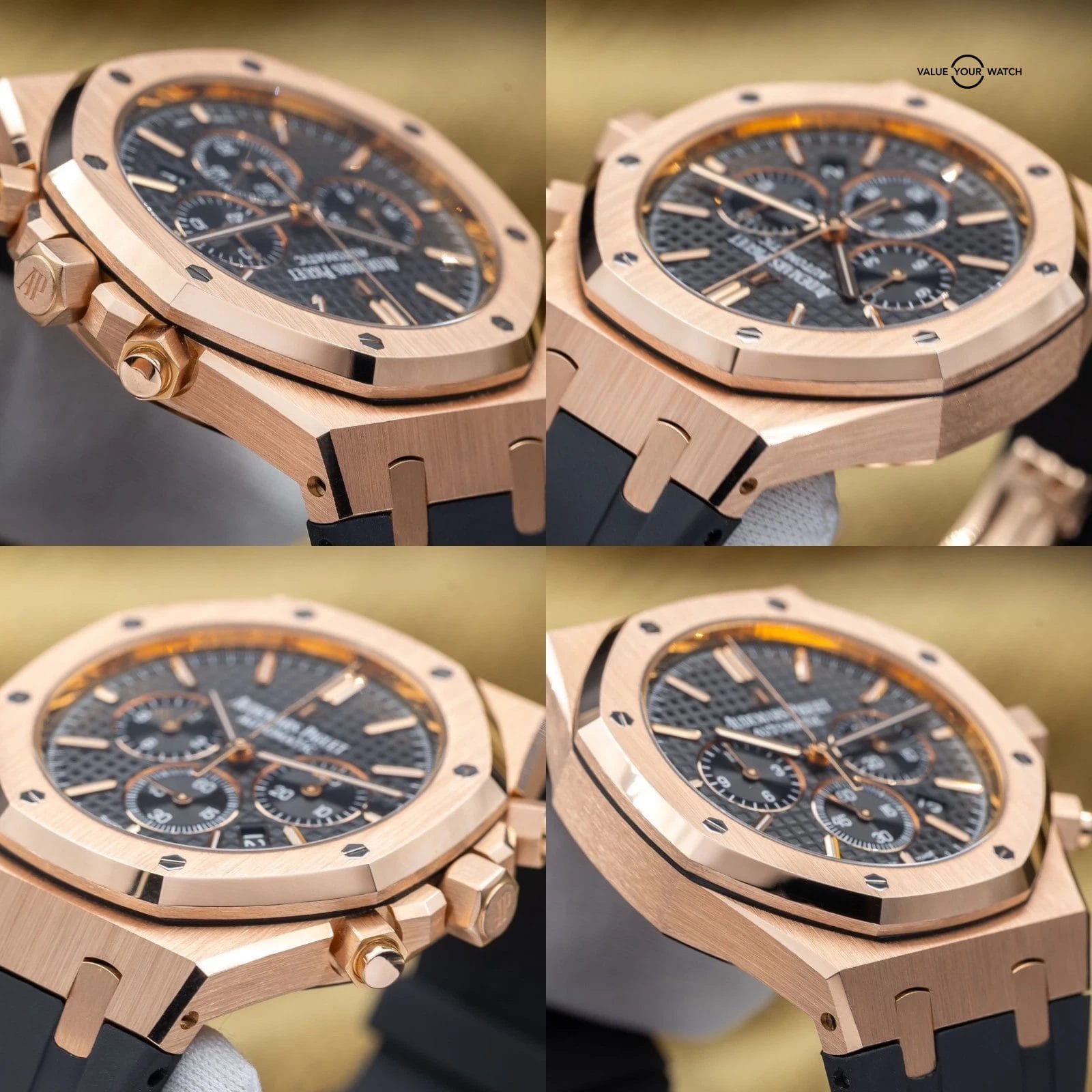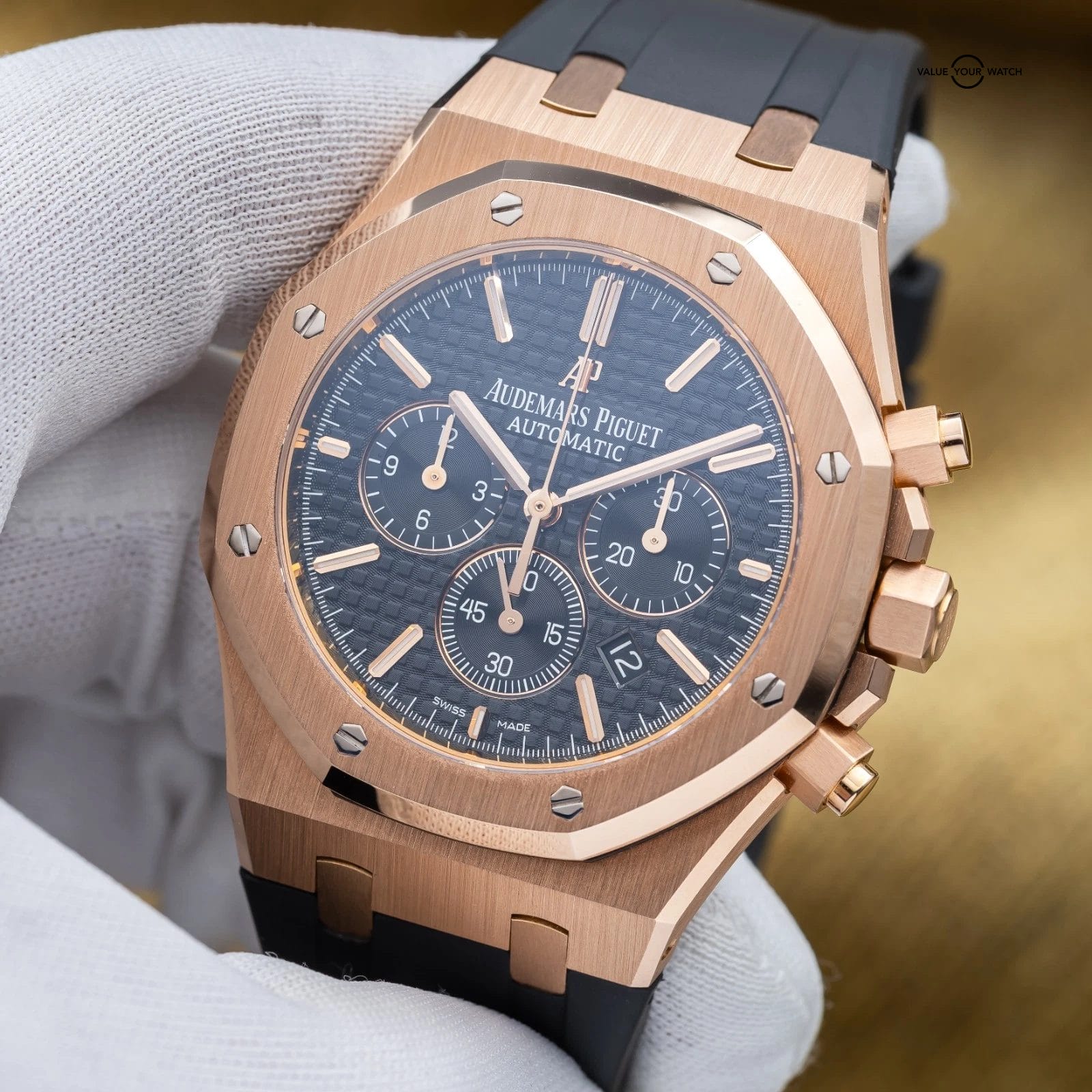 Grail alert! Up for sale or trade is the Royal Oak Offshore Chronograph in exquisite rose gold. It’s housed in an insanely finished 18-carat gold case that showcases Audemars Piguet’s signature octagonal bezel. The iconic “Tapisserie” pattern adds depth and texture, and the rose gold bracelet complements the case, creating a cohesive and sophisticated look. Each element of this timepiece, from its polished surfaces to its intricate details, reflects the brand’s commitment to excellence. This timepiece is ideal for those who desire a statement piece that seamlessly blends elegance with functionality in one of AP’s most sought-after configurations.