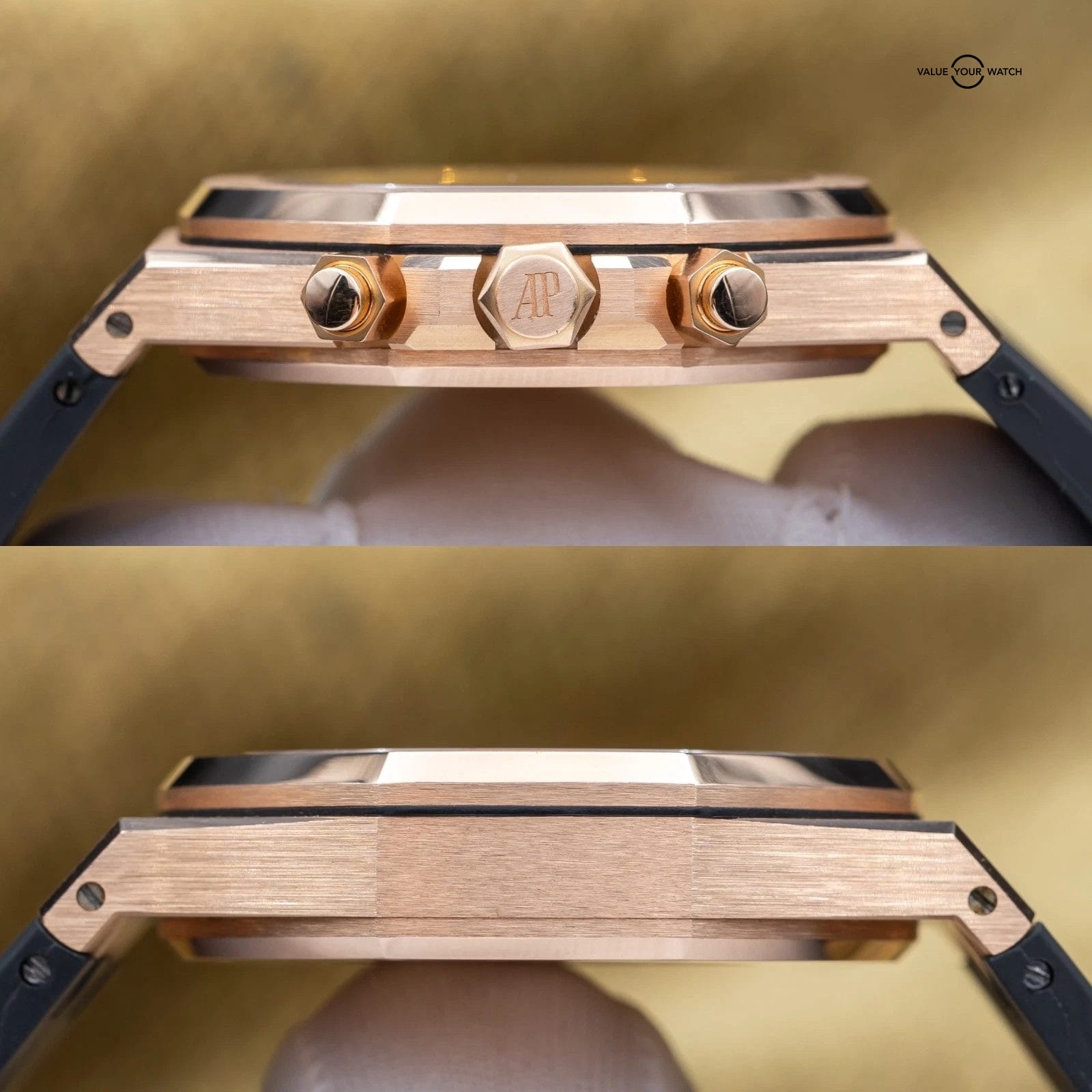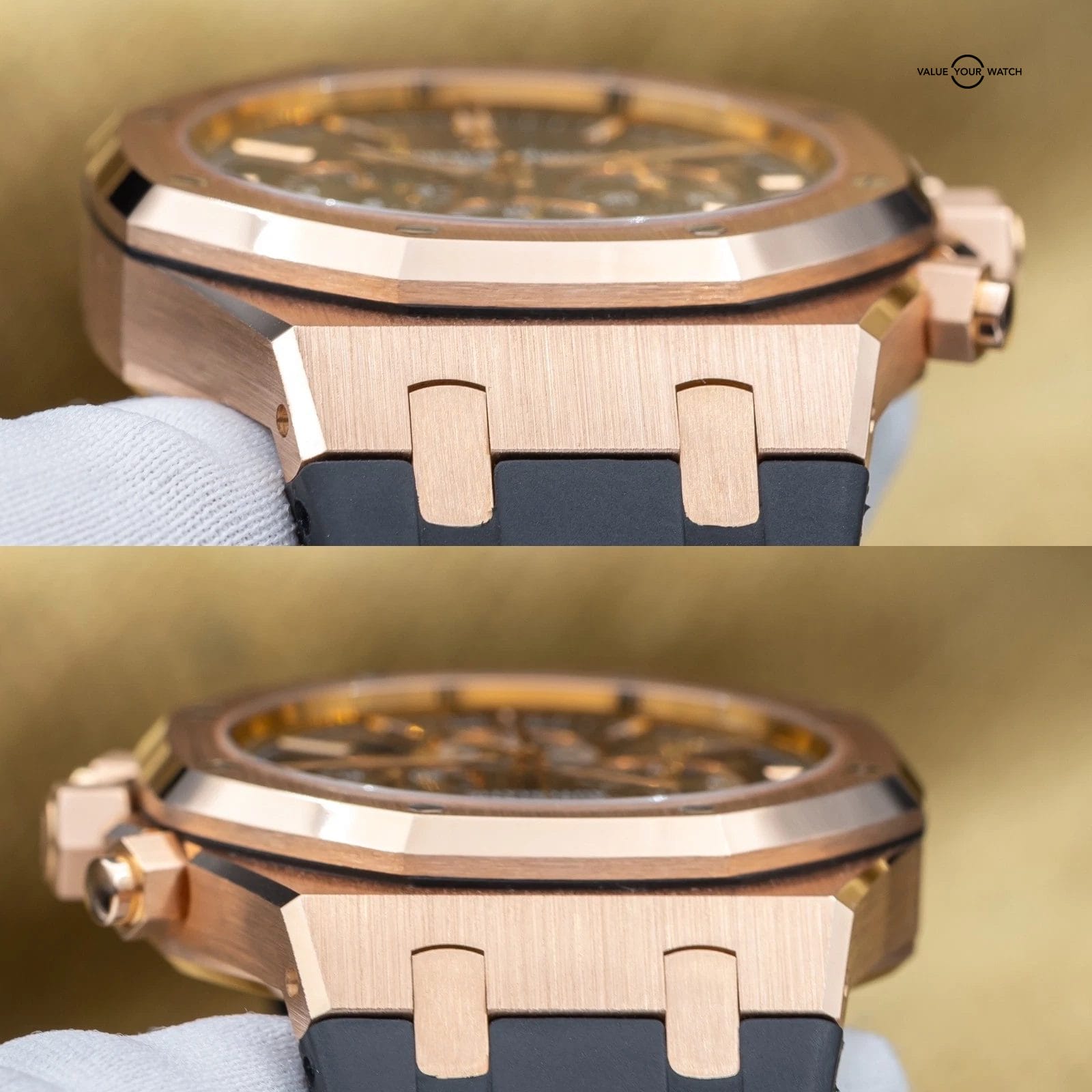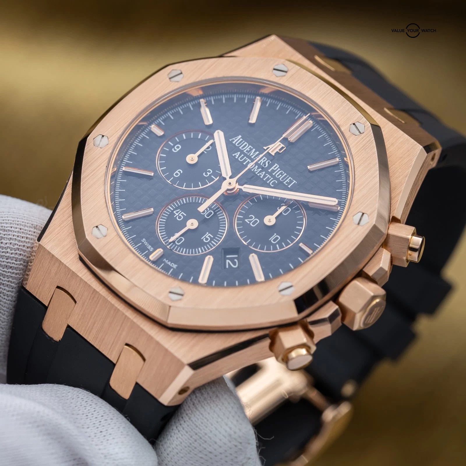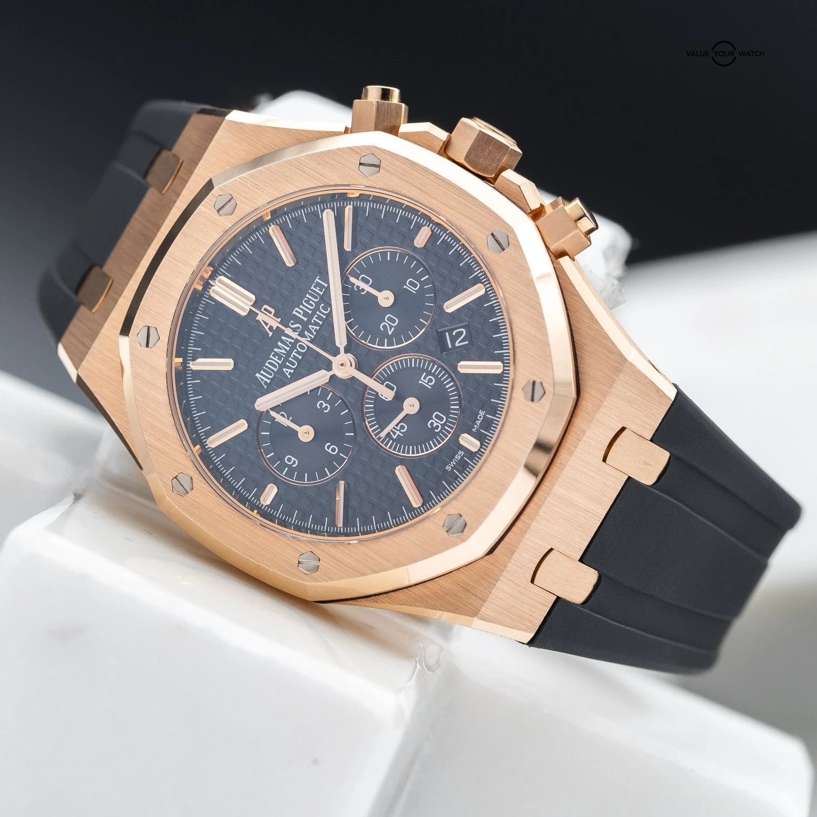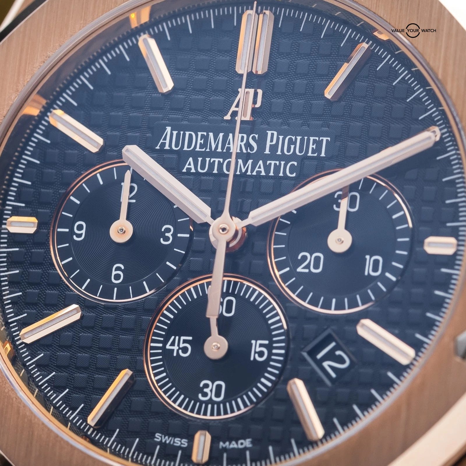 Grail alert! Up for sale or trade is the Royal Oak Offshore Chronograph in exquisite rose gold. It’s housed in an insanely finished 18-carat gold case that showcases Audemars Piguet’s signature octagonal bezel. The iconic “Tapisserie” pattern adds depth and texture, and the rose gold bracelet complements the case, creating a cohesive and sophisticated look. Each element of this timepiece, from its polished surfaces to its intricate details, reflects the brand’s commitment to excellence. This timepiece is ideal for those who desire a statement piece that seamlessly blends elegance with functionality in one of AP’s most sought-after configurations.
