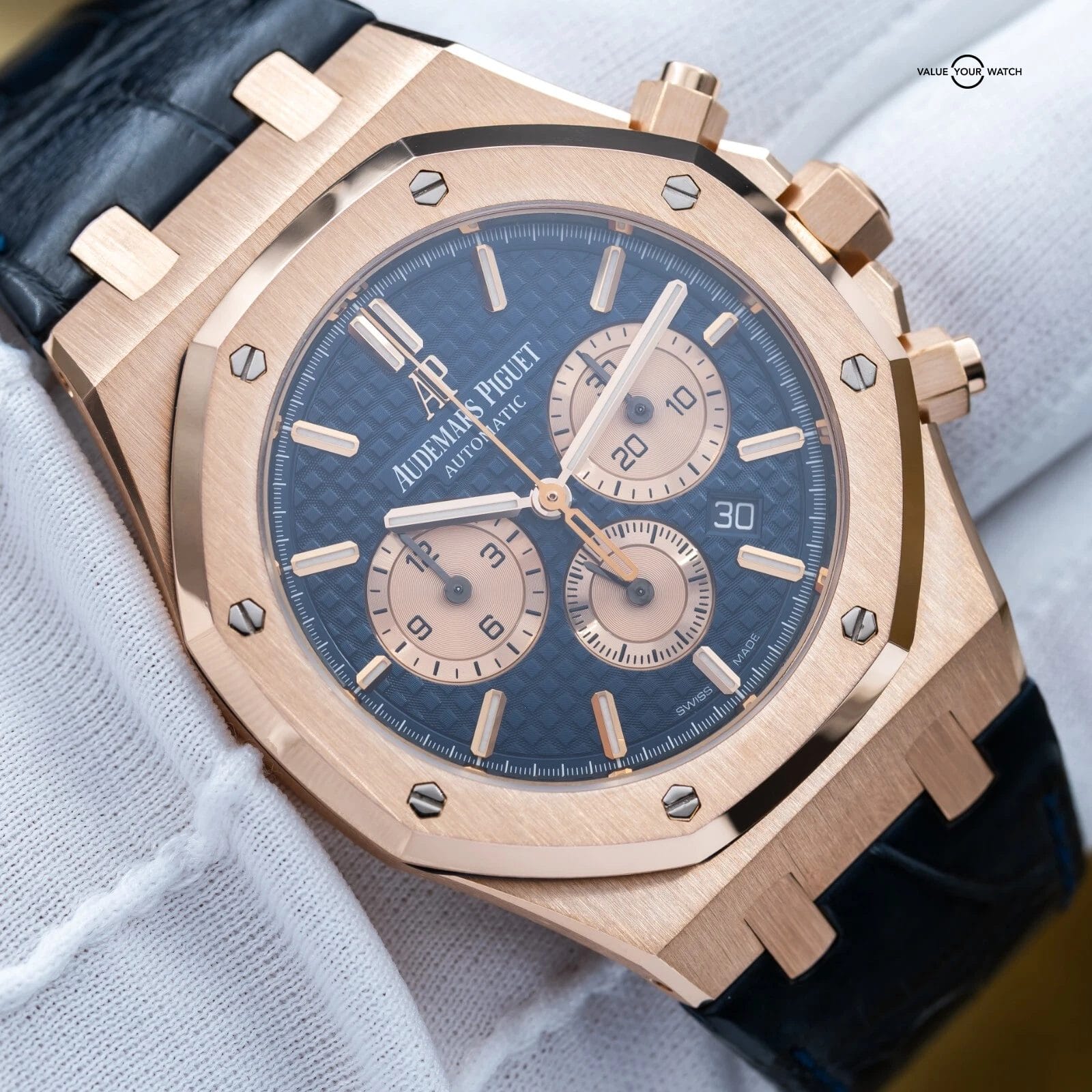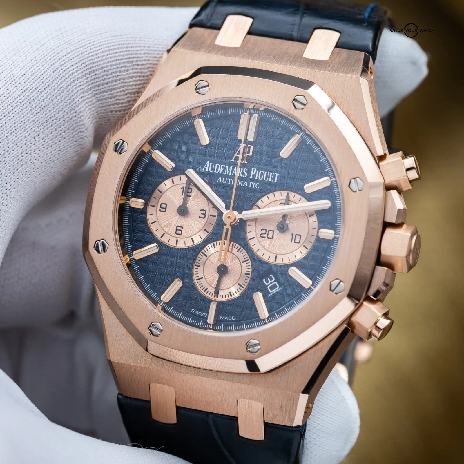 Specification: Audemars Piguet Royal Oak Chronograph 41mm Rose Gold 26331OR Blue Dial Full Set