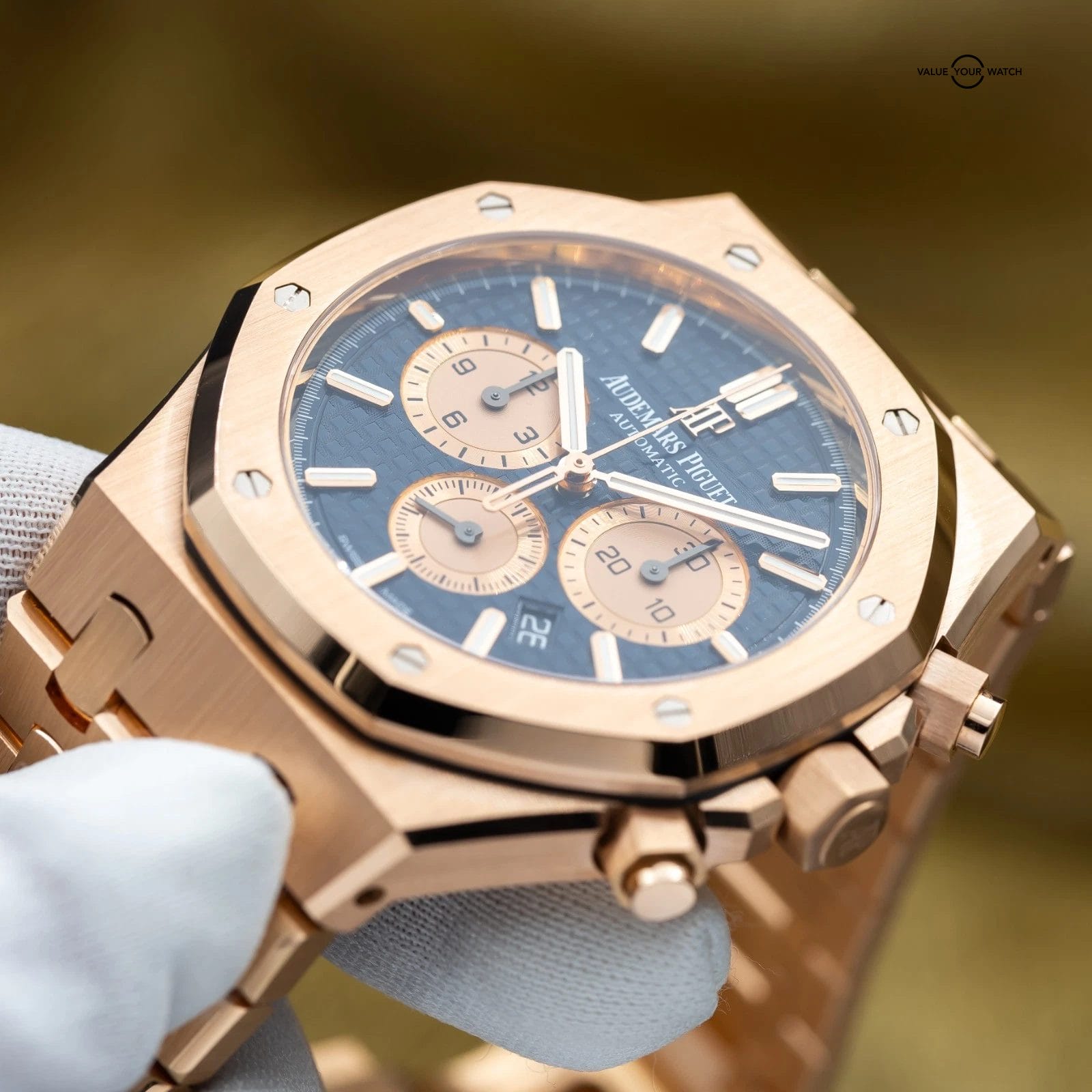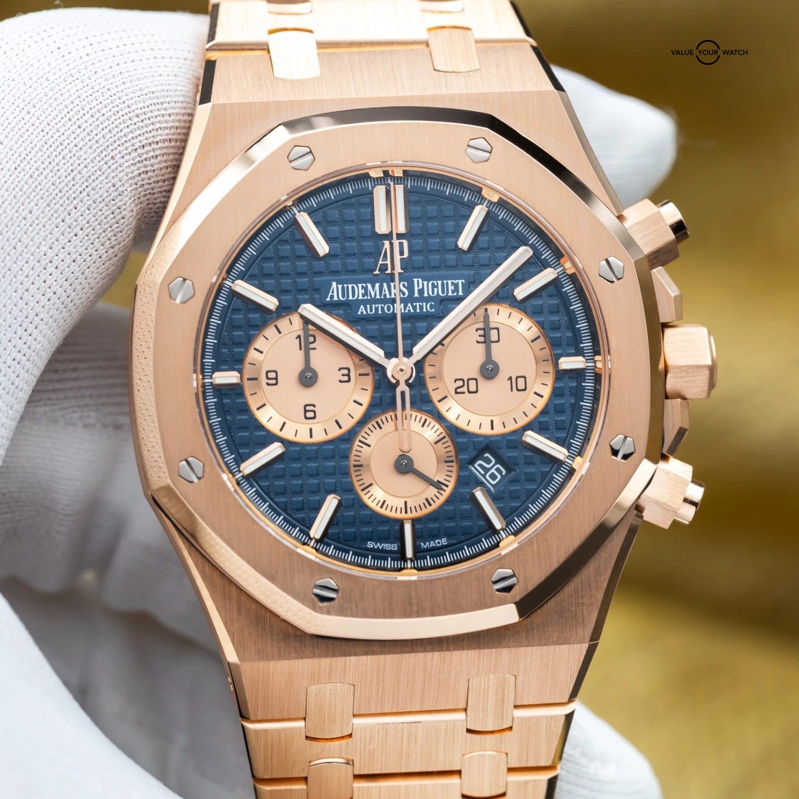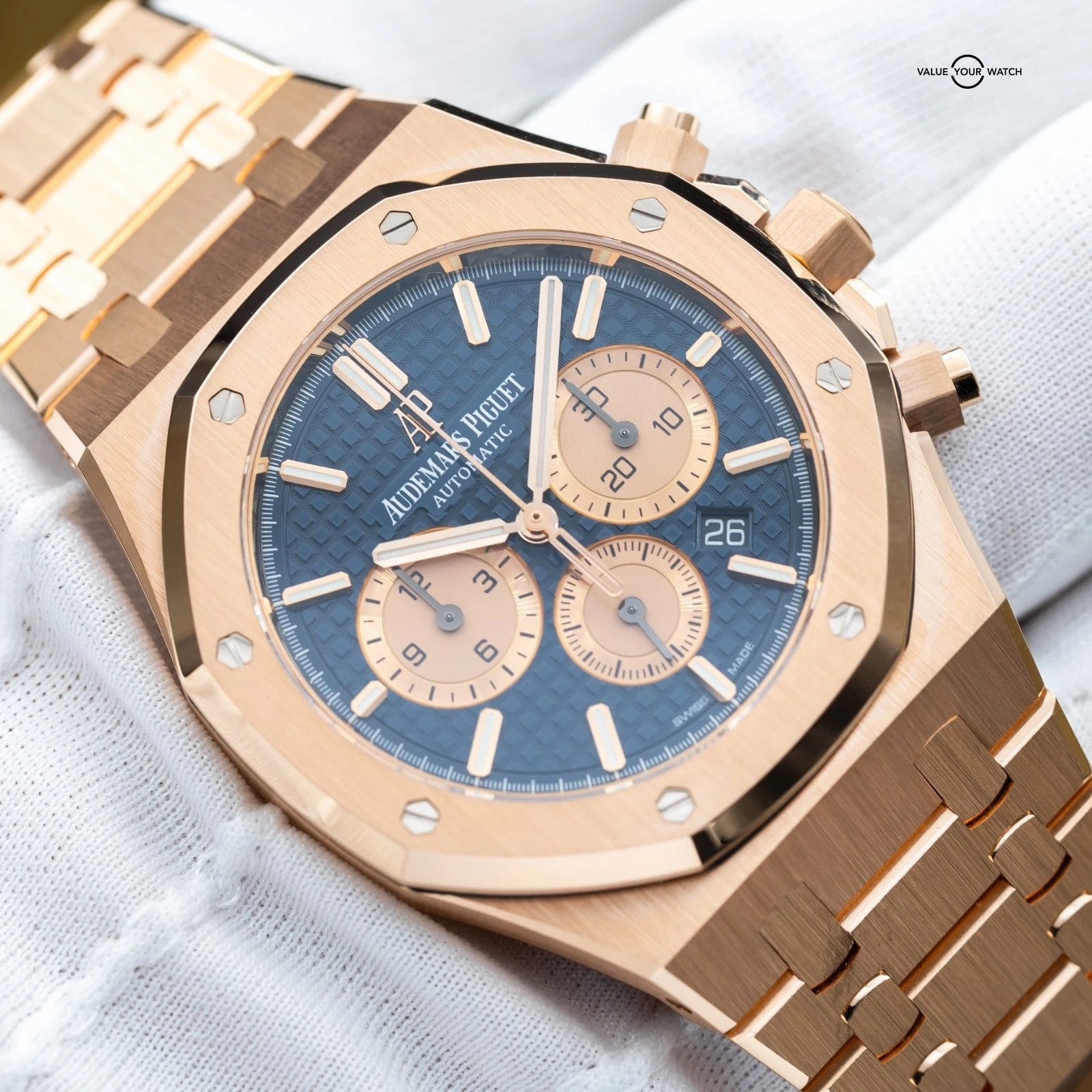 Grail alert! Up for sale or trade is the Royal Oak Chronograph with the highly desirable blue dial against exquisite rose gold. You won’t see many of these! It’s housed in an insanely finished 18-carat gold case and matching bracelet finished to the highest quality AP knows how to do. This piece comes on a factory AP bracelet with all the links, as well as the blue leather strap, rose gold deployant clasp, and with gold mounts/plots to be able to mount the strap to the watch. This gives you the ability to mix and match the look to your liking.