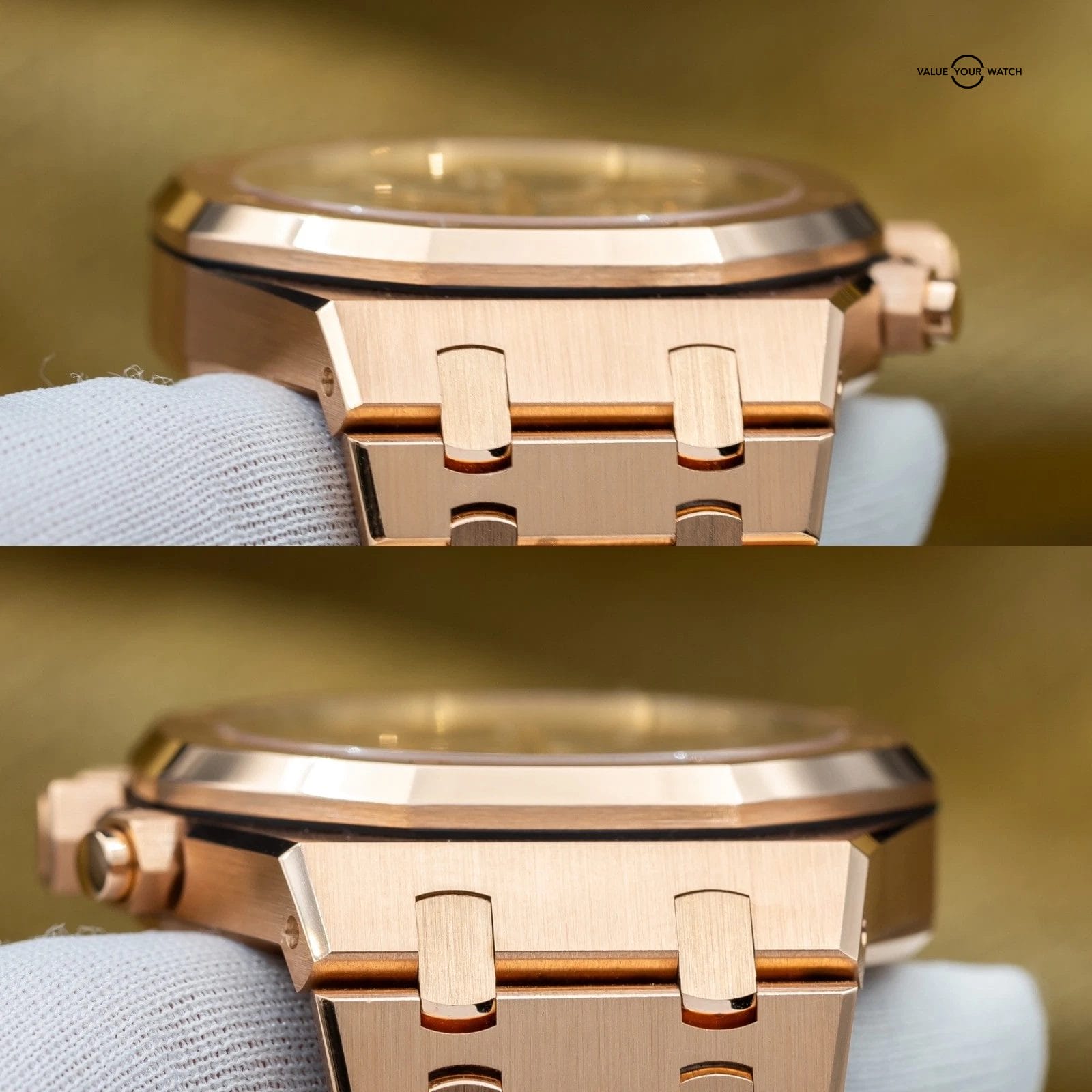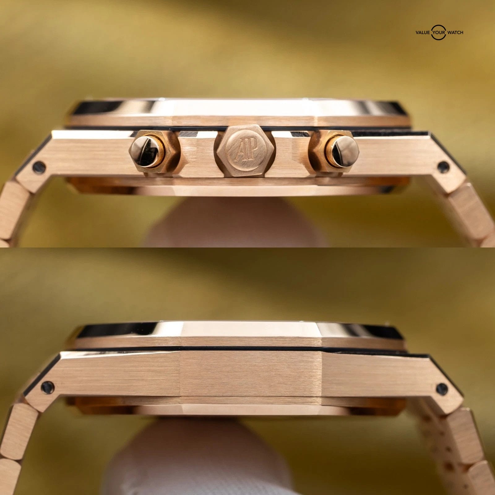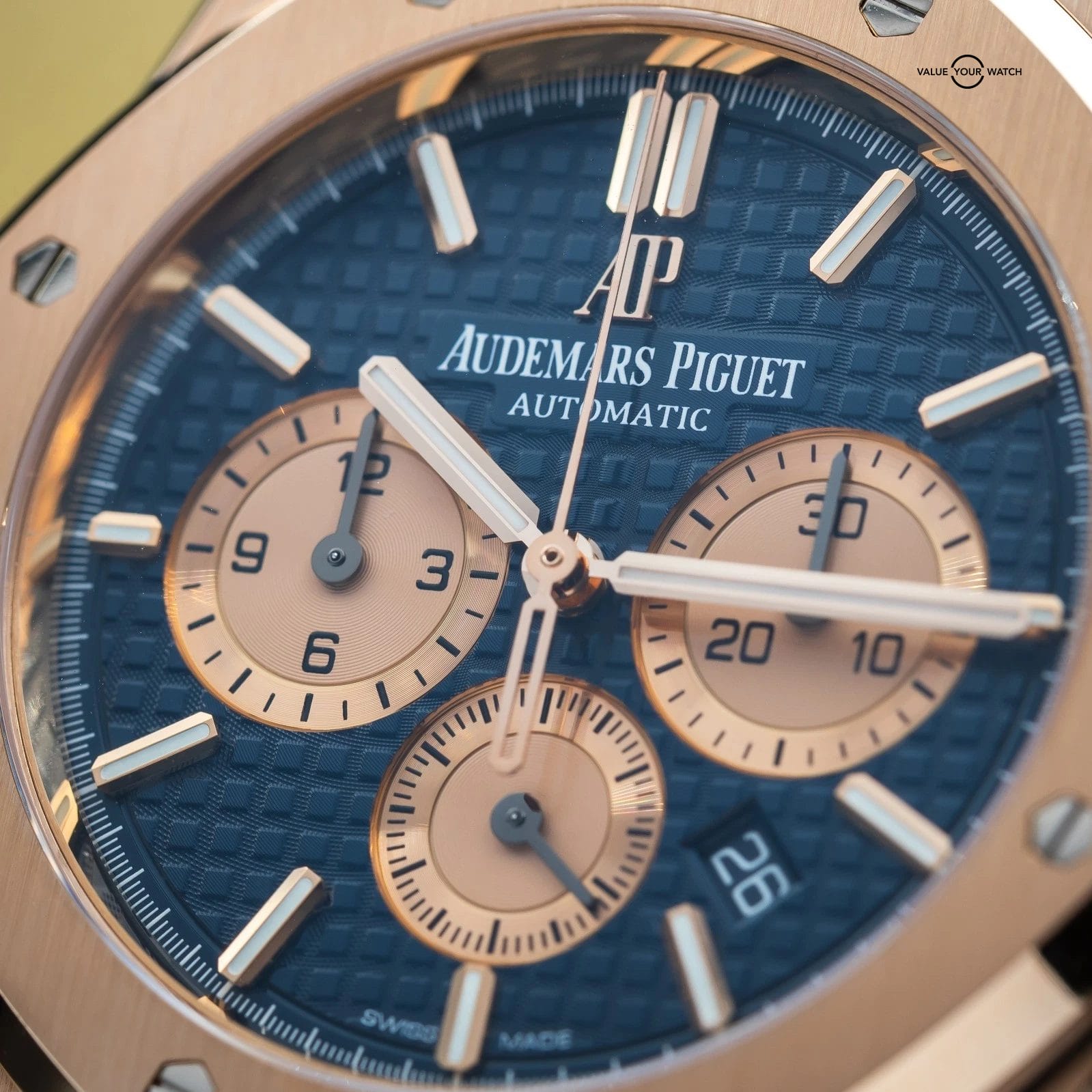 Grail alert! Up for sale or trade is the Royal Oak Chronograph with the highly desirable blue dial against exquisite rose gold. You won’t see many of these! It’s housed in an insanely finished 18-carat gold case and matching bracelet finished to the highest quality AP knows how to do. This piece comes on a factory AP bracelet with all the links, as well as the blue leather strap, rose gold deployant clasp, and with gold mounts/plots to be able to mount the strap to the watch. This gives you the ability to mix and match the look to your liking.