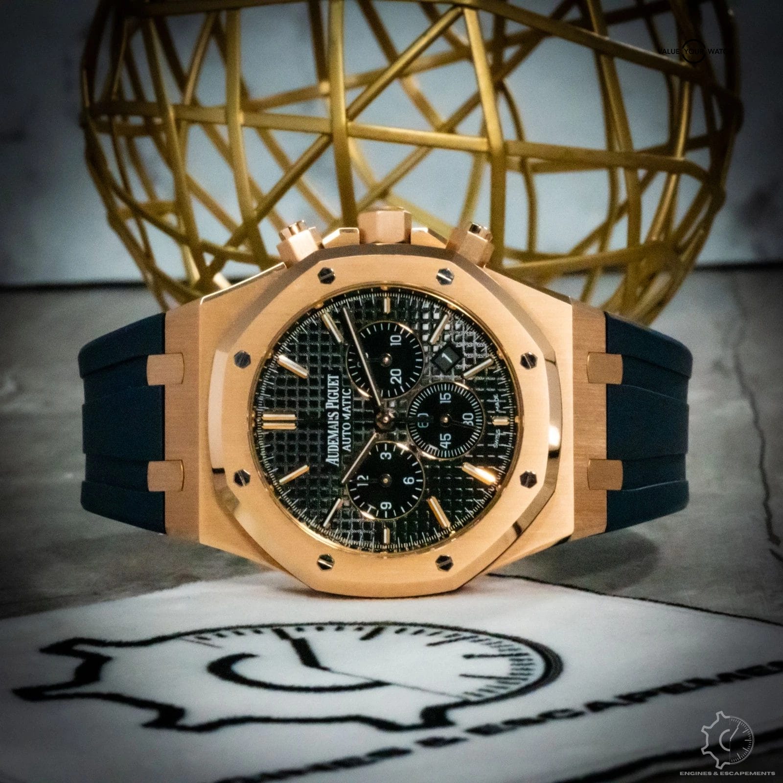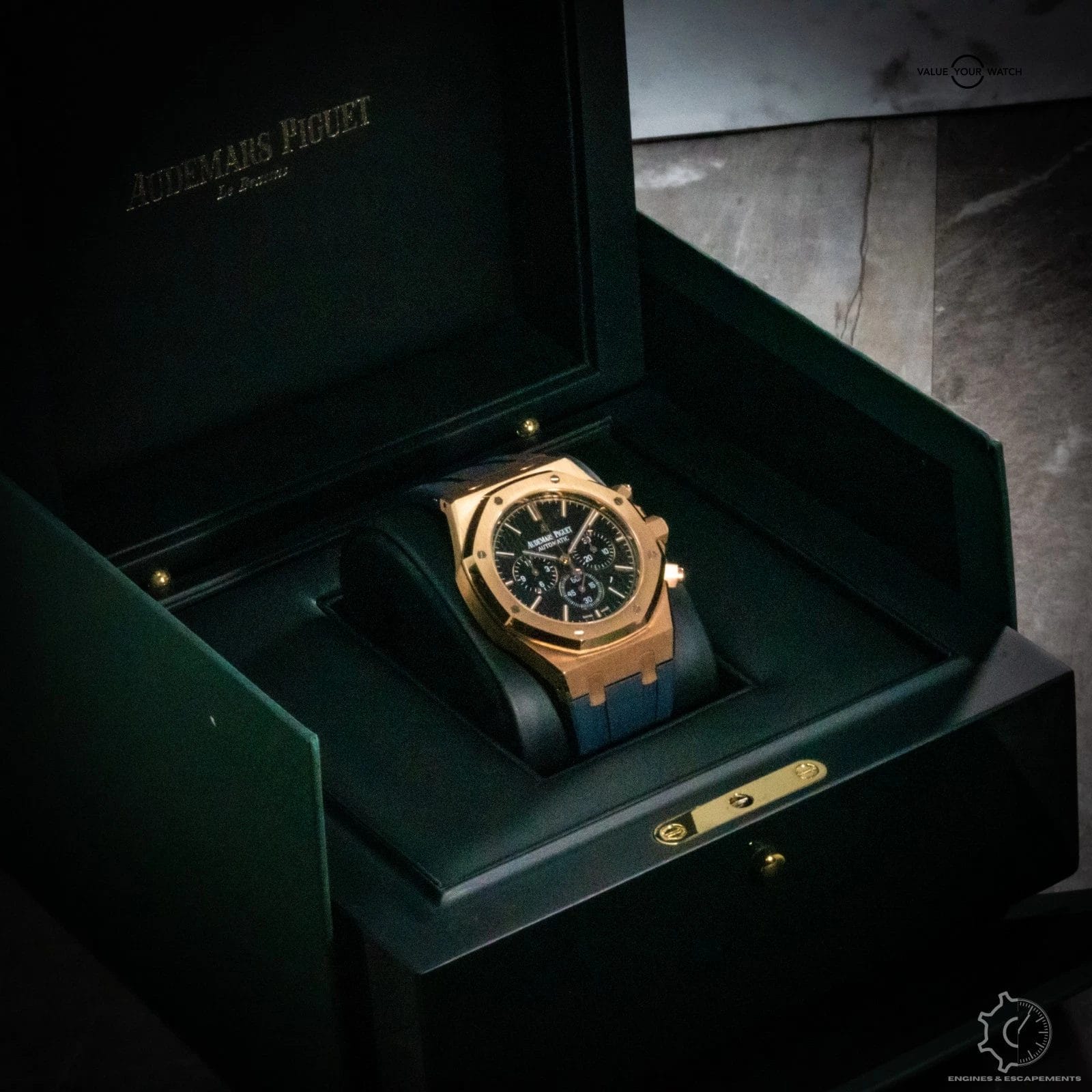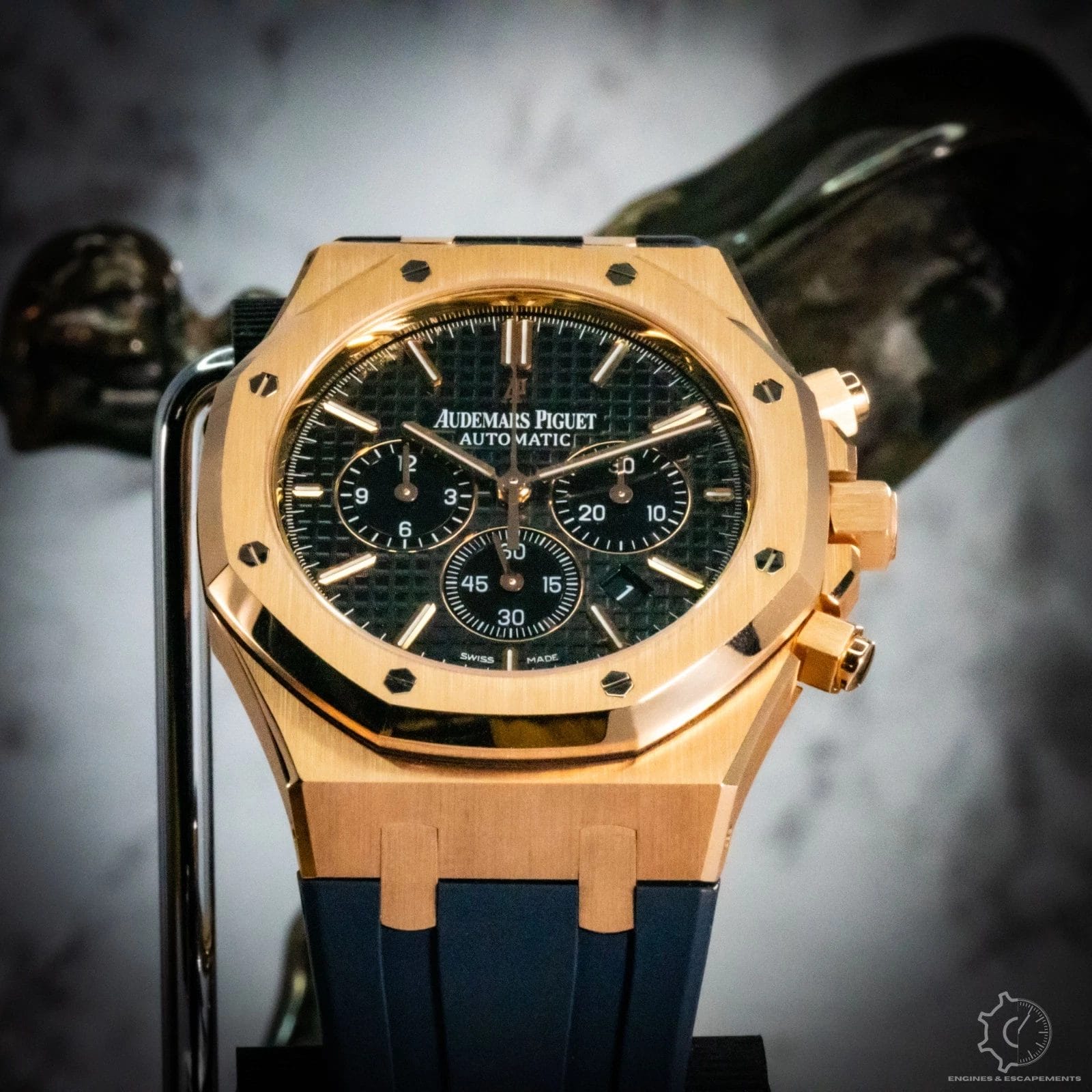 The black “Grande Tapisserie” dial perfectly complements the gold case, with contrasting subdials and applied hour markers creating a balanced, powerful aesthetic. Inside beats AP’s self-winding Caliber 2385, a proven movement celebrated for its precision and reliability.