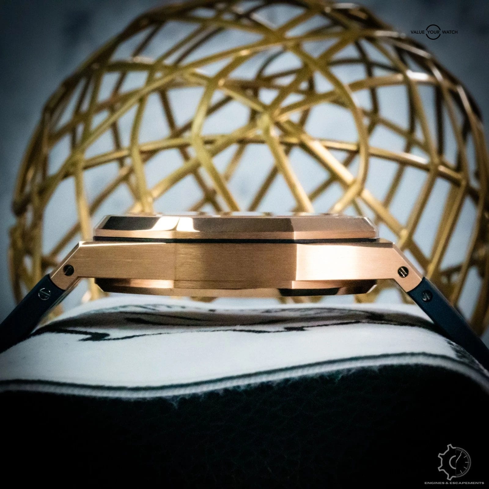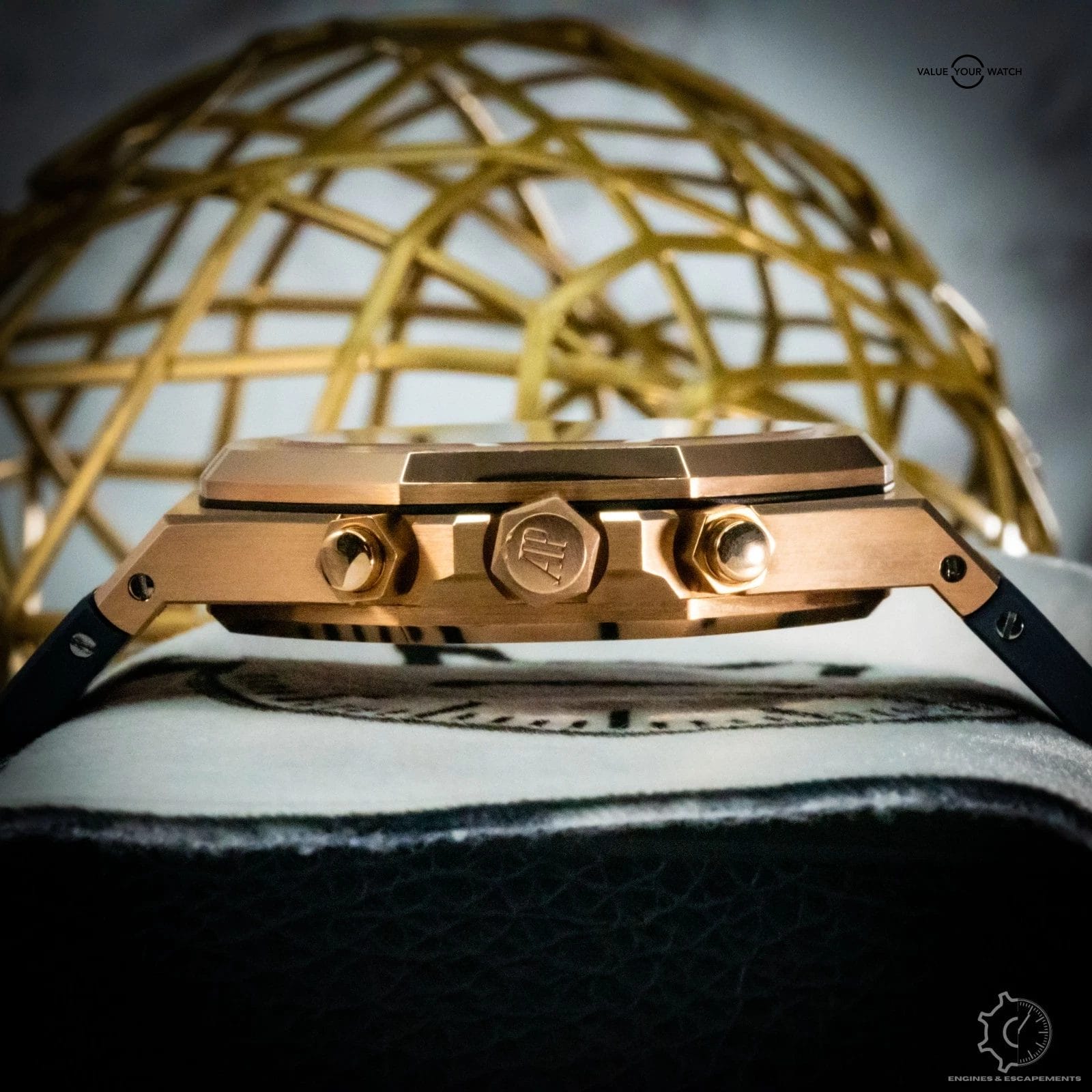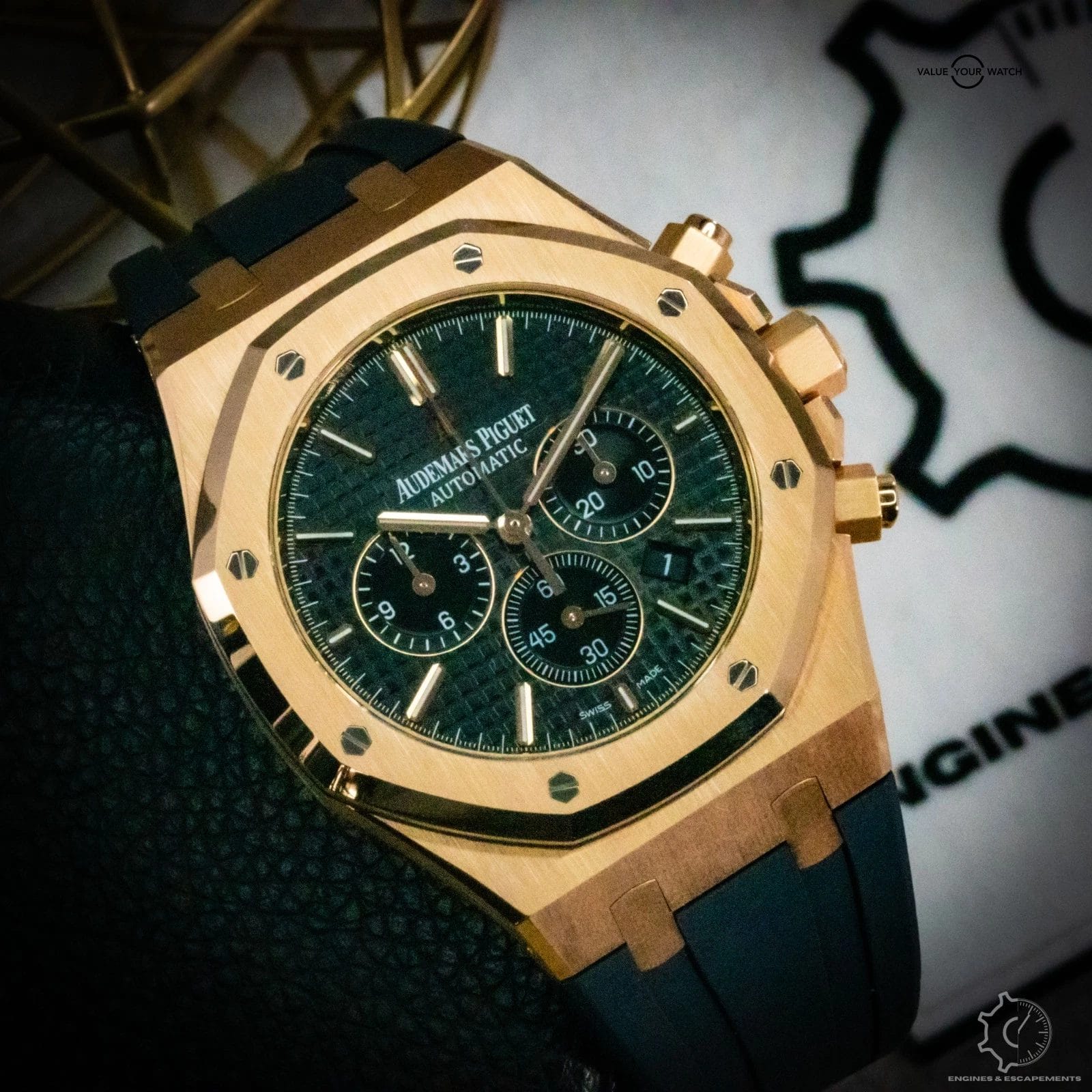 The black “Grande Tapisserie” dial perfectly complements the gold case, with contrasting subdials and applied hour markers creating a balanced, powerful aesthetic. Inside beats AP’s self-winding Caliber 2385, a proven movement celebrated for its precision and reliability.