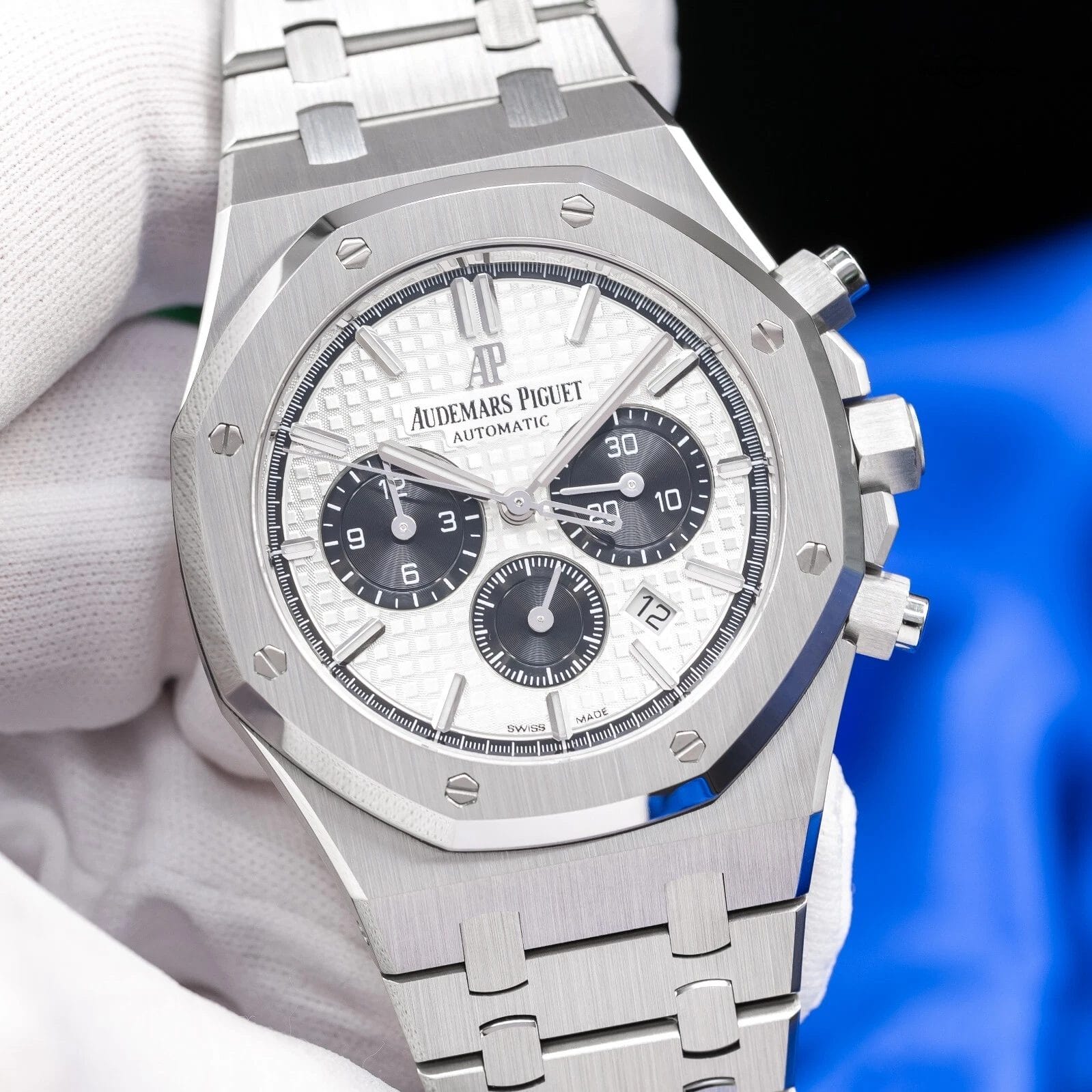 The Audemars Piguet Royal Oak Chronograph 26331ST.OO.1220ST.03 captures everything collectors love about the Royal Oak — angular lines, integrated bracelet, and a dial that speaks volumes. The crisp silver “Grande Tapisserie” dial is paired with bold black sub-dials, delivering a timeless panda aesthetic that’s both sporty and sophisticated. With its 41mm stainless steel case and signature octagonal bezel, this watch offers everyday wearability with unmistakable presence.