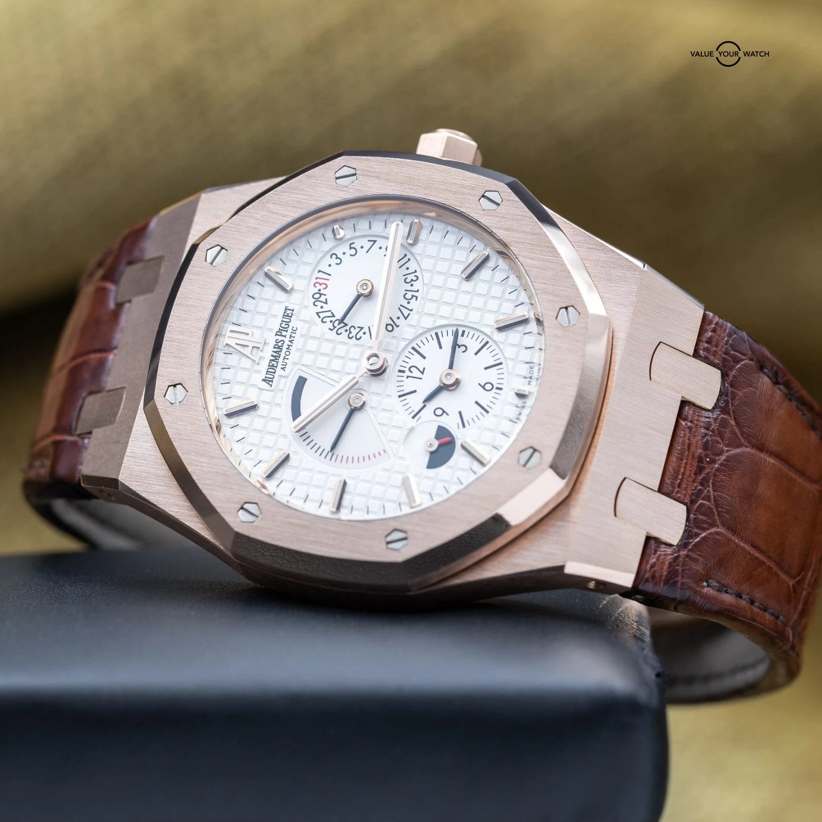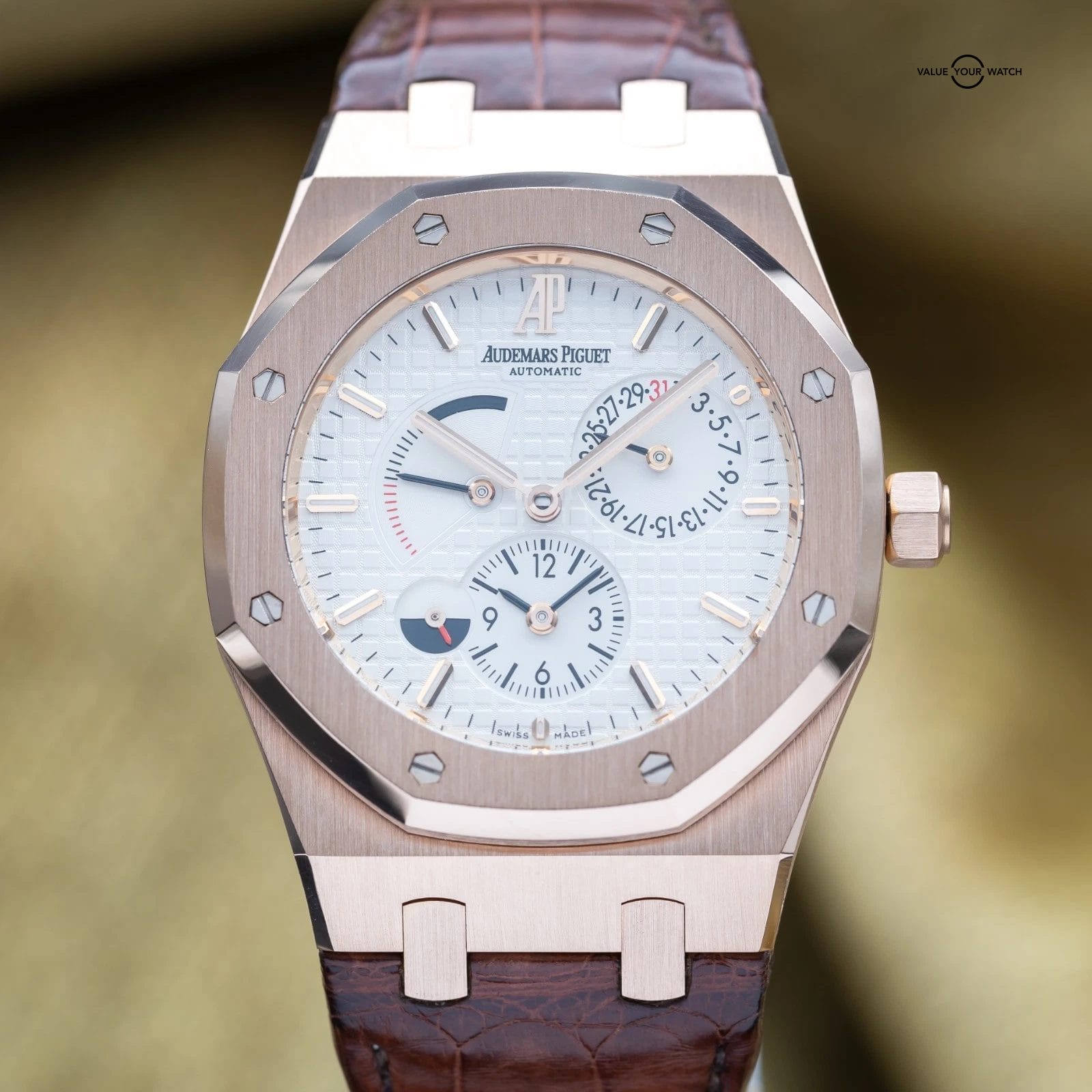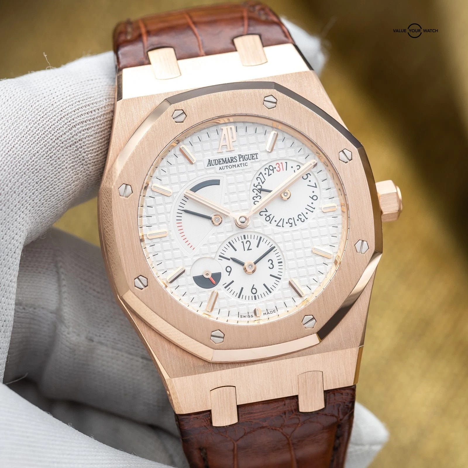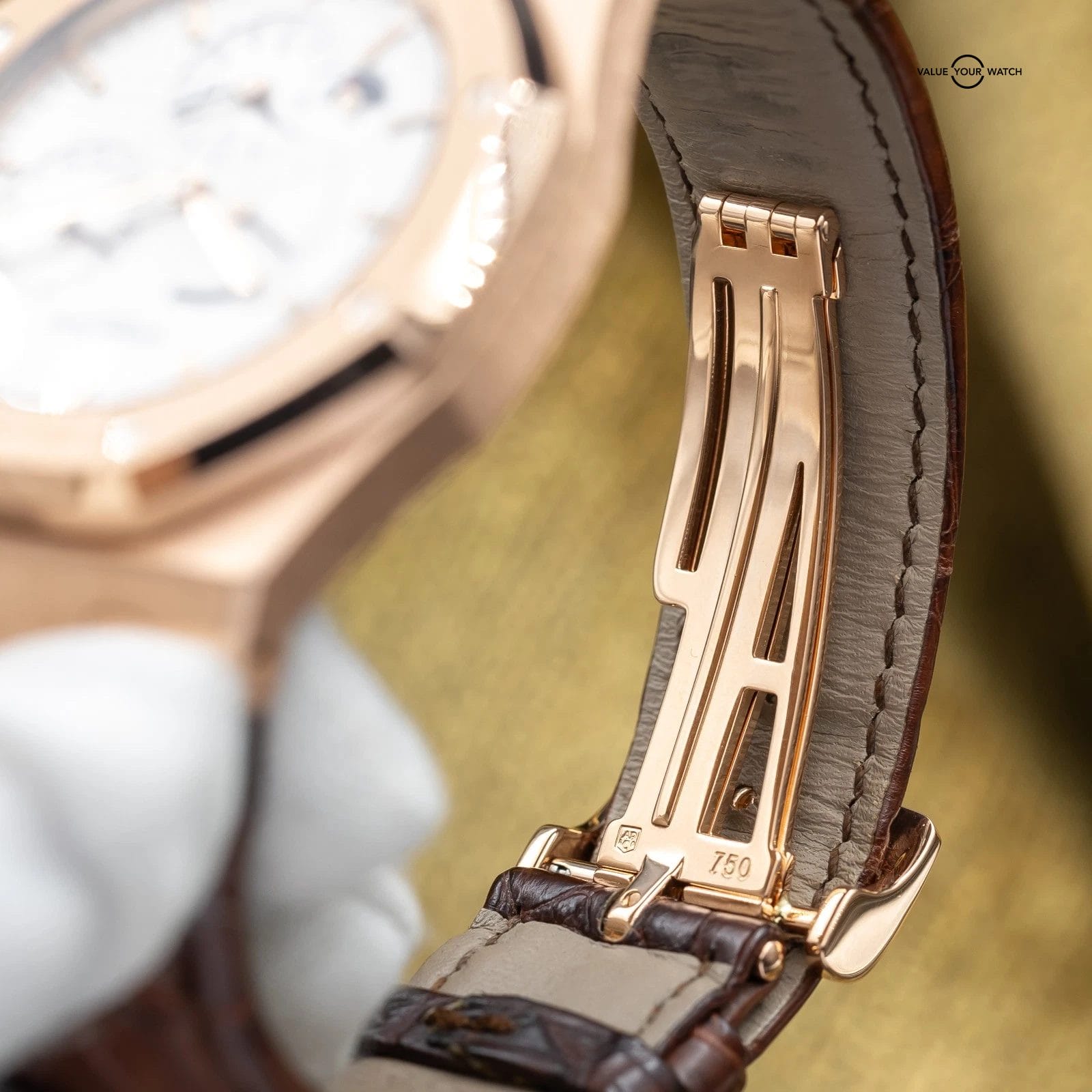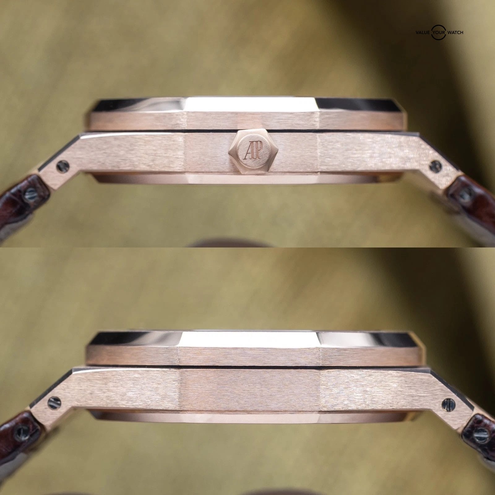 The AP Royal Oak 26120OR is an elegant iteration of one of the most iconic sports watches ever made. It keeps that signature octagonal bezel with the little exposed screws, but it’s done in 18k rose gold, which gives it a warm, classy glow instead of the usual steel vibe. It’s housed in a refined 39 mm case, so it sits perfectly on the wrist. The white dial features the hallmark “Grande Tapisserie” pattern, offering depth and texture that plays beautifully with light. Instead of the usual steel bracelet, this one comes on a brown leather strap, which makes it lean more toward a luxury/dressy vibe while still being very much a Royal Oak at heart. A blend of sport and elegance, this one is equally suited to formal occasions or sophisticated everyday wear.