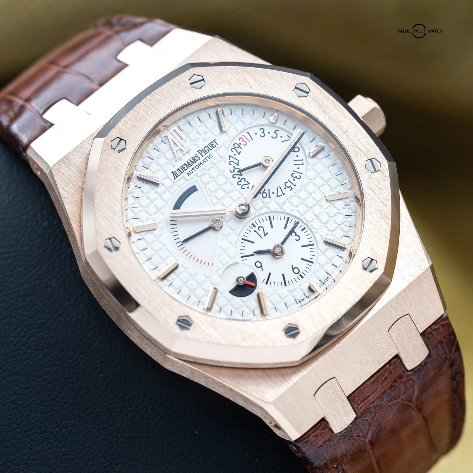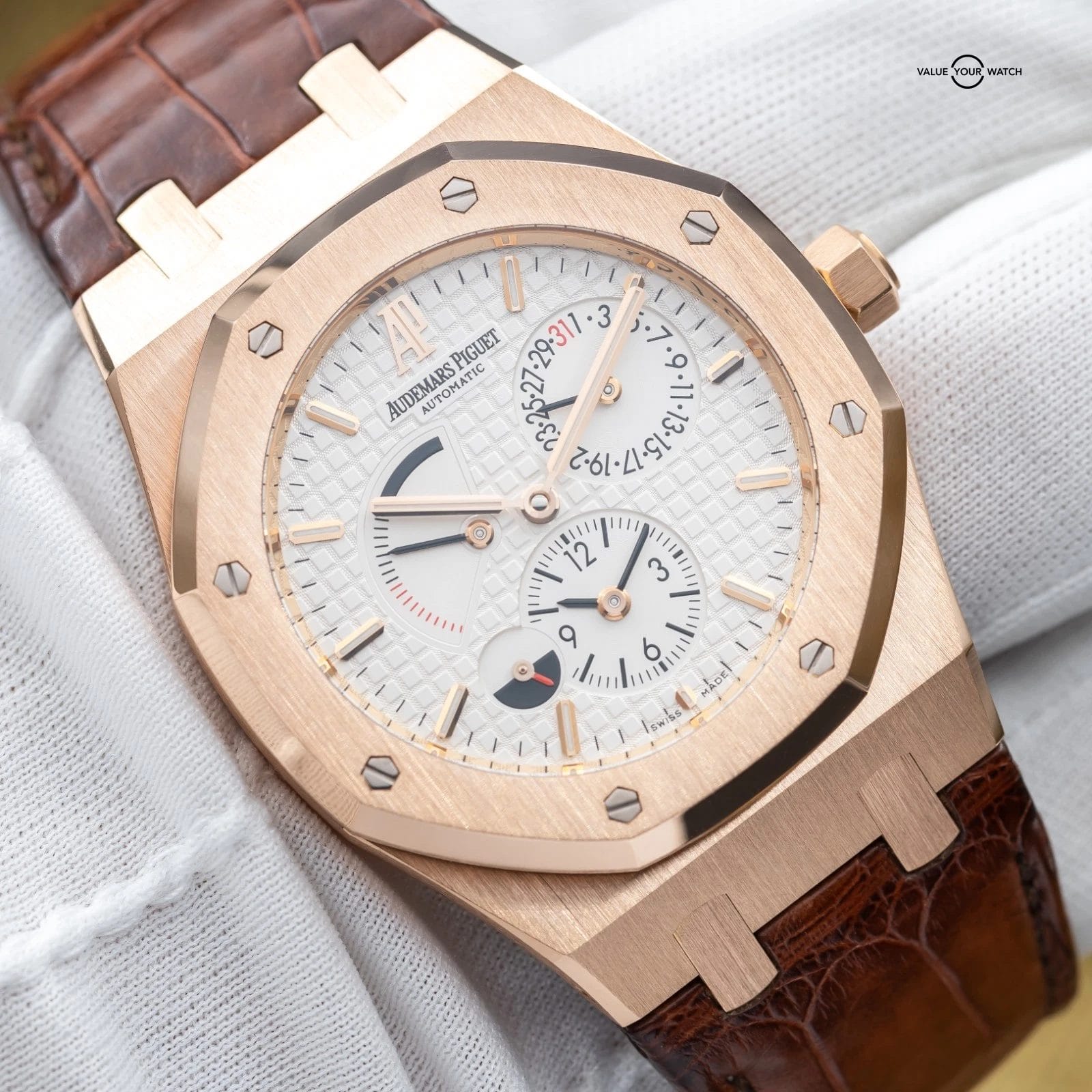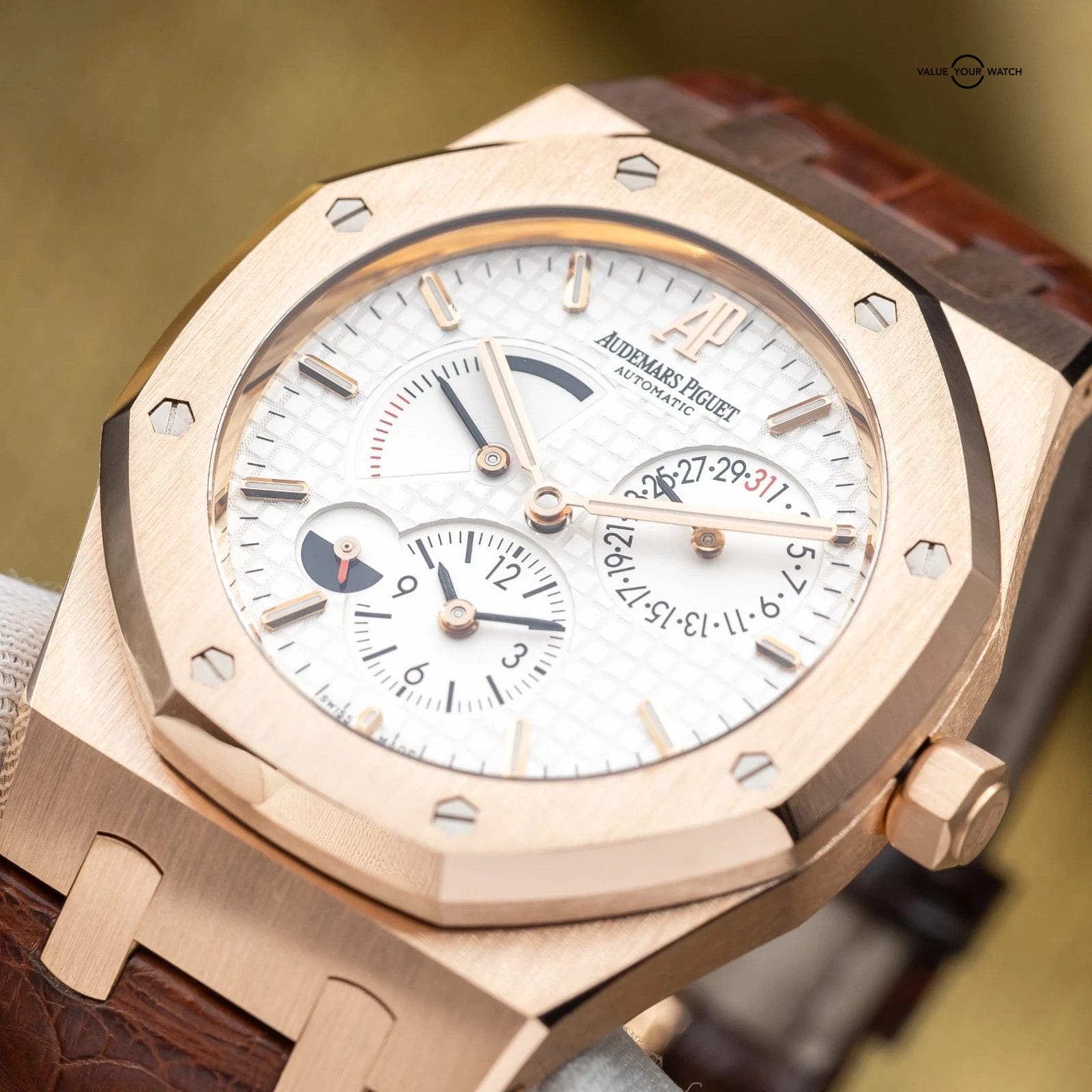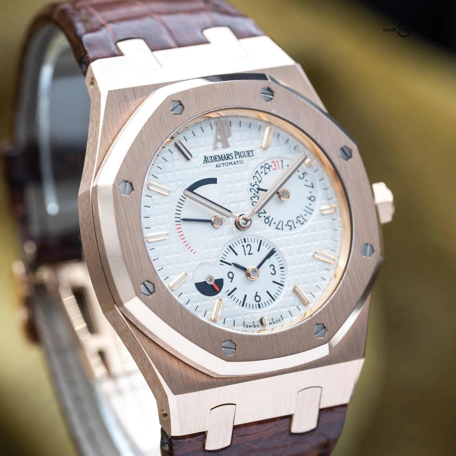 The AP Royal Oak 26120OR is an elegant iteration of one of the most iconic sports watches ever made. It keeps that signature octagonal bezel with the little exposed screws, but it’s done in 18k rose gold, which gives it a warm, classy glow instead of the usual steel vibe. It’s housed in a refined 39 mm case, so it sits perfectly on the wrist. The white dial features the hallmark “Grande Tapisserie” pattern, offering depth and texture that plays beautifully with light. Instead of the usual steel bracelet, this one comes on a brown leather strap, which makes it lean more toward a luxury/dressy vibe while still being very much a Royal Oak at heart. A blend of sport and elegance, this one is equally suited to formal occasions or sophisticated everyday wear.