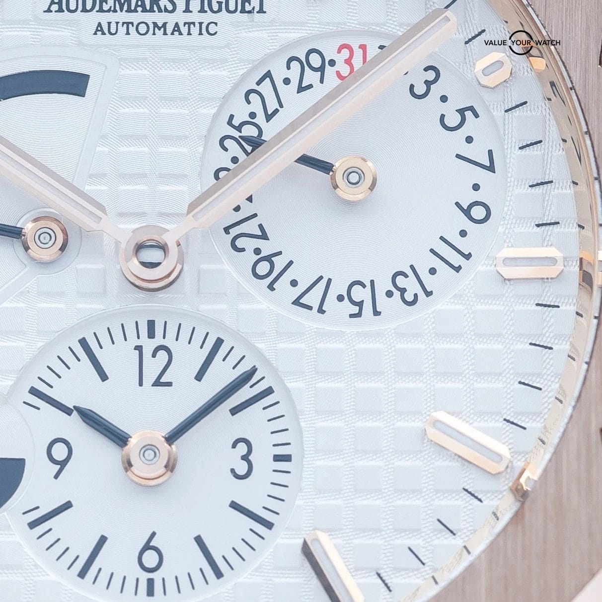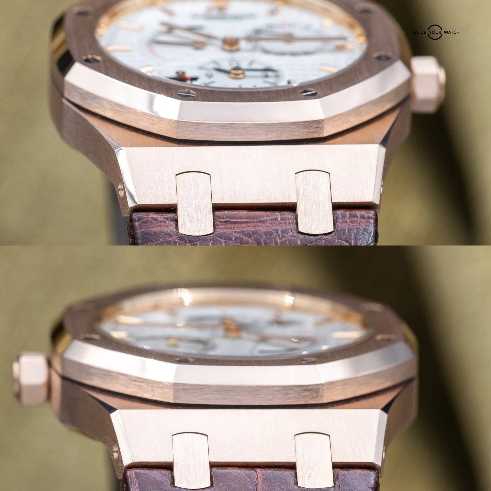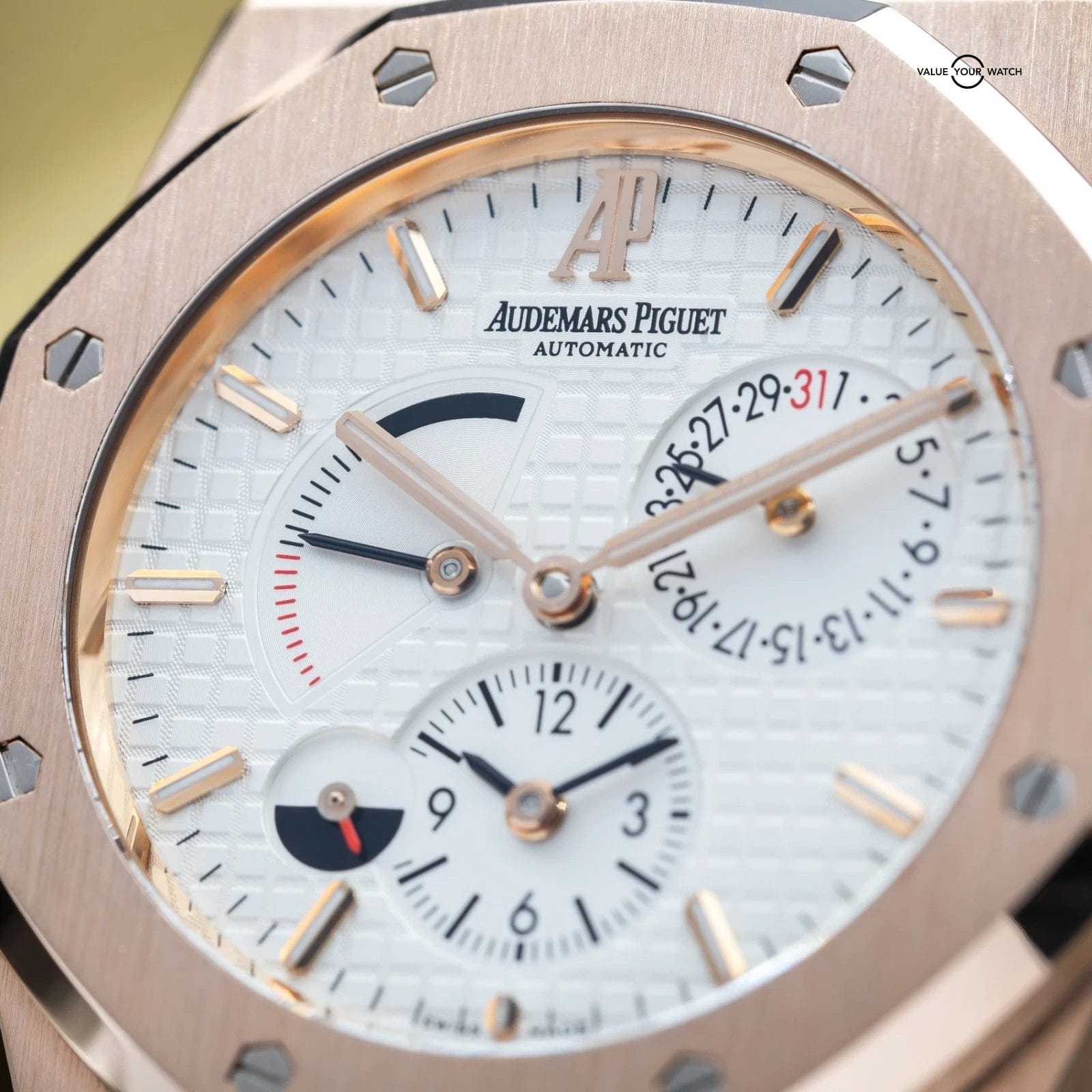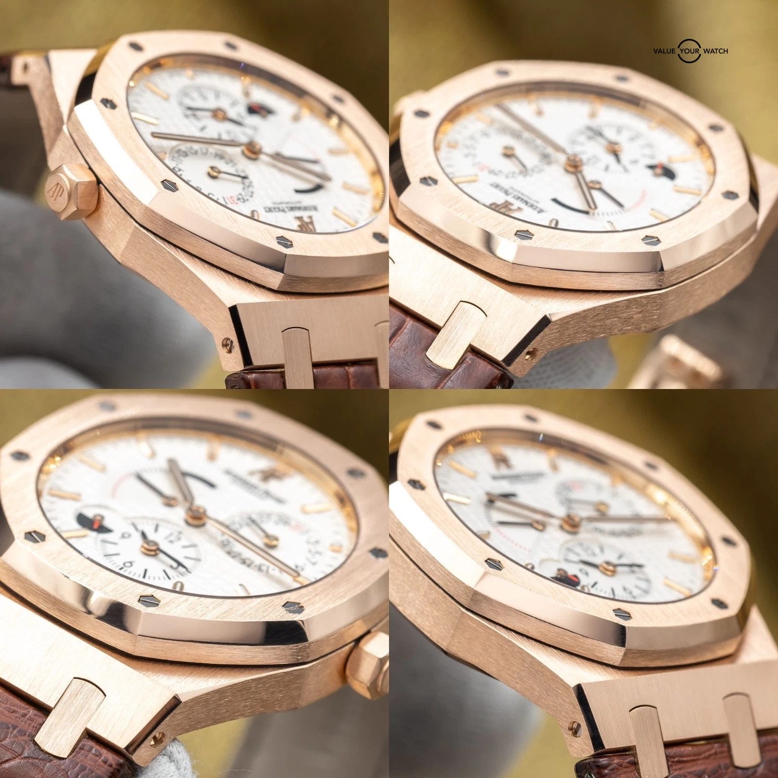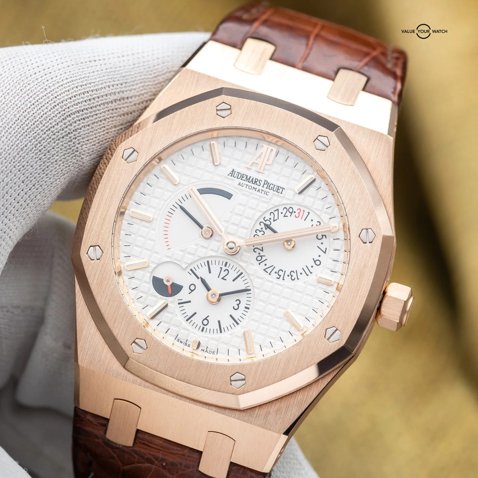 The AP Royal Oak 26120OR is an elegant iteration of one of the most iconic sports watches ever made. It keeps that signature octagonal bezel with the little exposed screws, but it’s done in 18k rose gold, which gives it a warm, classy glow instead of the usual steel vibe. It’s housed in a refined 39 mm case, so it sits perfectly on the wrist. The white dial features the hallmark “Grande Tapisserie” pattern, offering depth and texture that plays beautifully with light. Instead of the usual steel bracelet, this one comes on a brown leather strap, which makes it lean more toward a luxury/dressy vibe while still being very much a Royal Oak at heart. A blend of sport and elegance, this one is equally suited to formal occasions or sophisticated everyday wear.