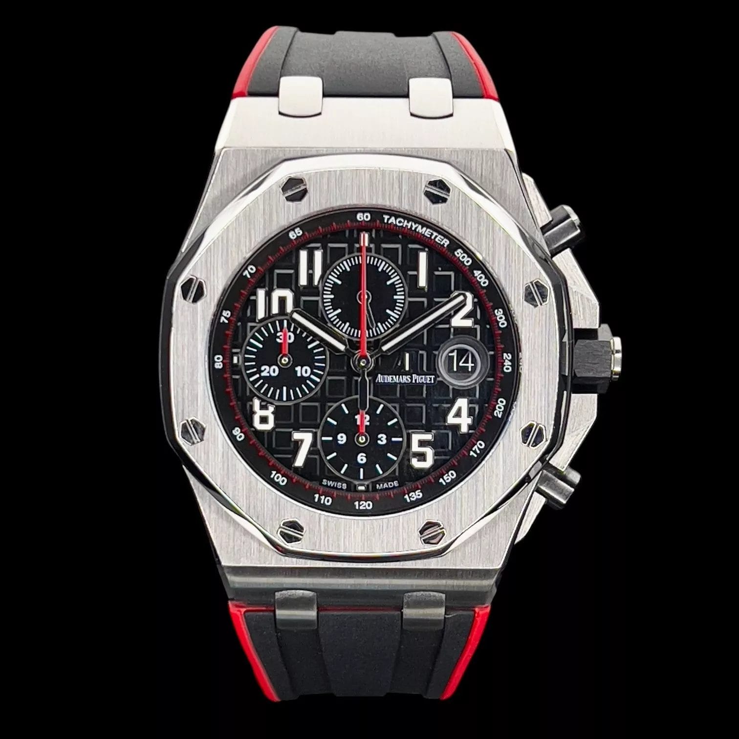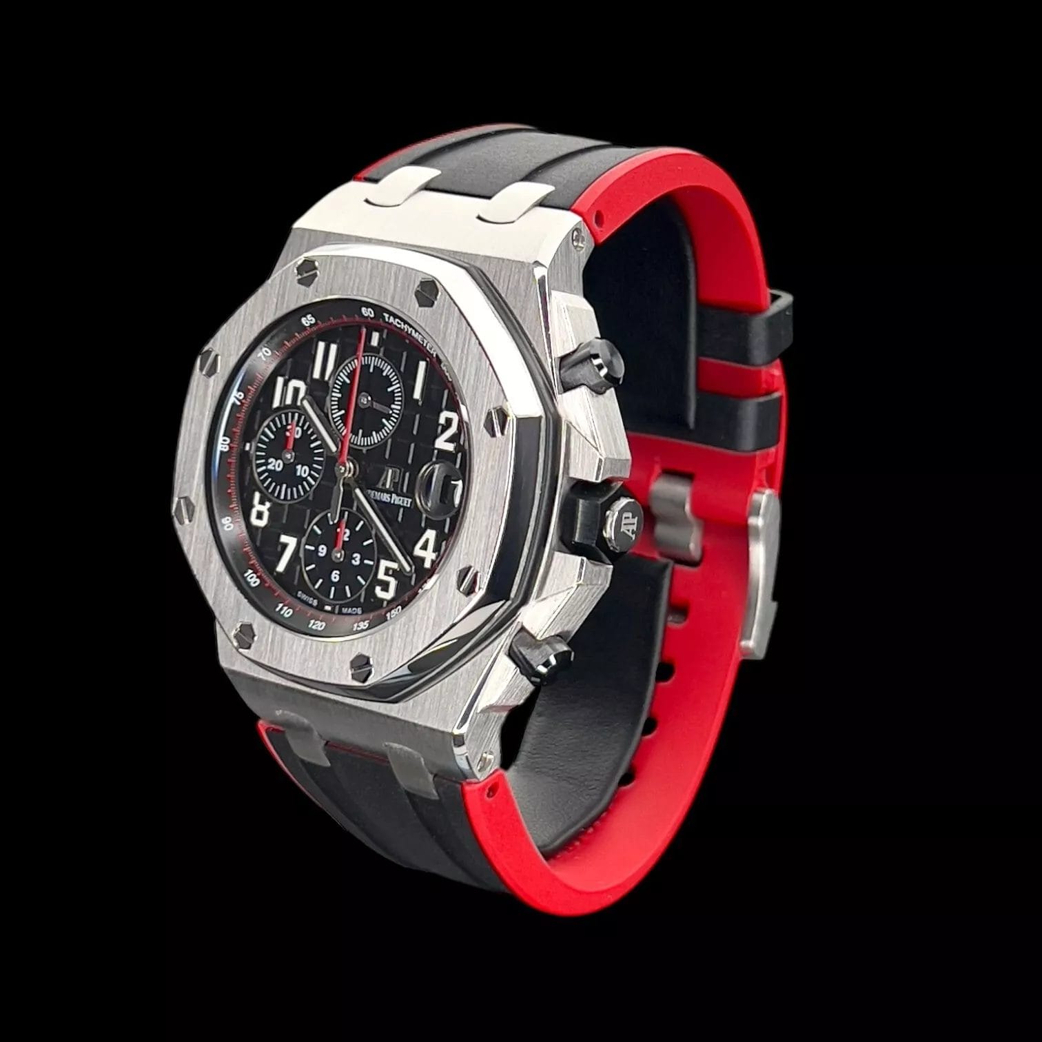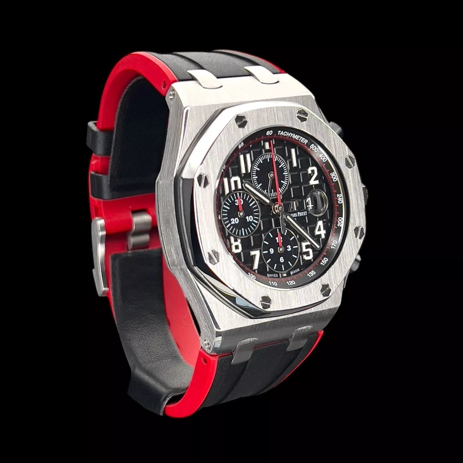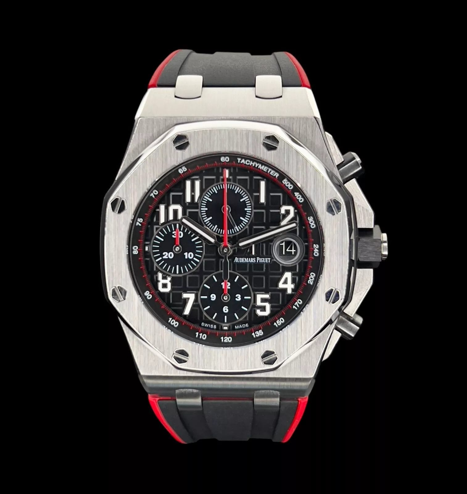 The Audemars Piguet Royal Oak Offshore Chronograph 26470ST otherwise known as “The Vampire” showcases a 42mm steel case, complemented by a matching iconic fixed bezel with the signature exposed screws. Its black dial is bordered by a striking red tachymeter scale and accents, earning it the “Vampire” nickname. The dial features the iconic “Méga Tapisserie” texture, with bold luminous Arabic numerals and hands for enhanced readability in low-light conditions. It also includes three subdials at 6, 9, and 12 o’clock, along with a date window at 3 o’clock for added practicality. Completing the look is a brand new red and black rubber strap, secured by a steel buckle.