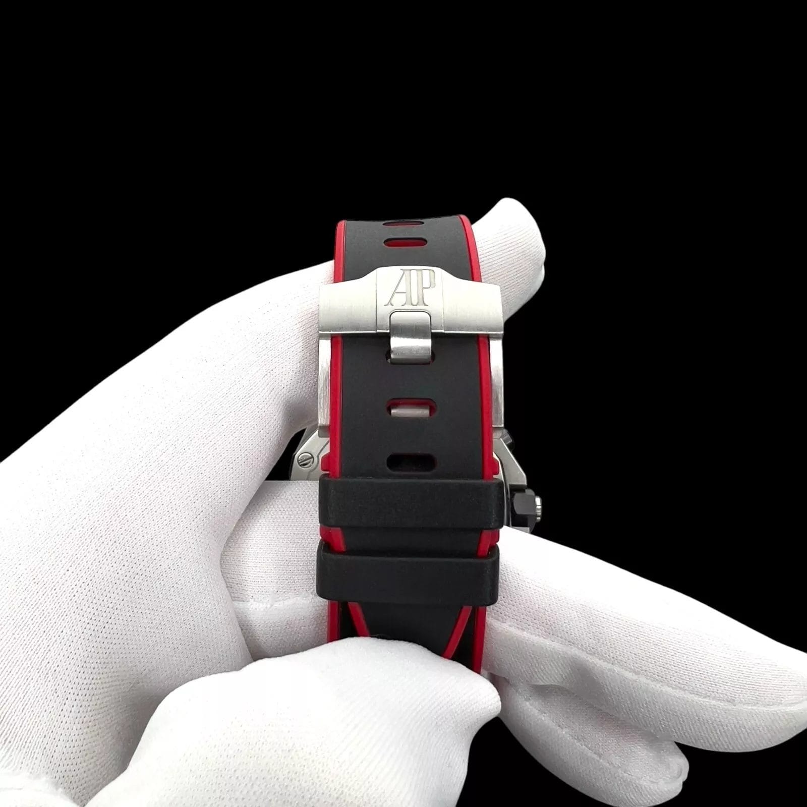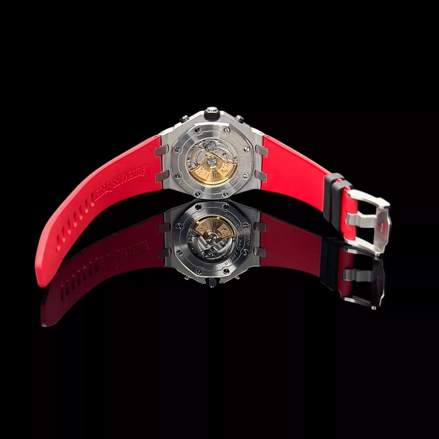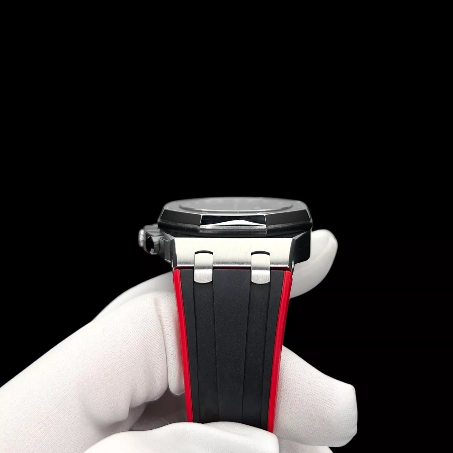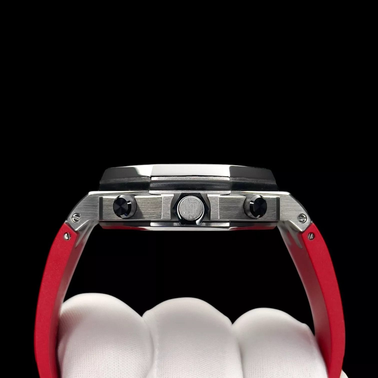 The Audemars Piguet Royal Oak Offshore Chronograph 26470ST otherwise known as “The Vampire” showcases a 42mm steel case, complemented by a matching iconic fixed bezel with the signature exposed screws. Its black dial is bordered by a striking red tachymeter scale and accents, earning it the “Vampire” nickname. The dial features the iconic “Méga Tapisserie” texture, with bold luminous Arabic numerals and hands for enhanced readability in low-light conditions. It also includes three subdials at 6, 9, and 12 o’clock, along with a date window at 3 o’clock for added practicality. Completing the look is a brand new red and black rubber strap, secured by a steel buckle.