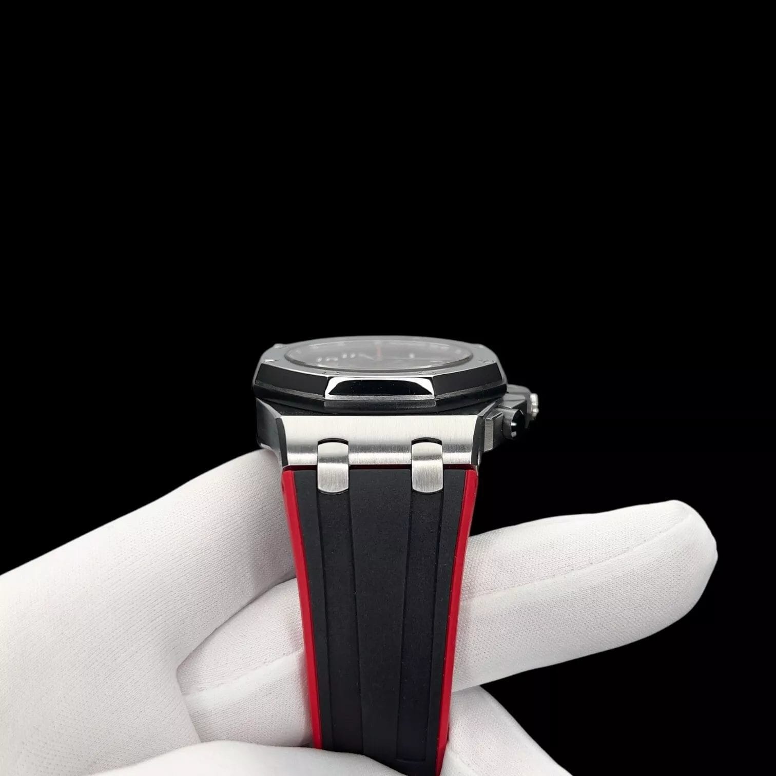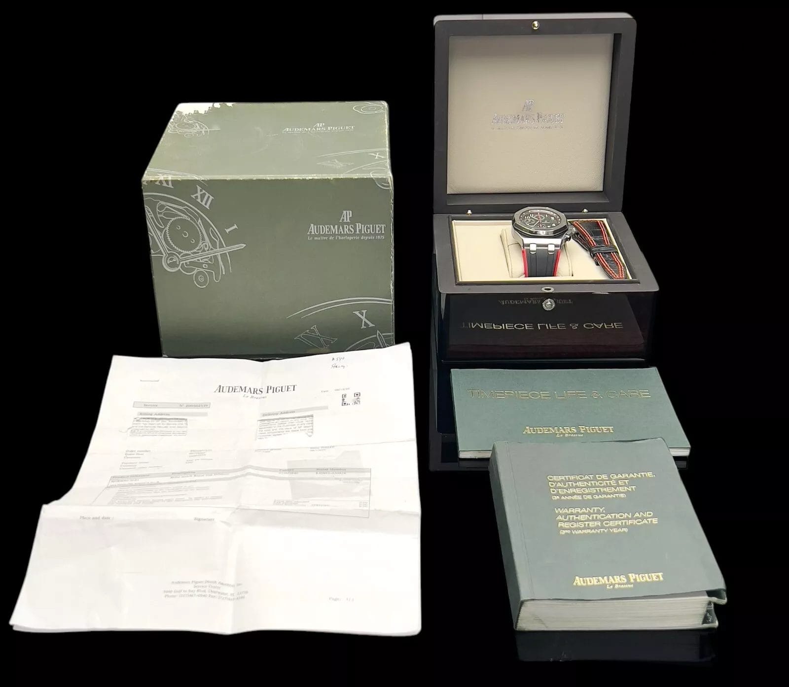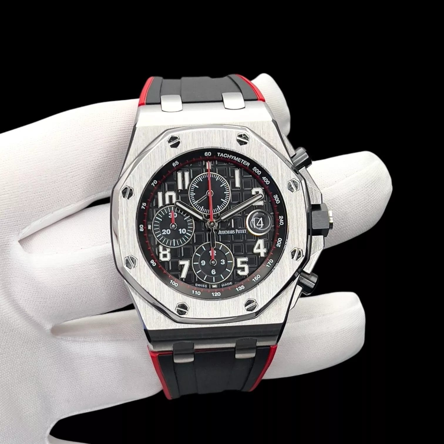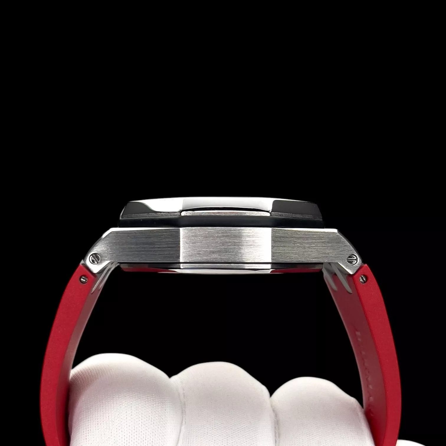 The Audemars Piguet Royal Oak Offshore Chronograph 26470ST otherwise known as “The Vampire” showcases a 42mm steel case, complemented by a matching iconic fixed bezel with the signature exposed screws. Its black dial is bordered by a striking red tachymeter scale and accents, earning it the “Vampire” nickname. The dial features the iconic “Méga Tapisserie” texture, with bold luminous Arabic numerals and hands for enhanced readability in low-light conditions. It also includes three subdials at 6, 9, and 12 o’clock, along with a date window at 3 o’clock for added practicality. Completing the look is a brand new red and black rubber strap, secured by a steel buckle.