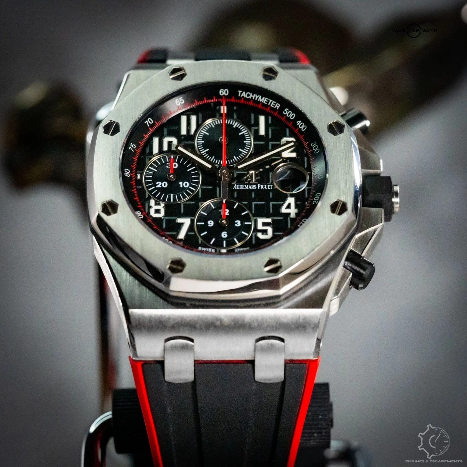 The AP Royal Oak Offshore 26470ST, known in collector circles as the “Vampire,” is a bold and aggressive take on the iconic Royal Oak Offshore. With its 42mm stainless steel case, black ceramic pushers/crown, & signature octagonal silhouette, this watch delivers presence and attitude in equal measure. The black “Méga Tapisserie” dial is accented by blood-red subdial hands and chronograph markings, giving it the sharp, high-contrast look that earned its nickname.