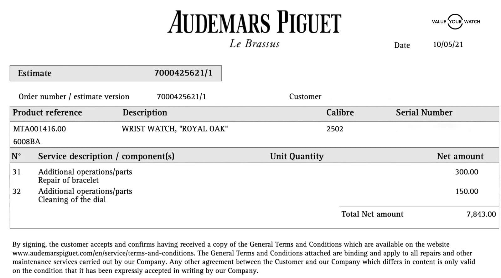 Previous water exposure seen on the dial. Client spared no costs in getting the watch completely serviced and made new from AP. The factory champagne, diamond dial is now discontinued and in vintage archives. Copy of service papers with net amount pictured. Client and serial information has been blurred for privacy.